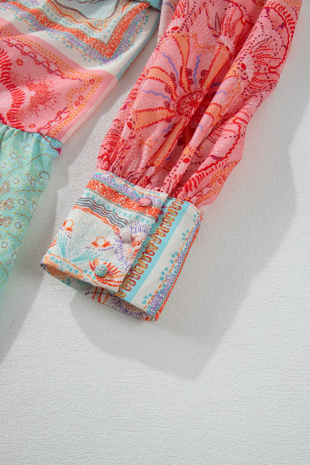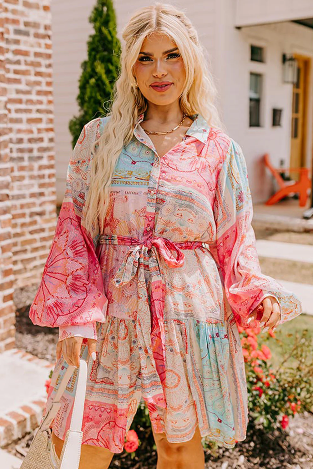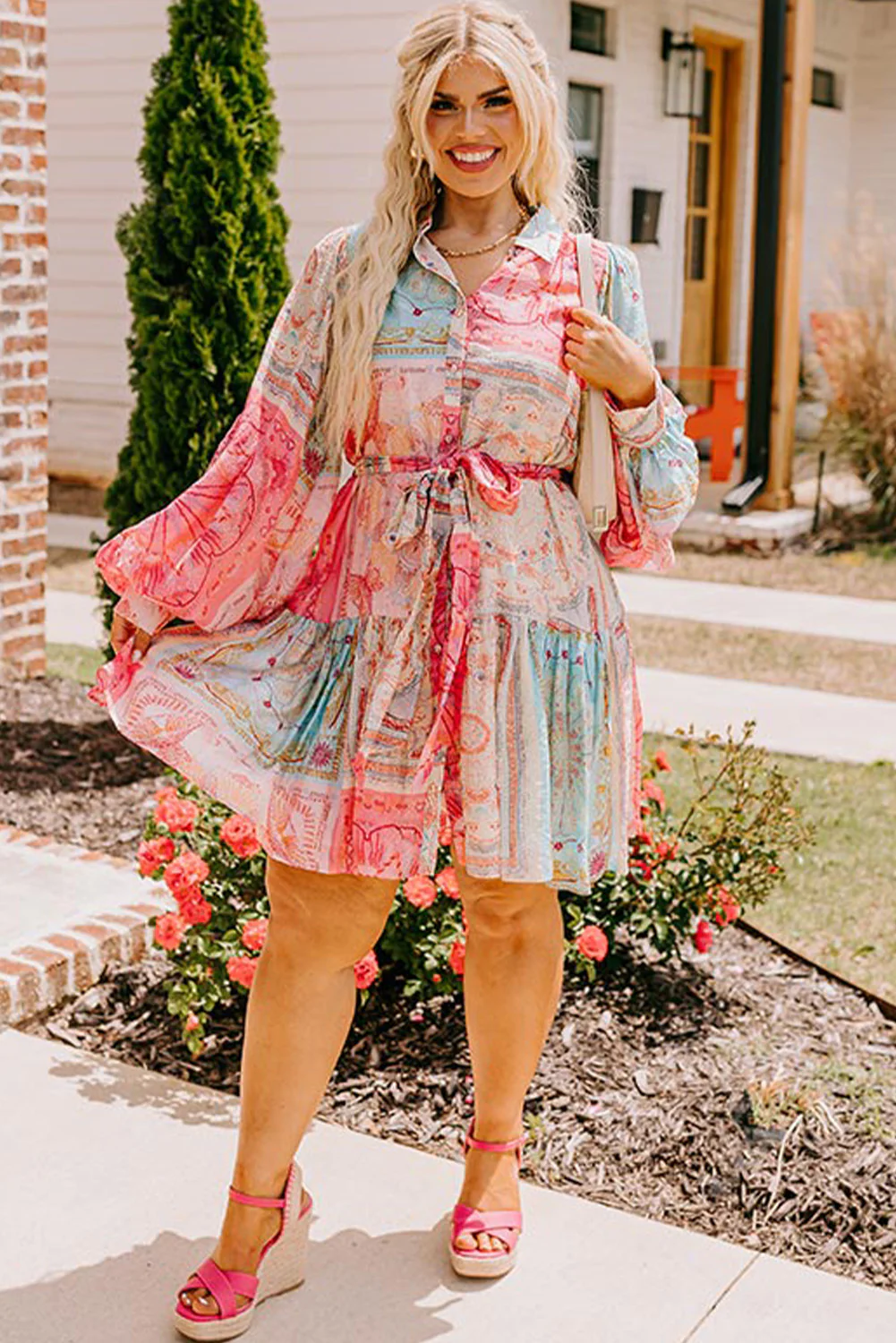 Pink Patchwork Print Bubble Sleeves Belted Plus Size Dress