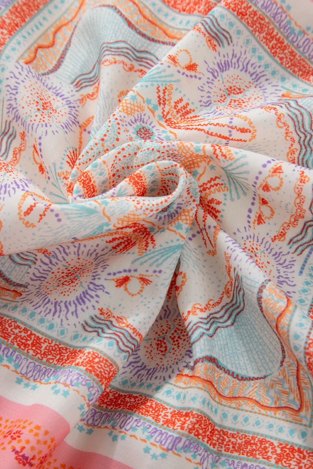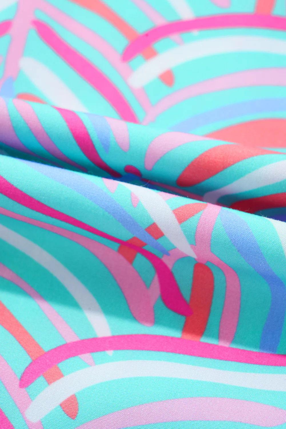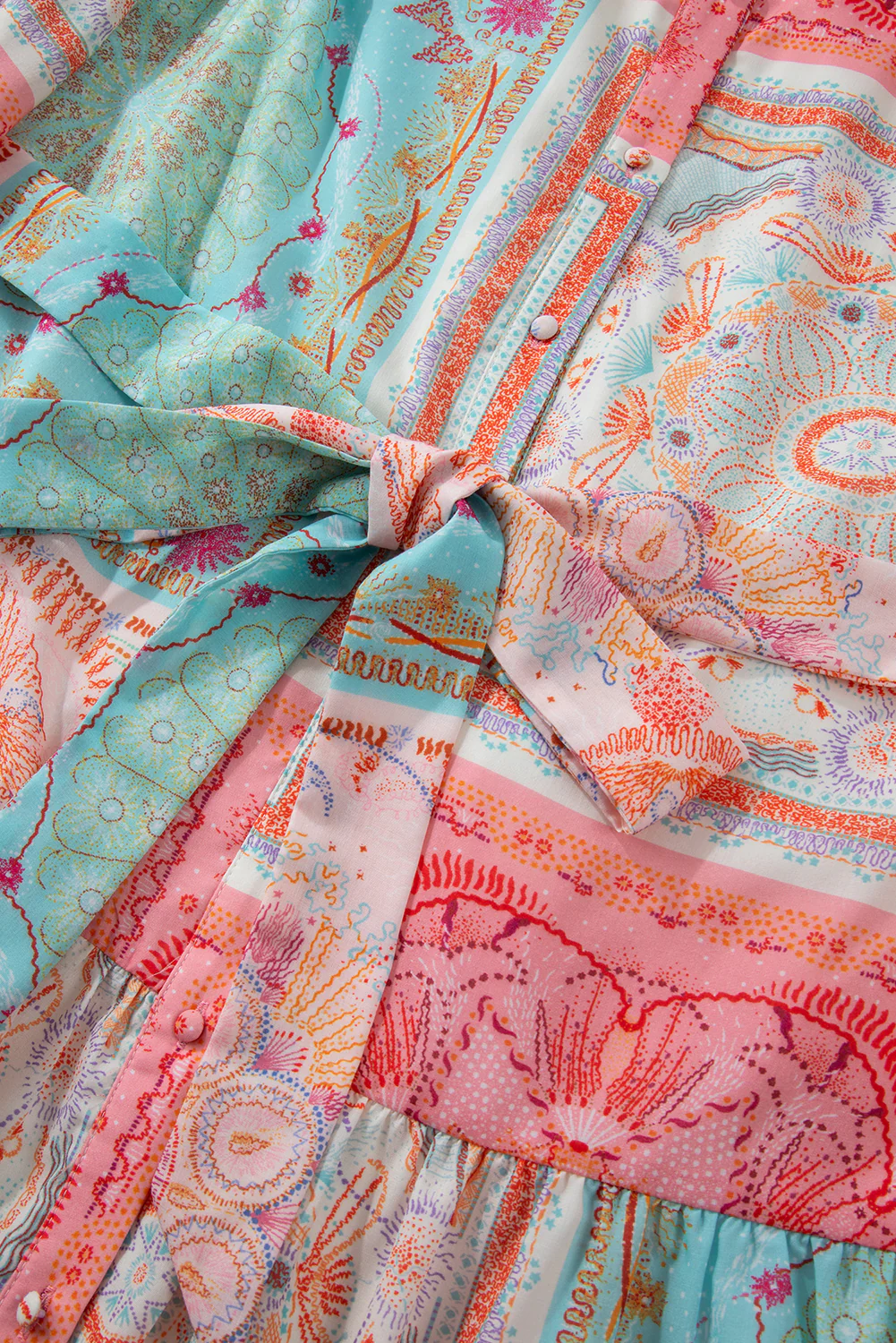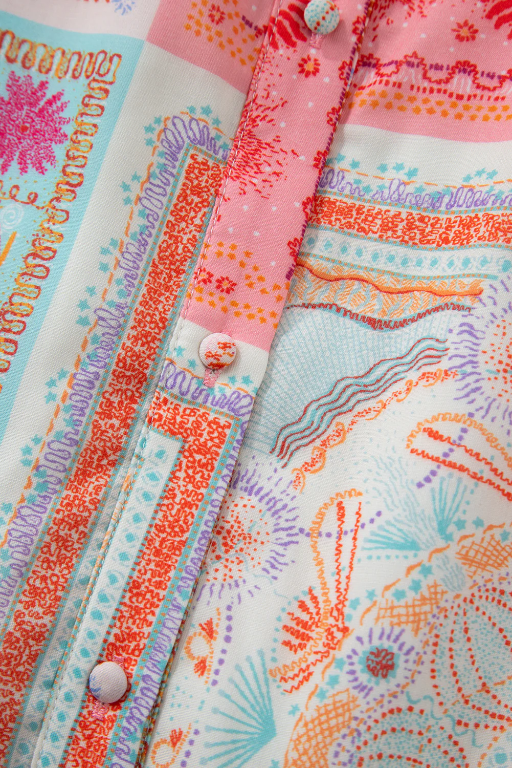 Pink Patchwork Print Bubble Sleeves Belted Plus Size Dress
