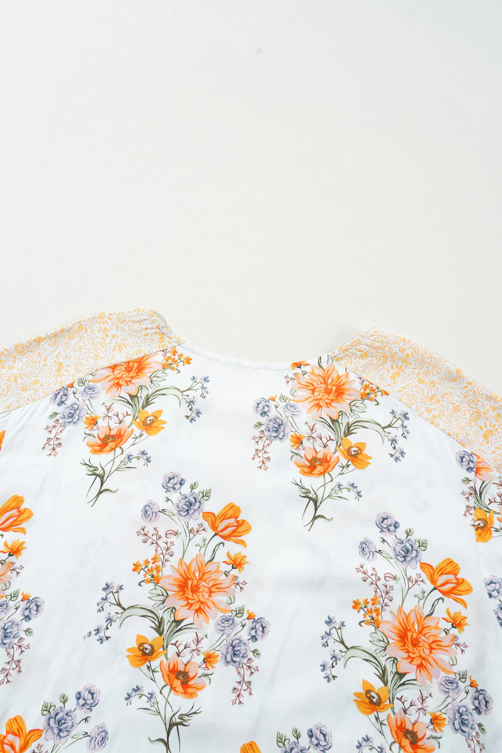 White Plus Size Floral Print V Neck Puff Sleeve Blouse