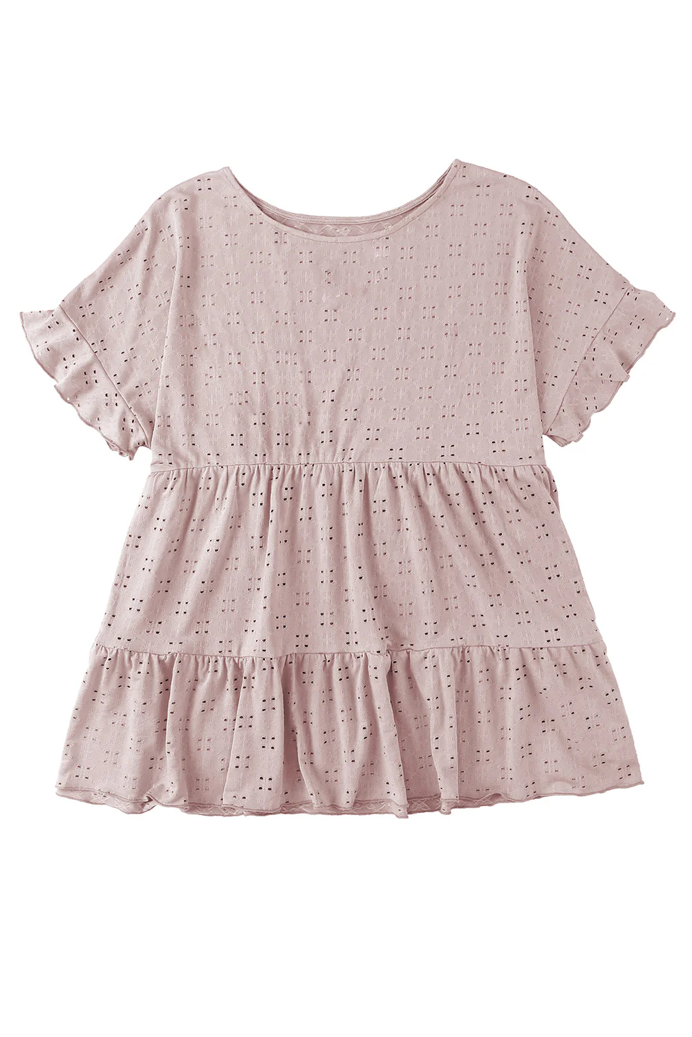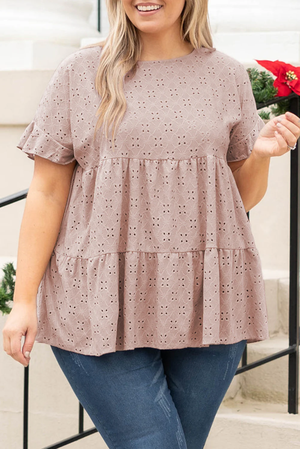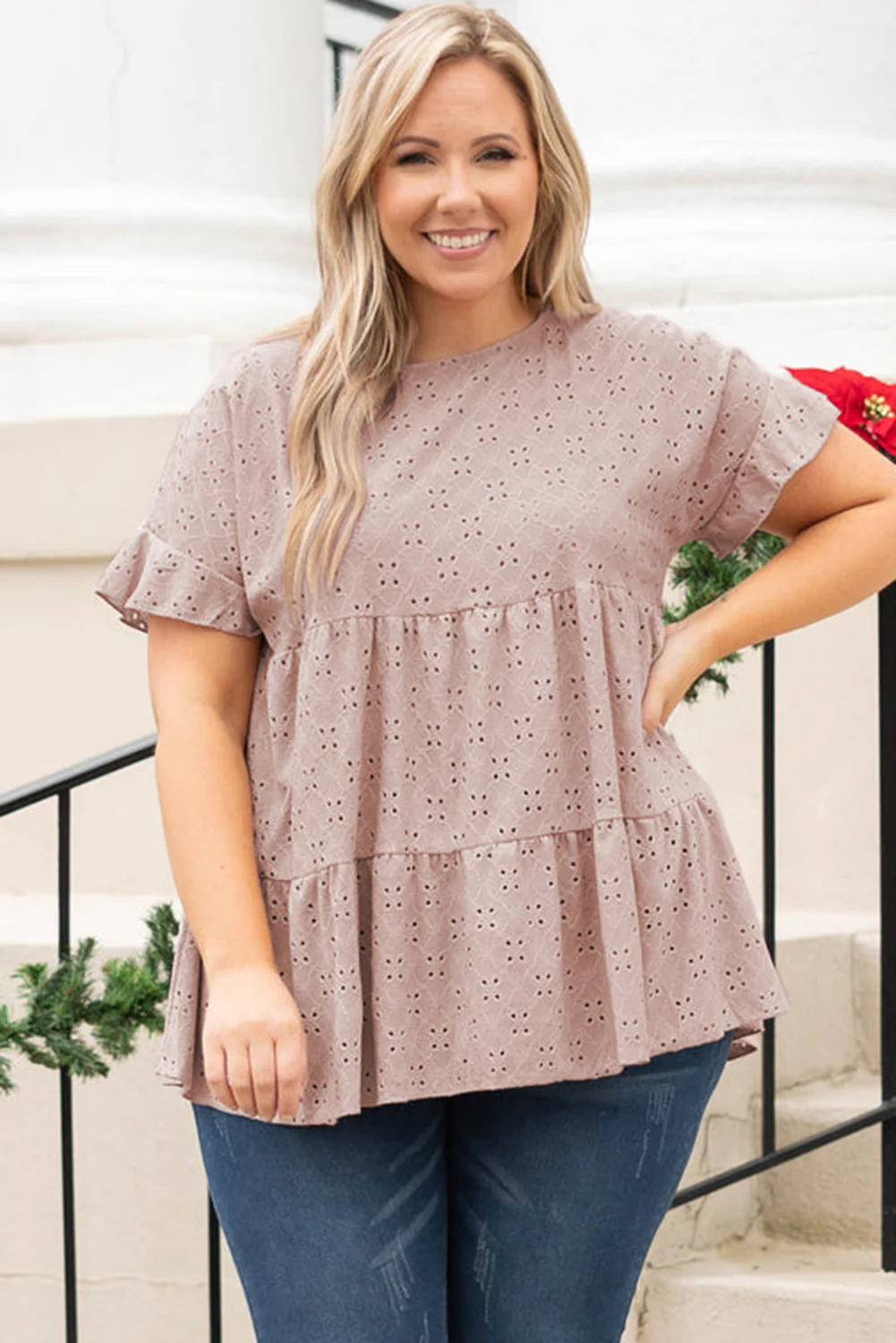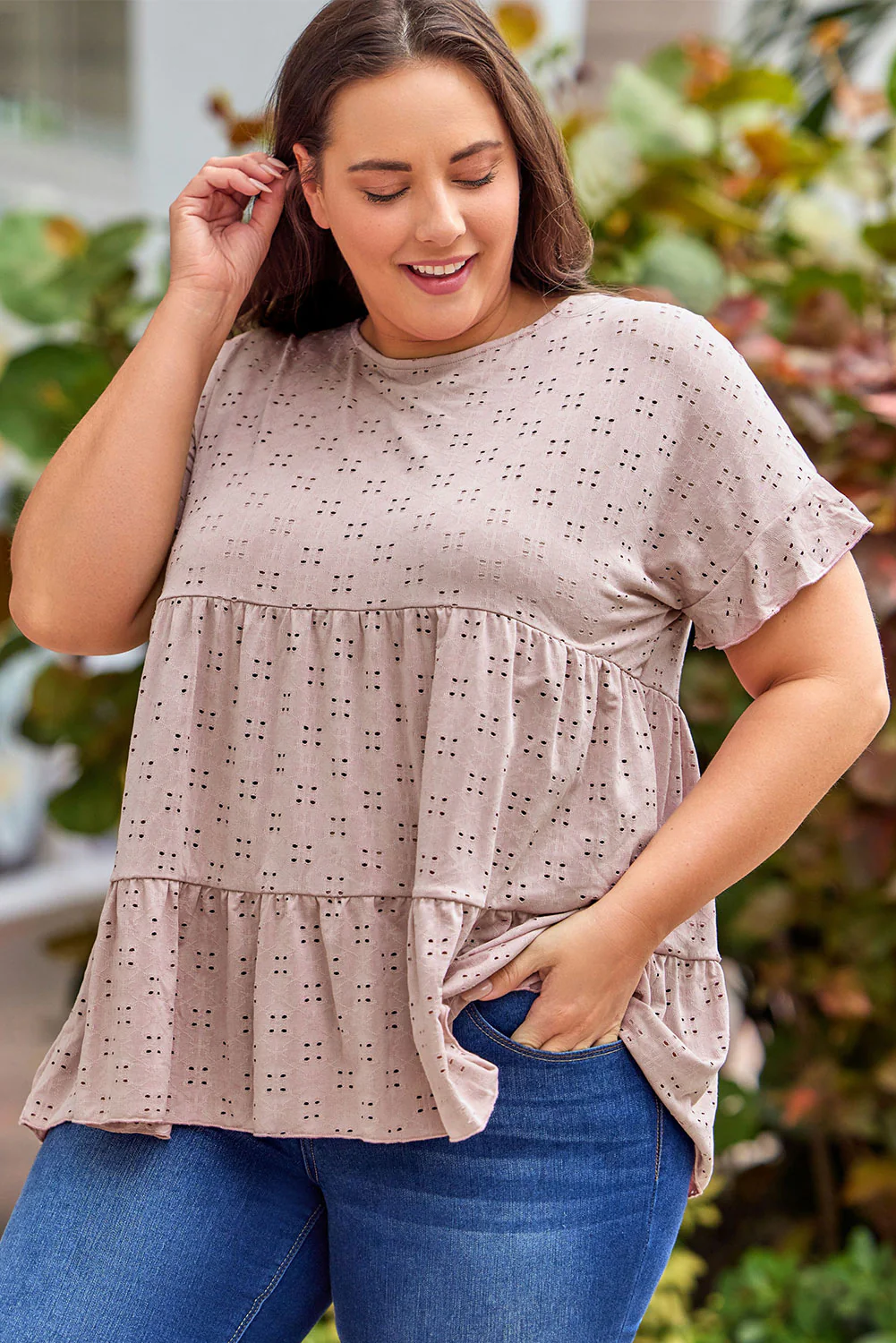 Pink Plus Size Eyelet Pattern Ruffle Sleeve Babydoll Top