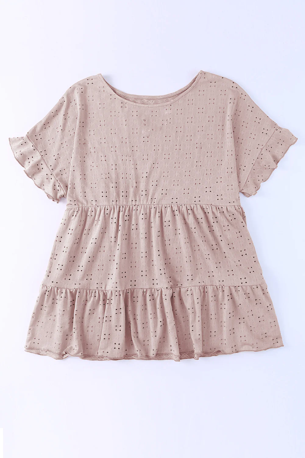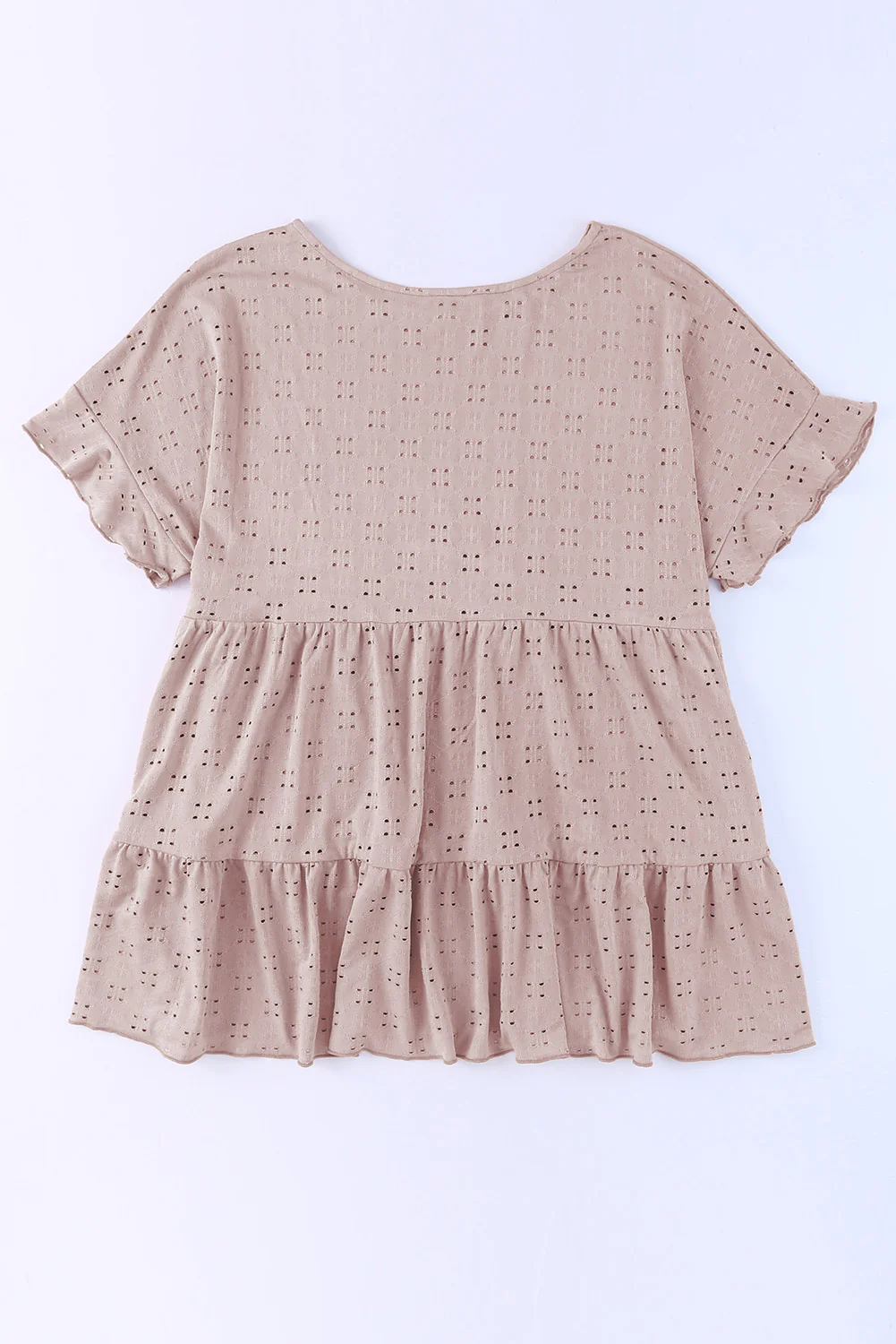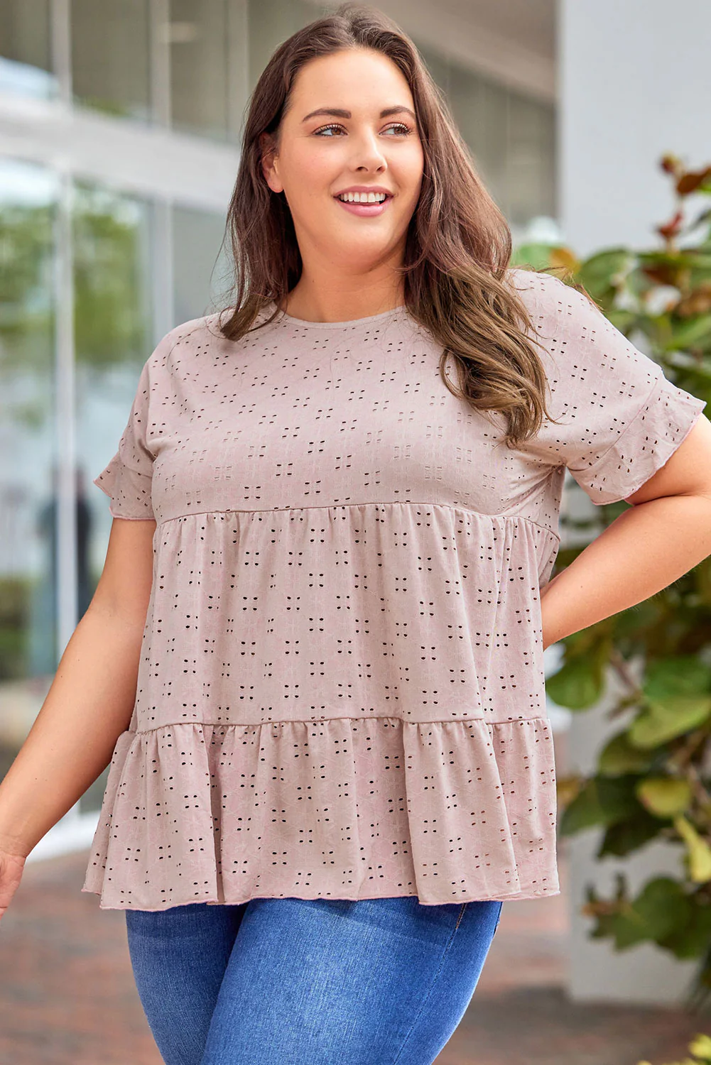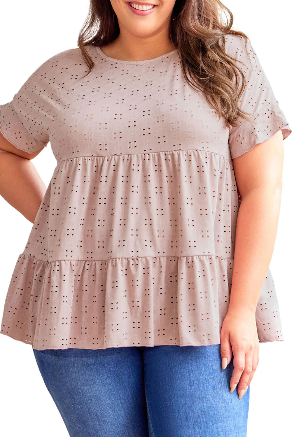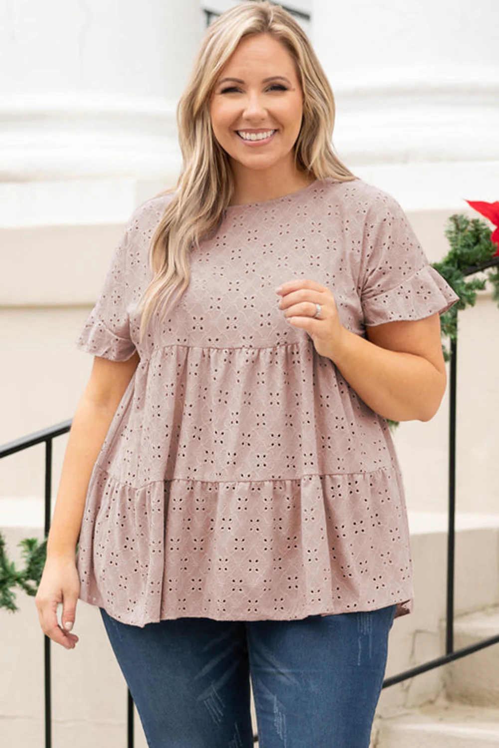 Pink Plus Size Eyelet Pattern Ruffle Sleeve Babydoll Top