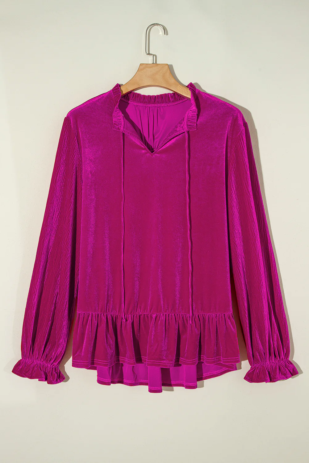 Bright Pink Plus Size Ruffled Sleeve V Neck Velvet Blouse