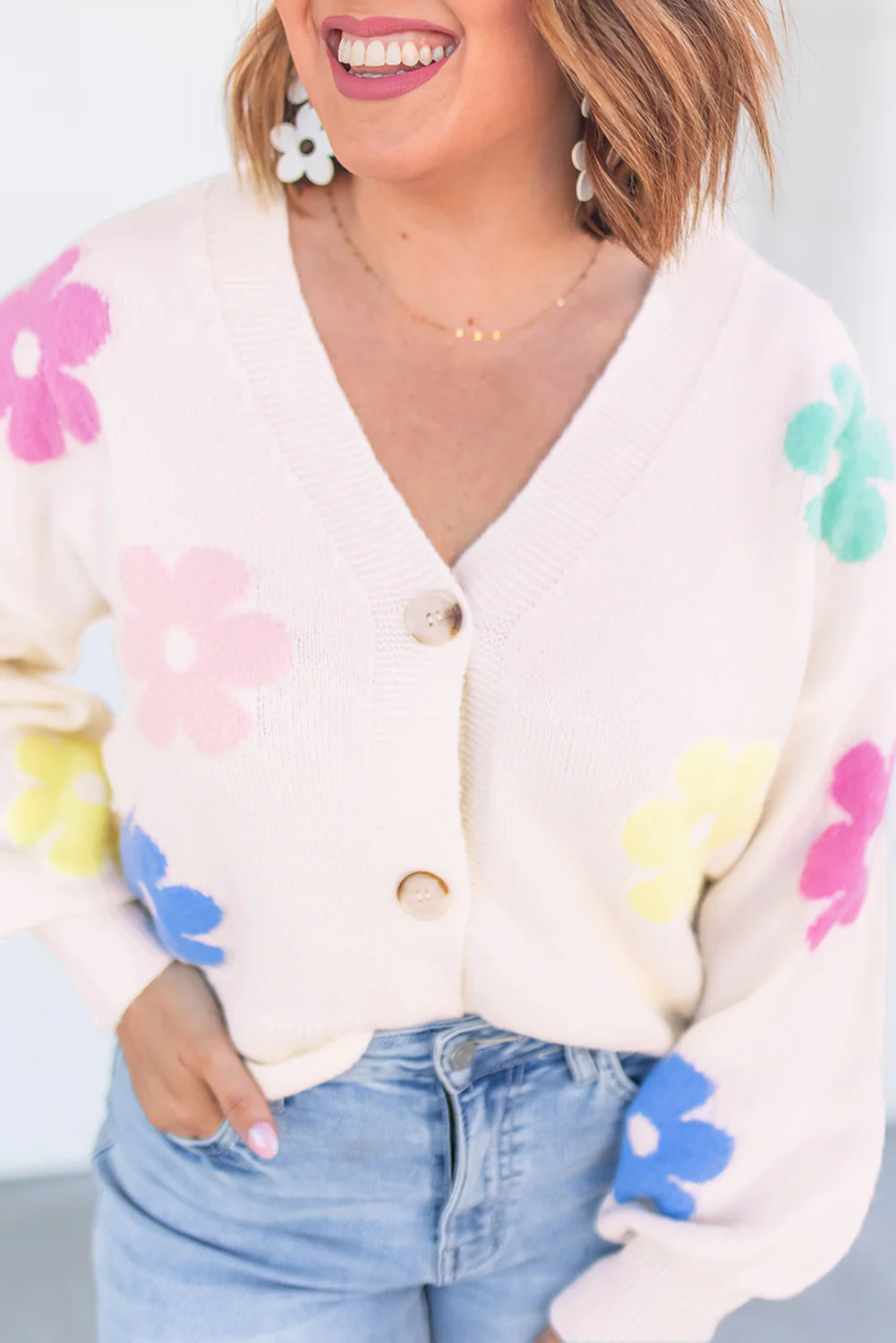 Beige Floral Pattern V Neck Buttoned Plus Size Cardigan