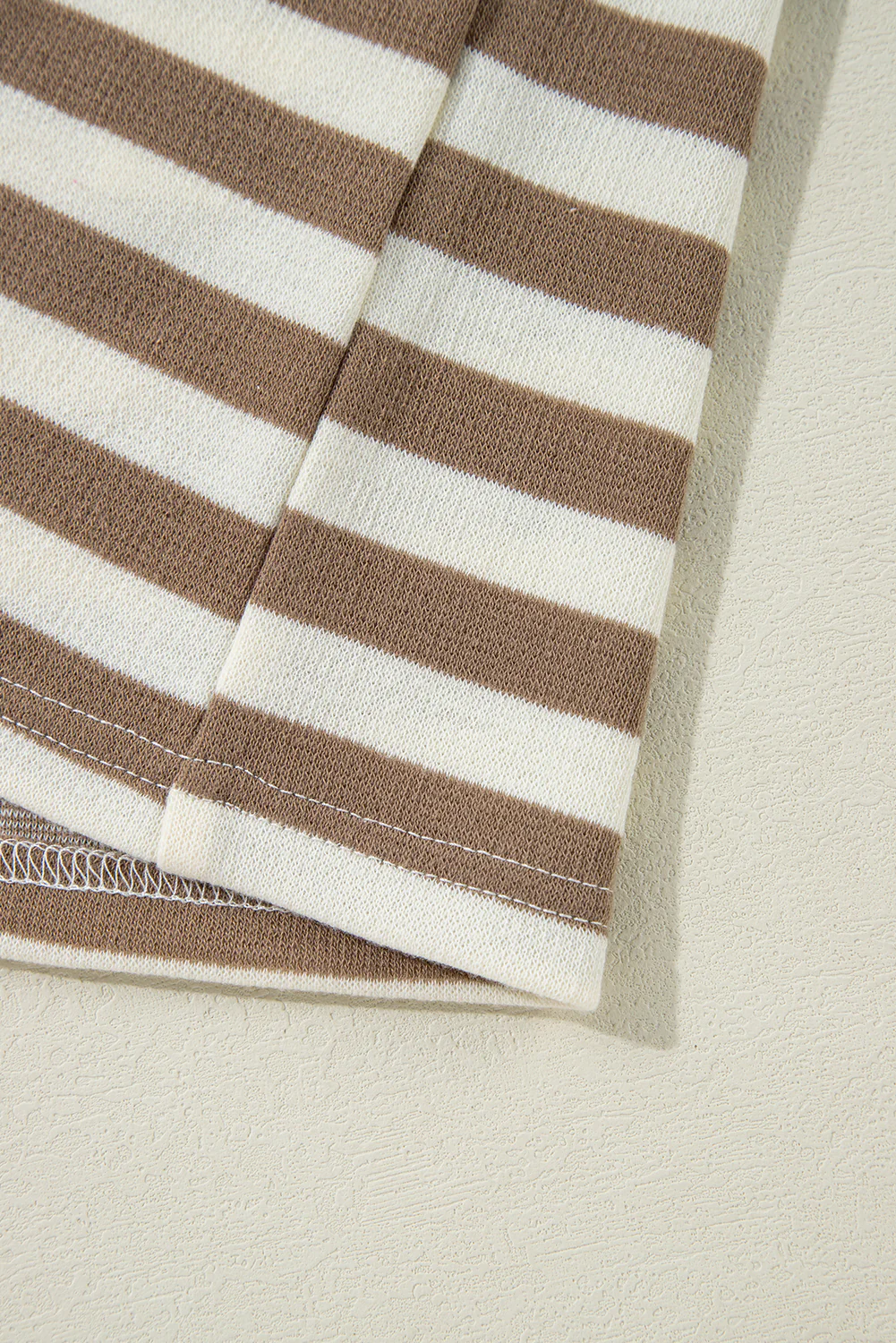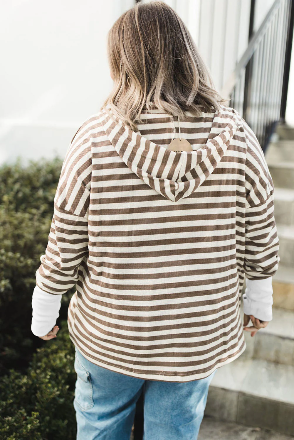 Brown Stripe Quarter Buttons Drop Sleeve Plus Size Hoodie