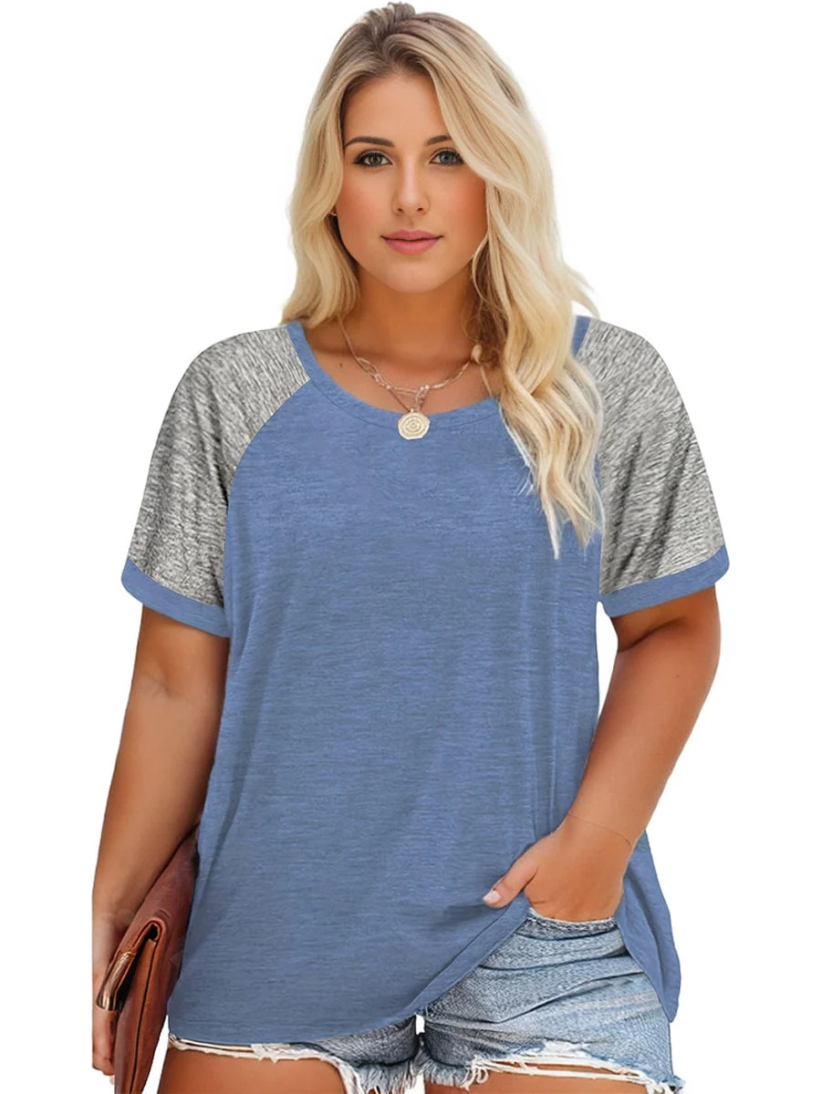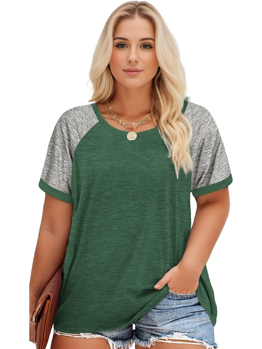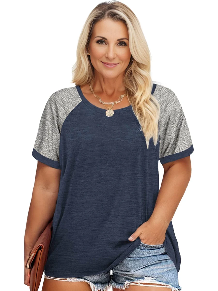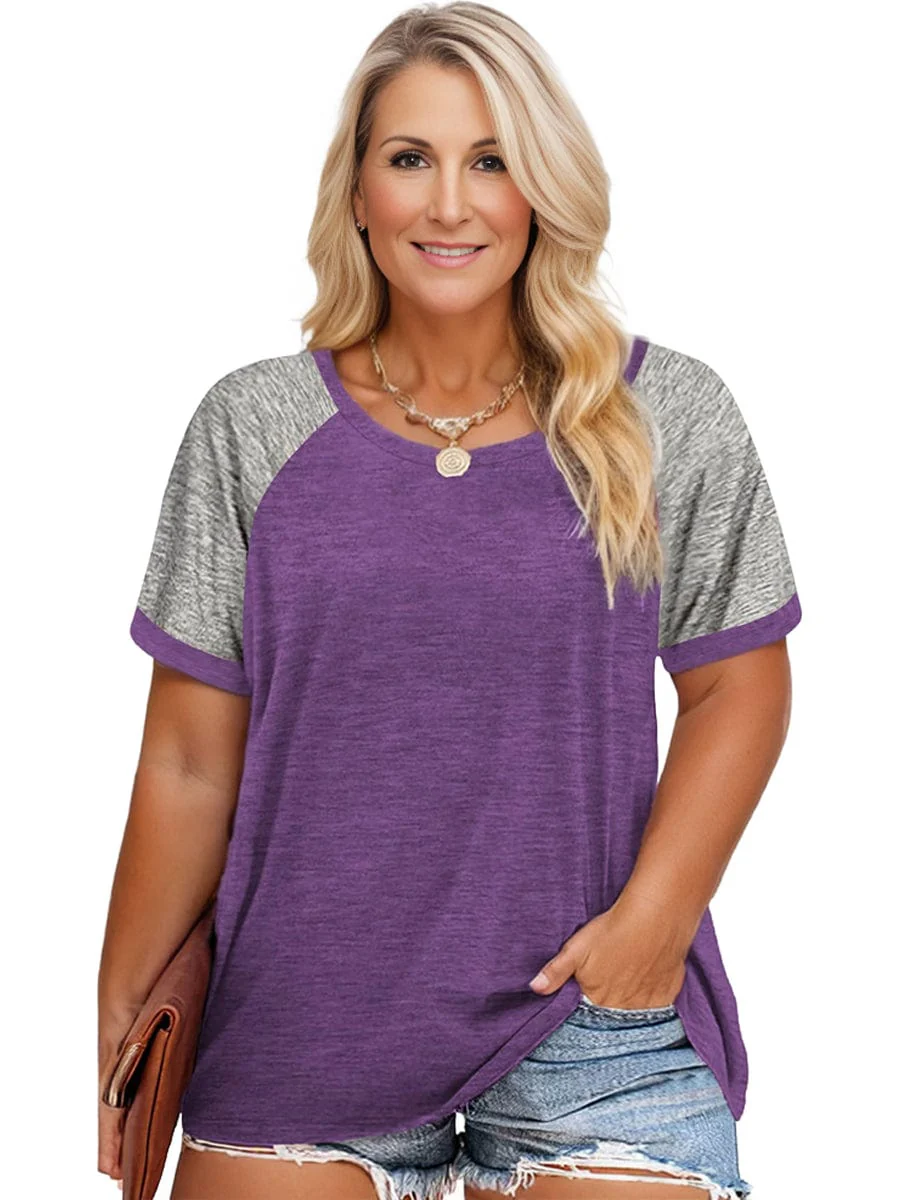Plus Size Casual T-shirt, Women's Plus Colorblock Short Sleeve Round Neck Slight Stretch T-shirt