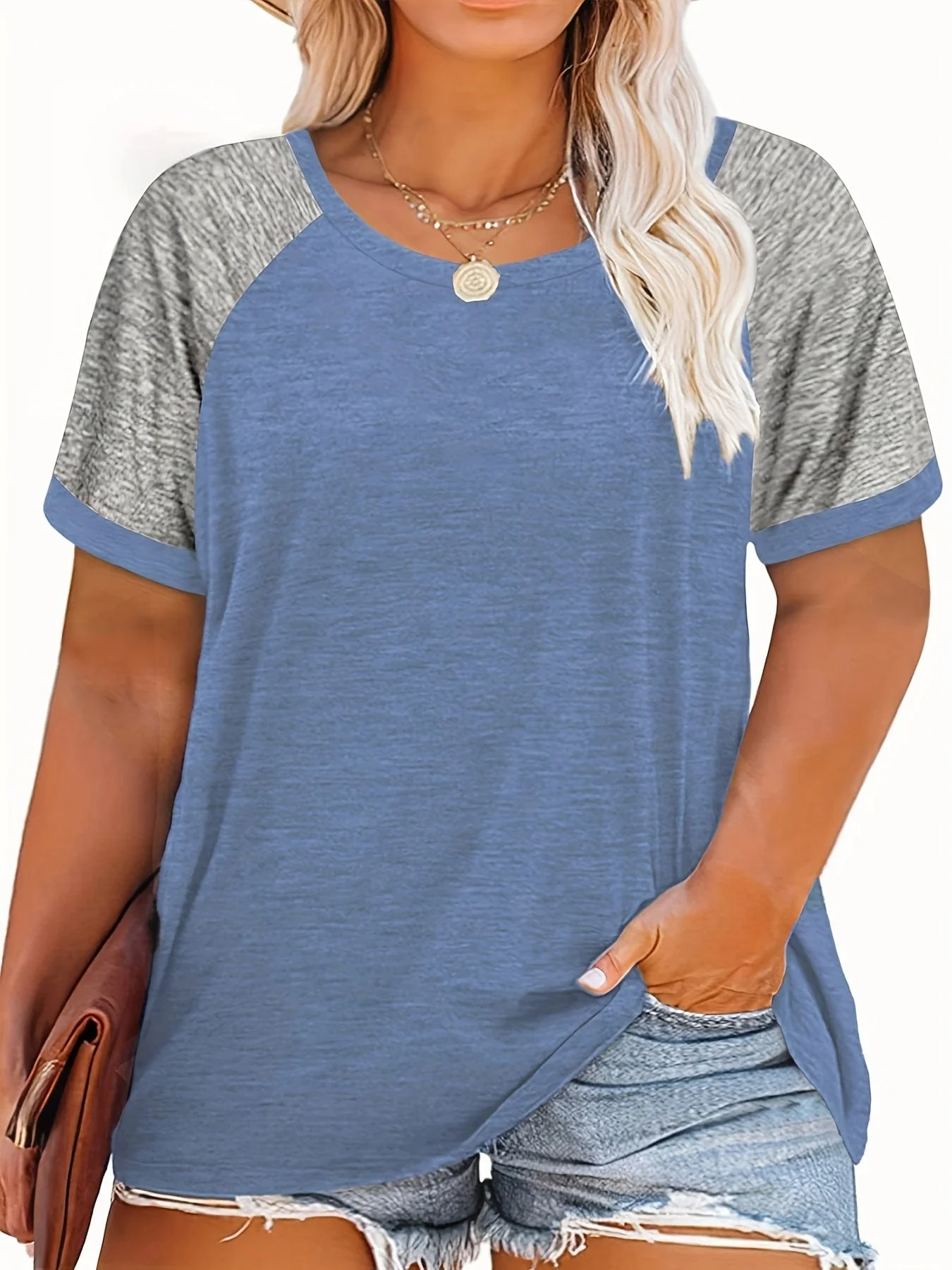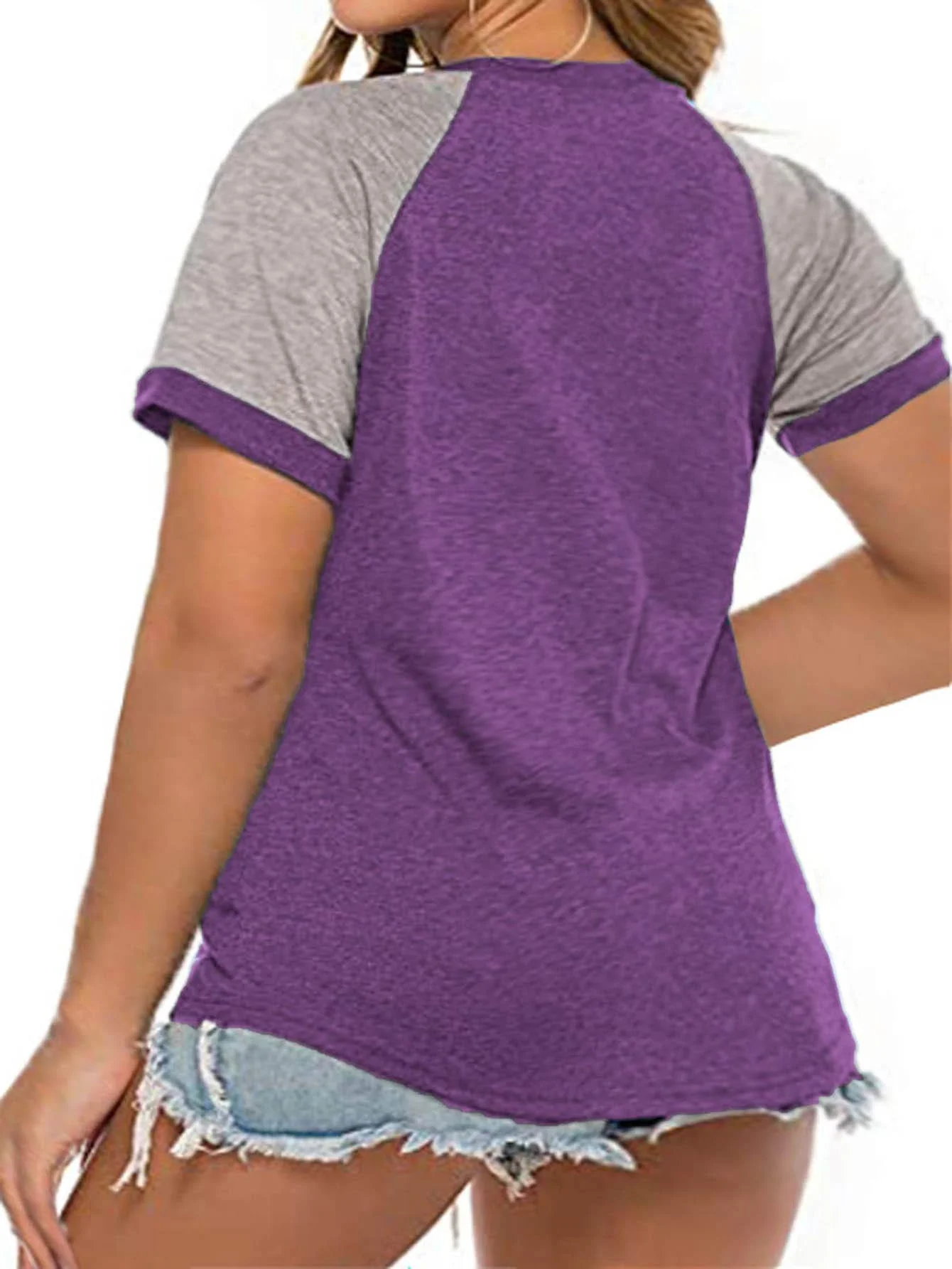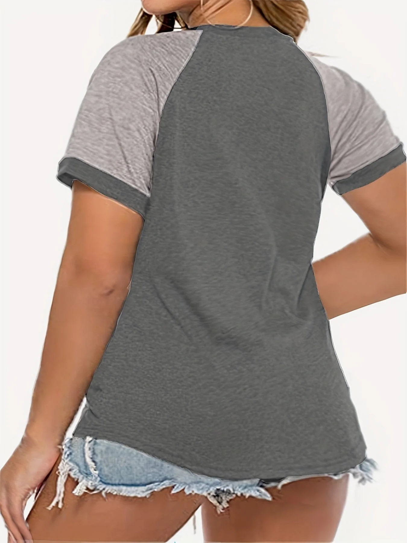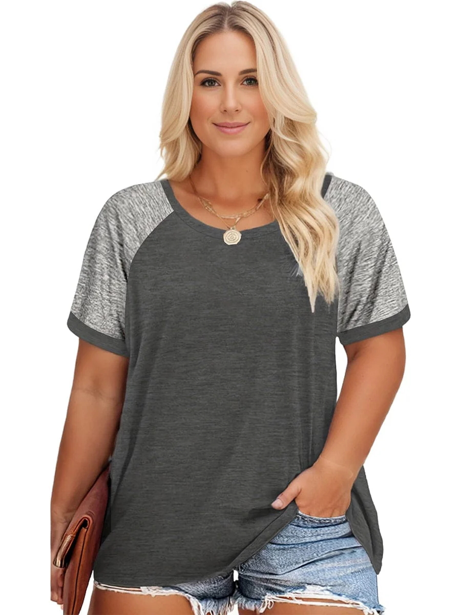 Plus Size Casual T-shirt, Women's Plus Colorblock Short Sleeve Round Neck Slight Stretch T-shirt