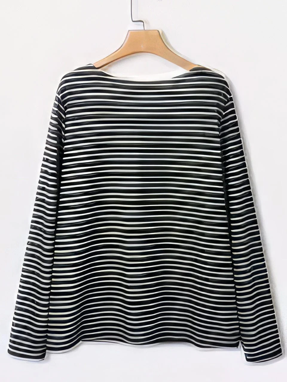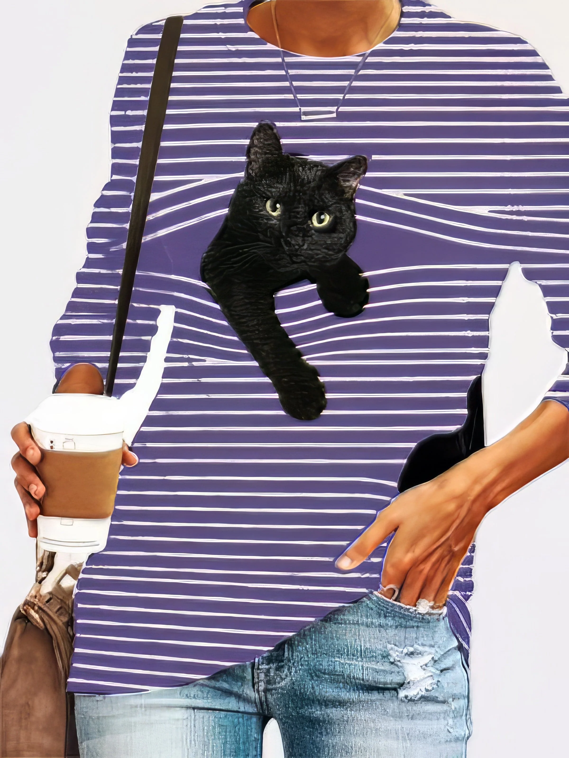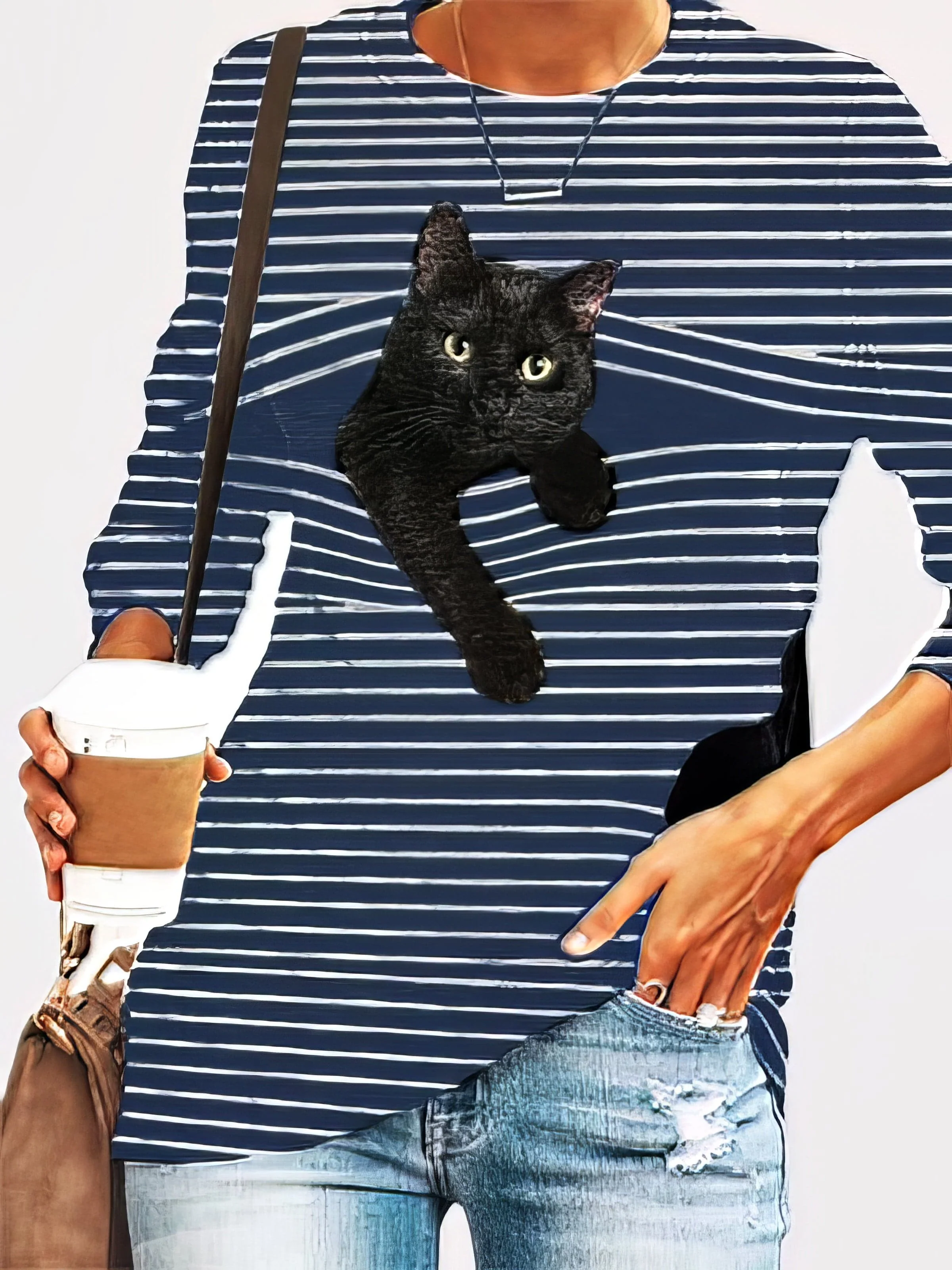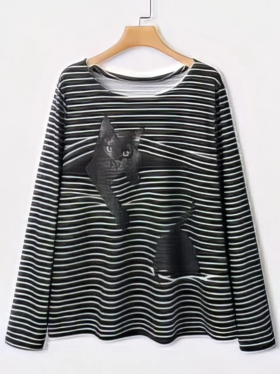 Black Feline Pattern Long Sleeve Striped White Round Neck Plus Size Tee
