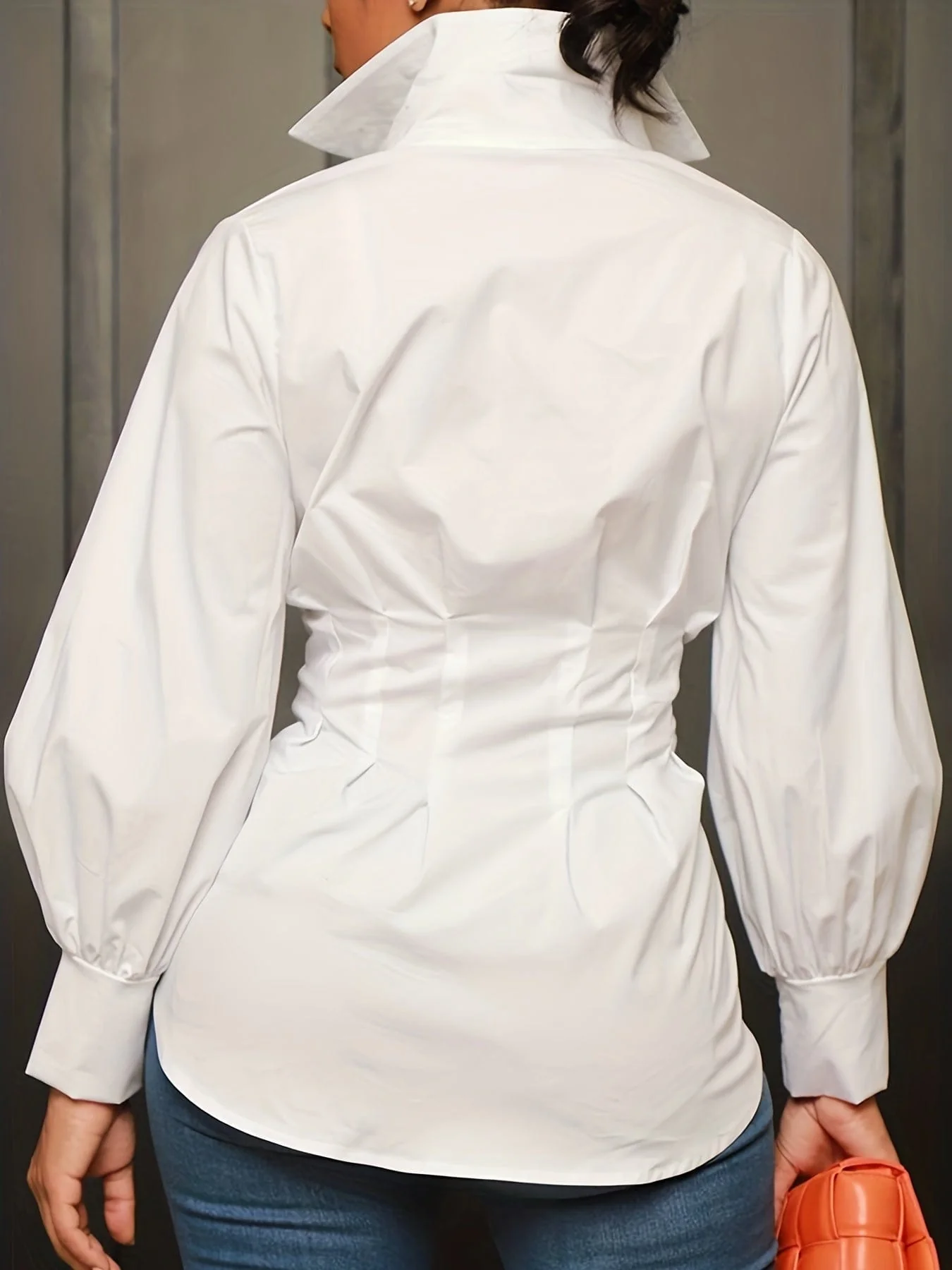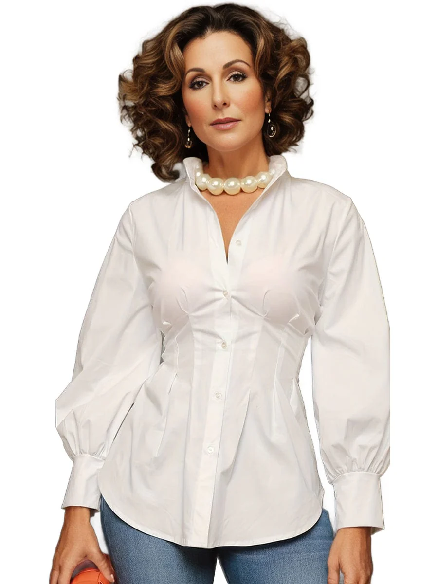 Plus Size Casual Blouse, Women's Plus Solid Button Up Lantern Sleeve Turn Down Collar Nipped Waist Blouse