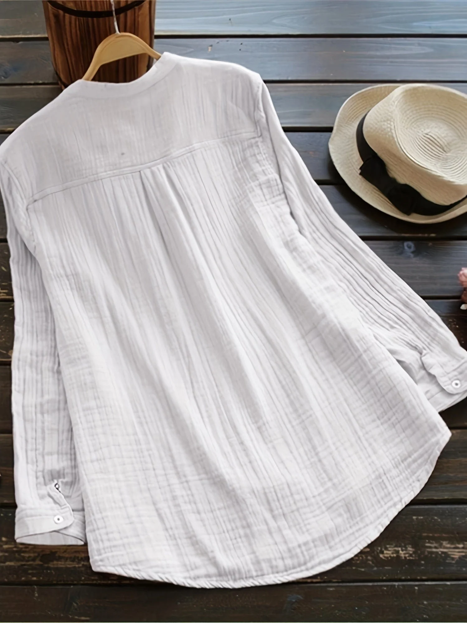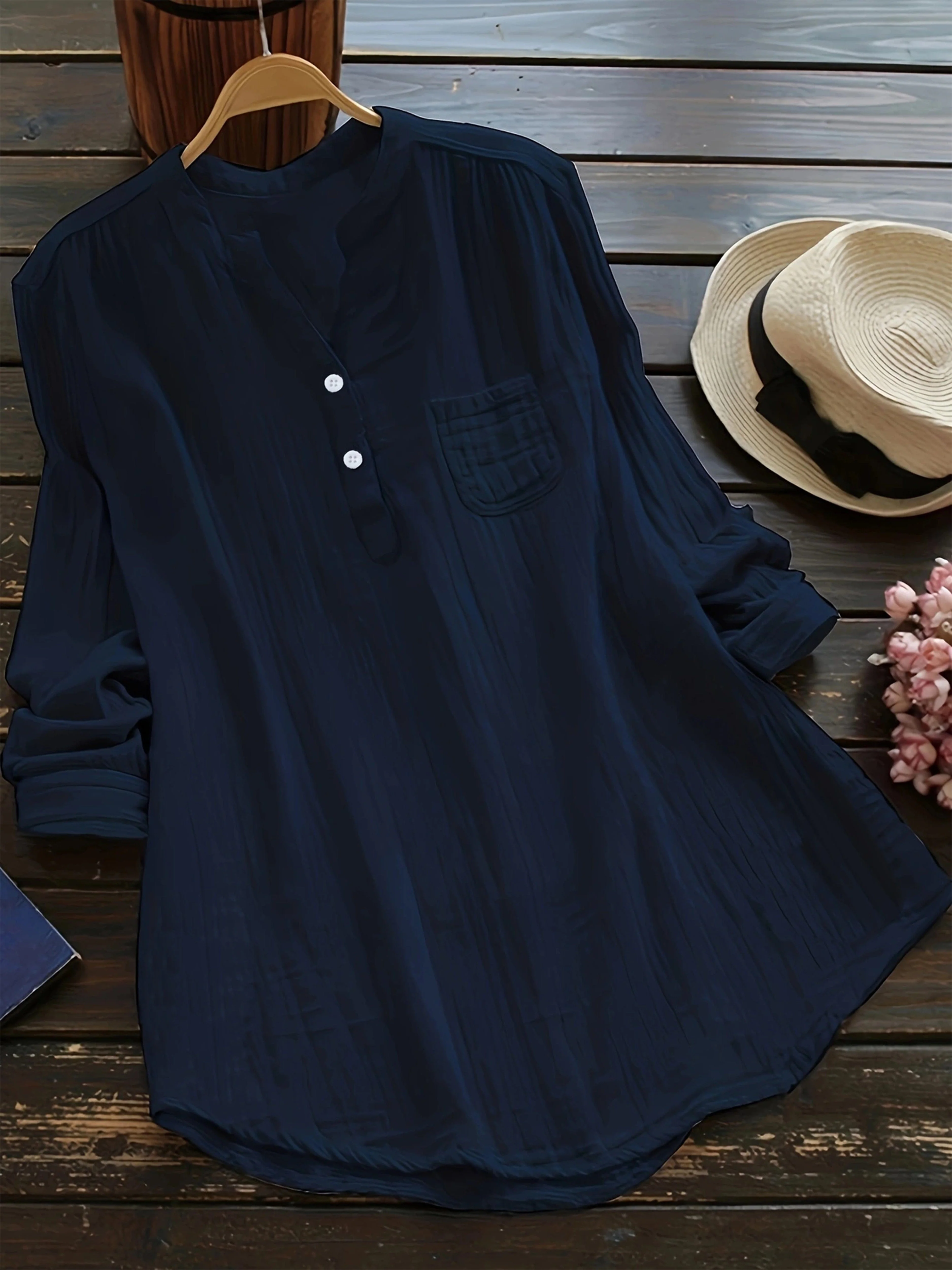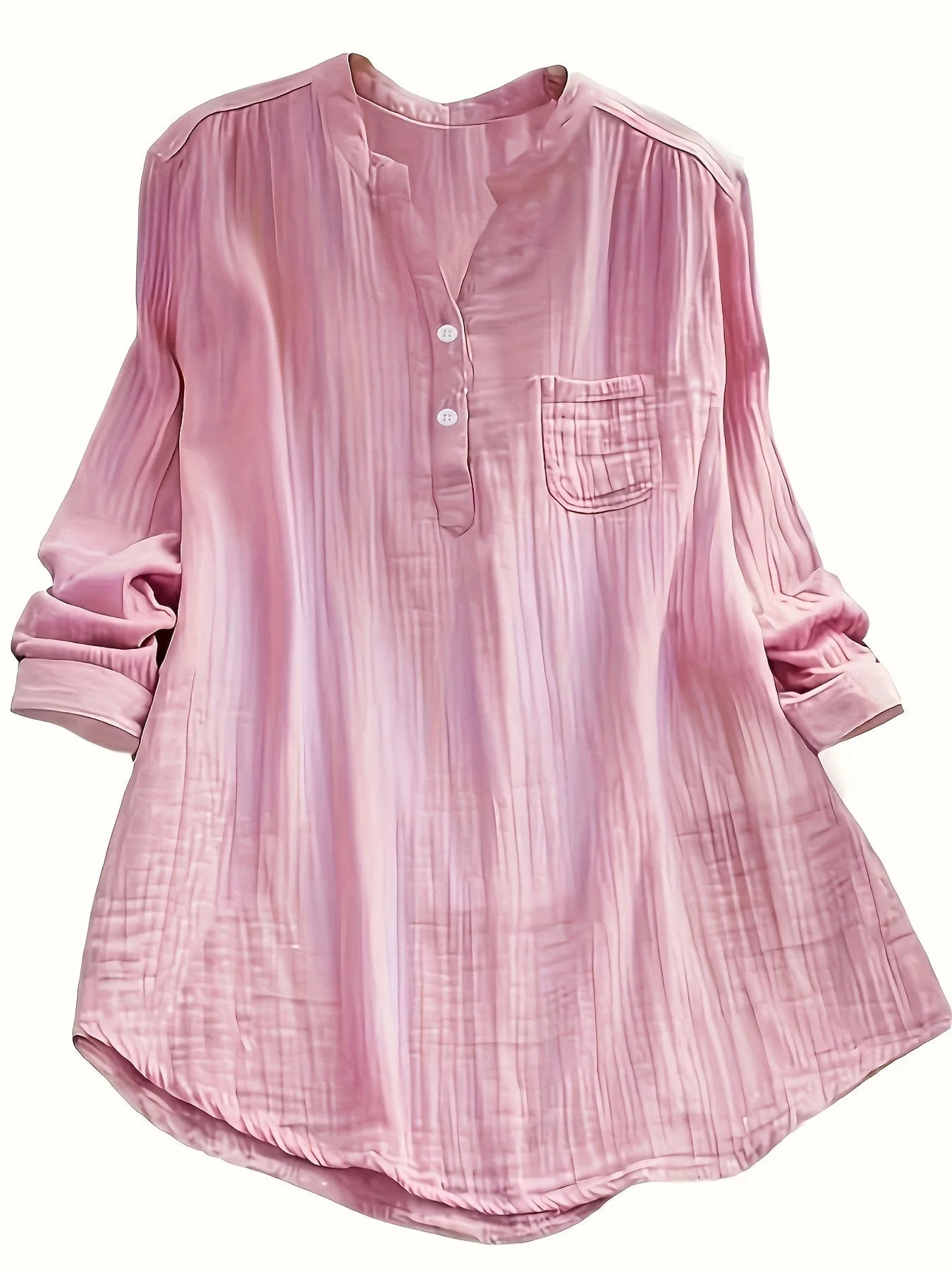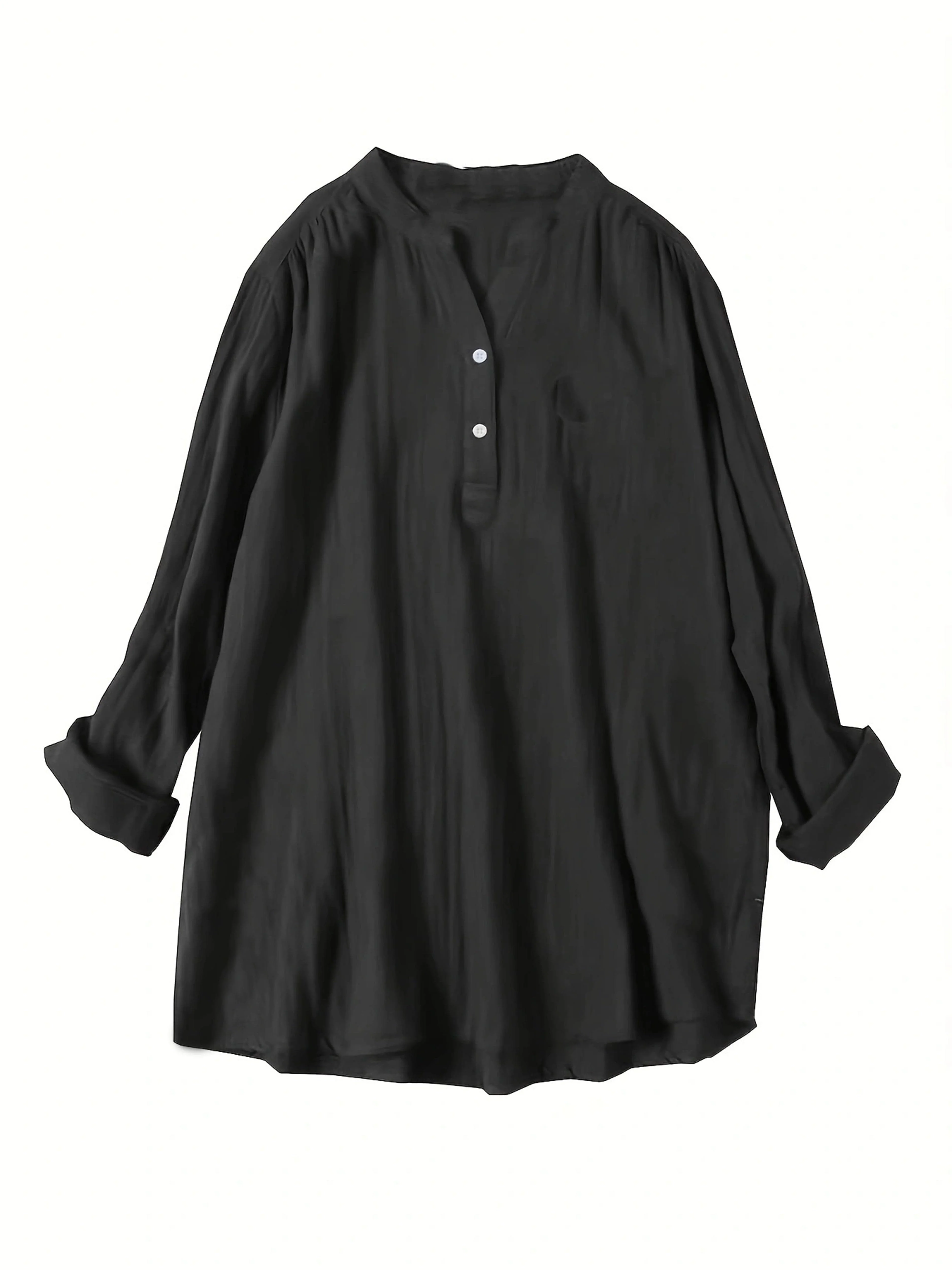 Plus Size Casual Blouse, Women's Plus Solid Long Sleeve Notched Neck Ruched Back Round Hem Slight Stretch Henley Blouse With Pocket