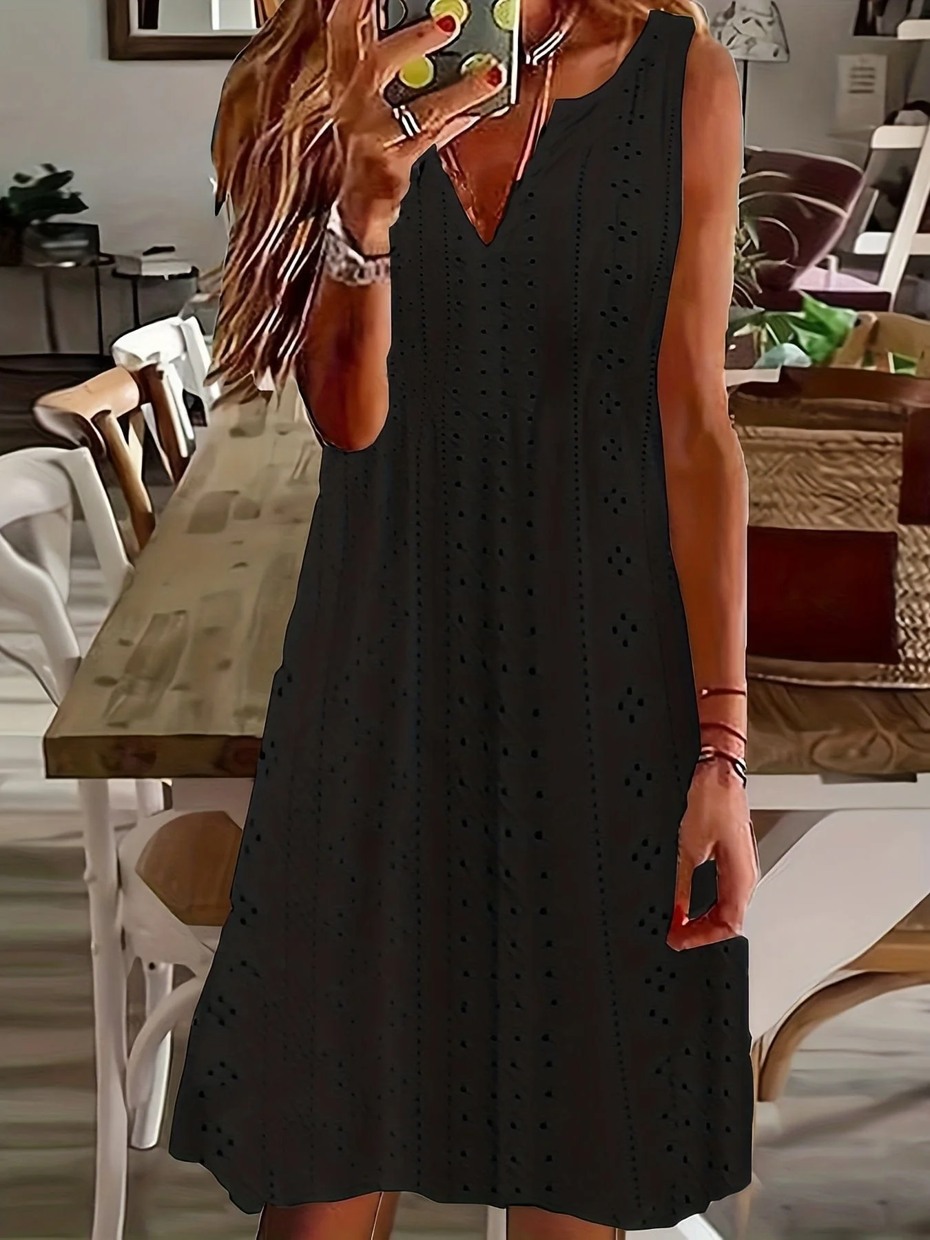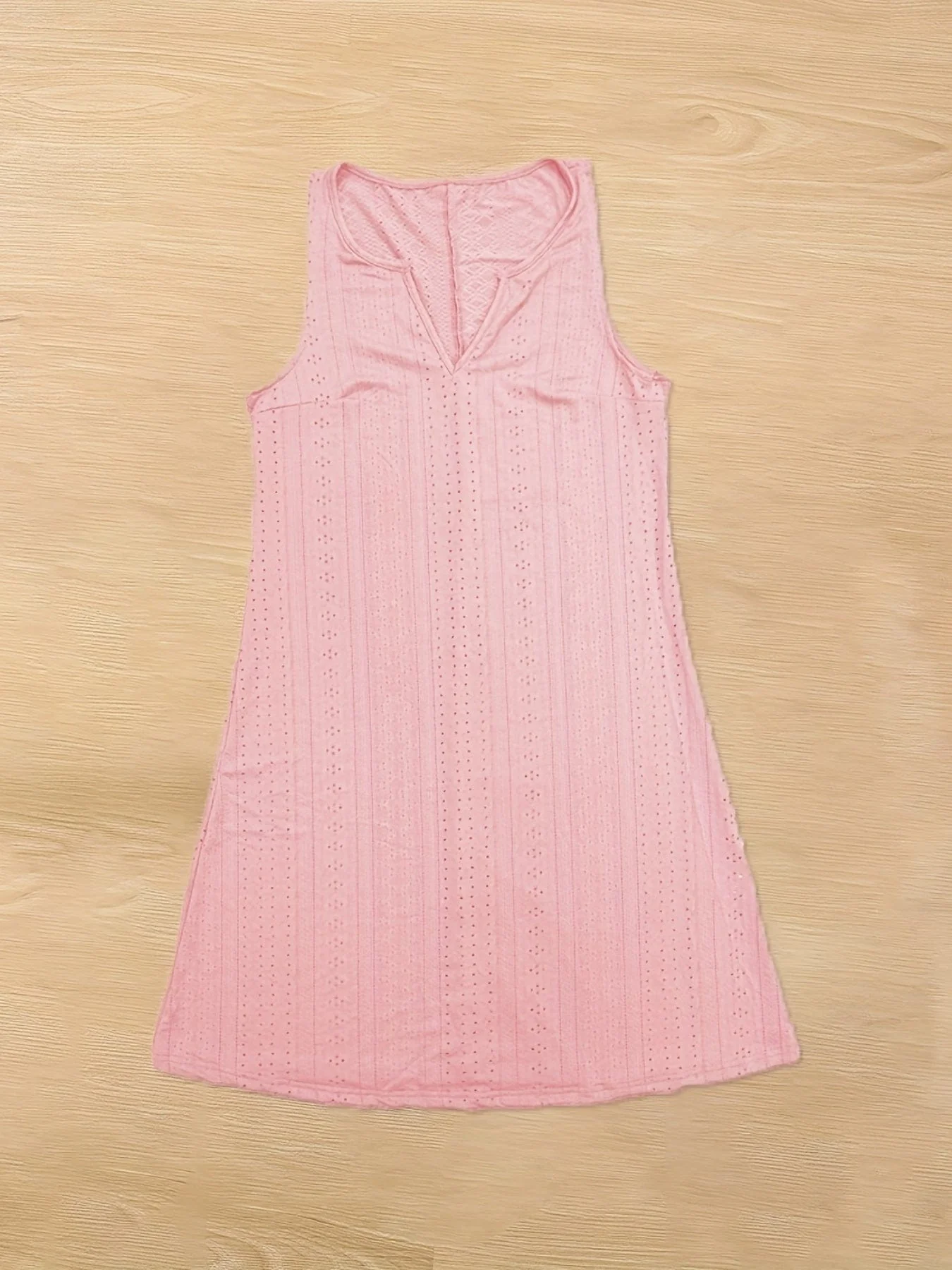 Plus Size Elegant Dress, Women's Plus Solid Eyelet Embroidered Notched Neck Medium Stretch Tank Dress