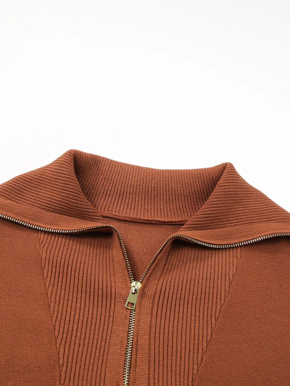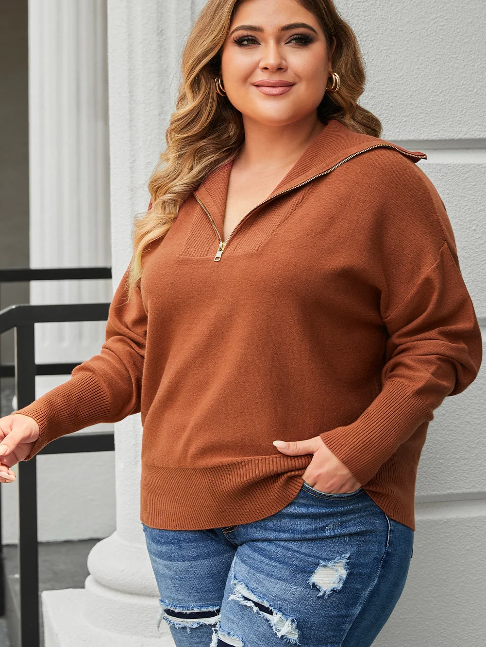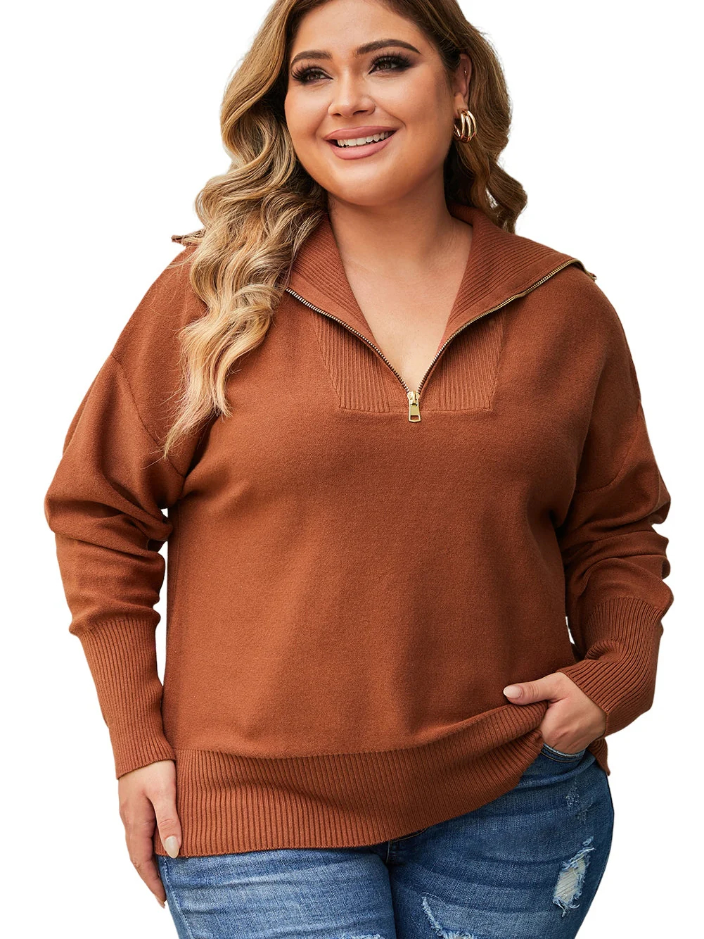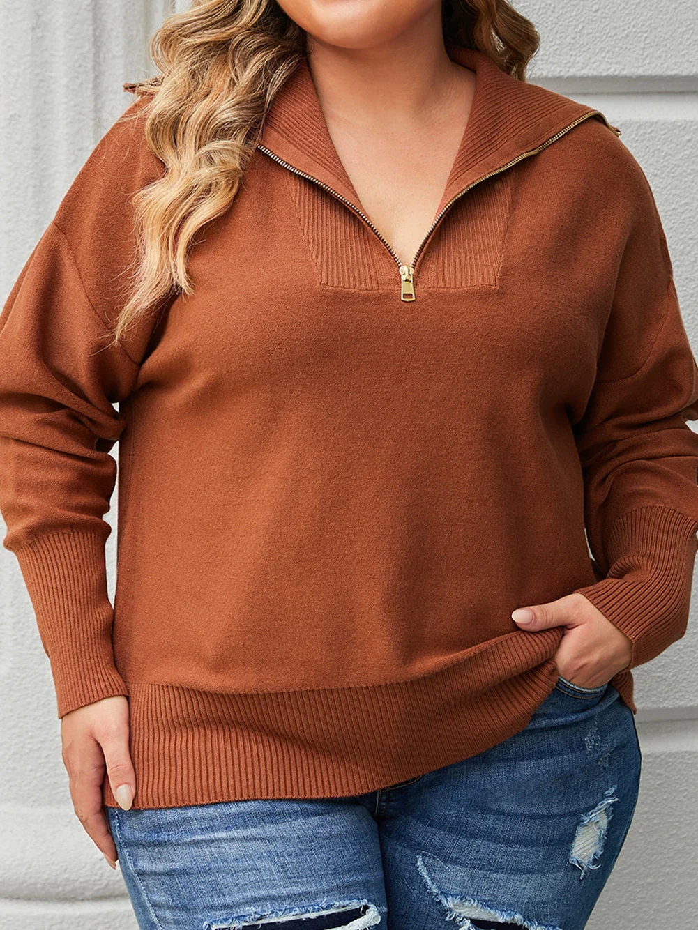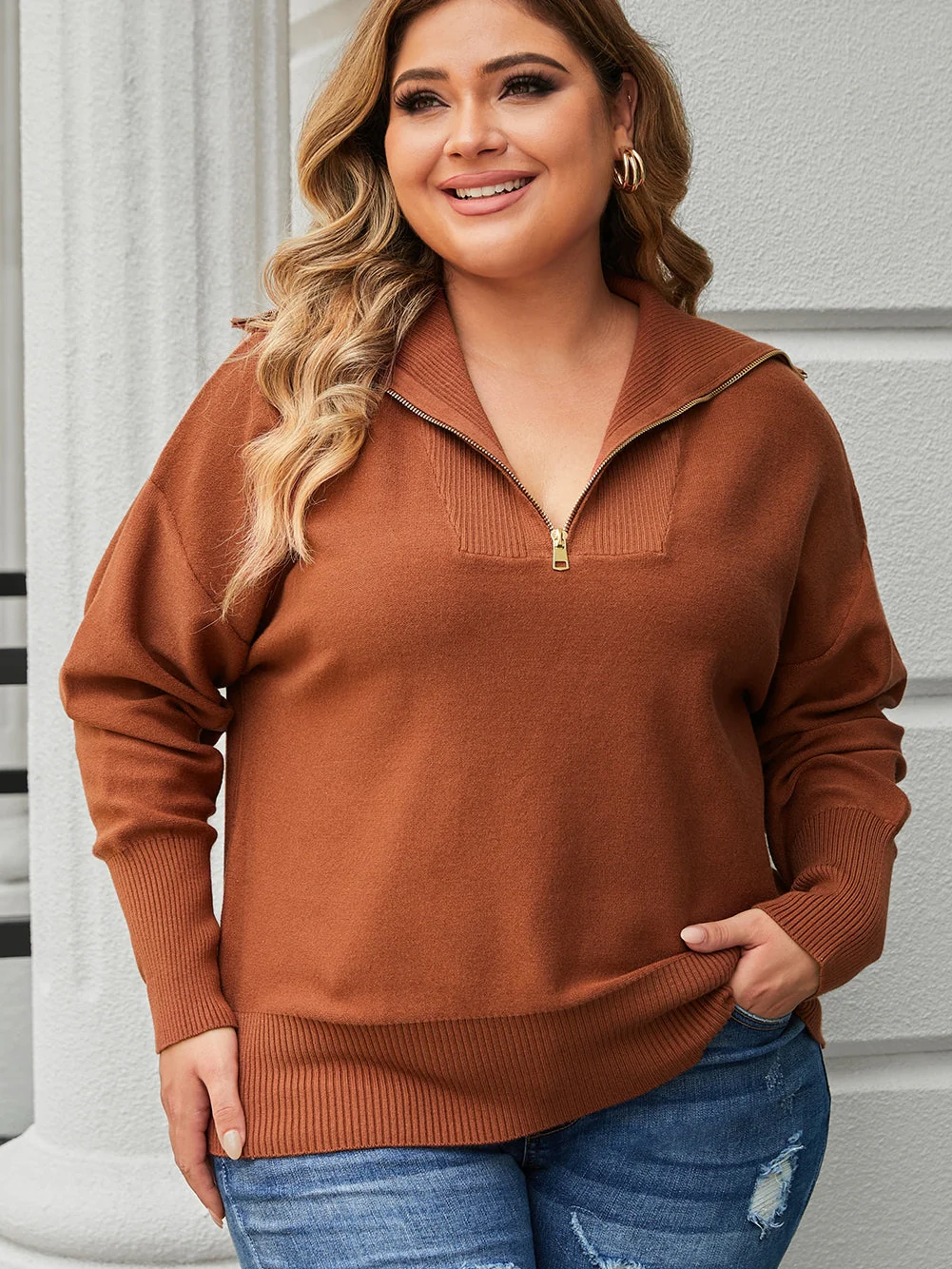 Cozy Brown Zip-Up Collar Plus Size Sweater with Ribbed Detail