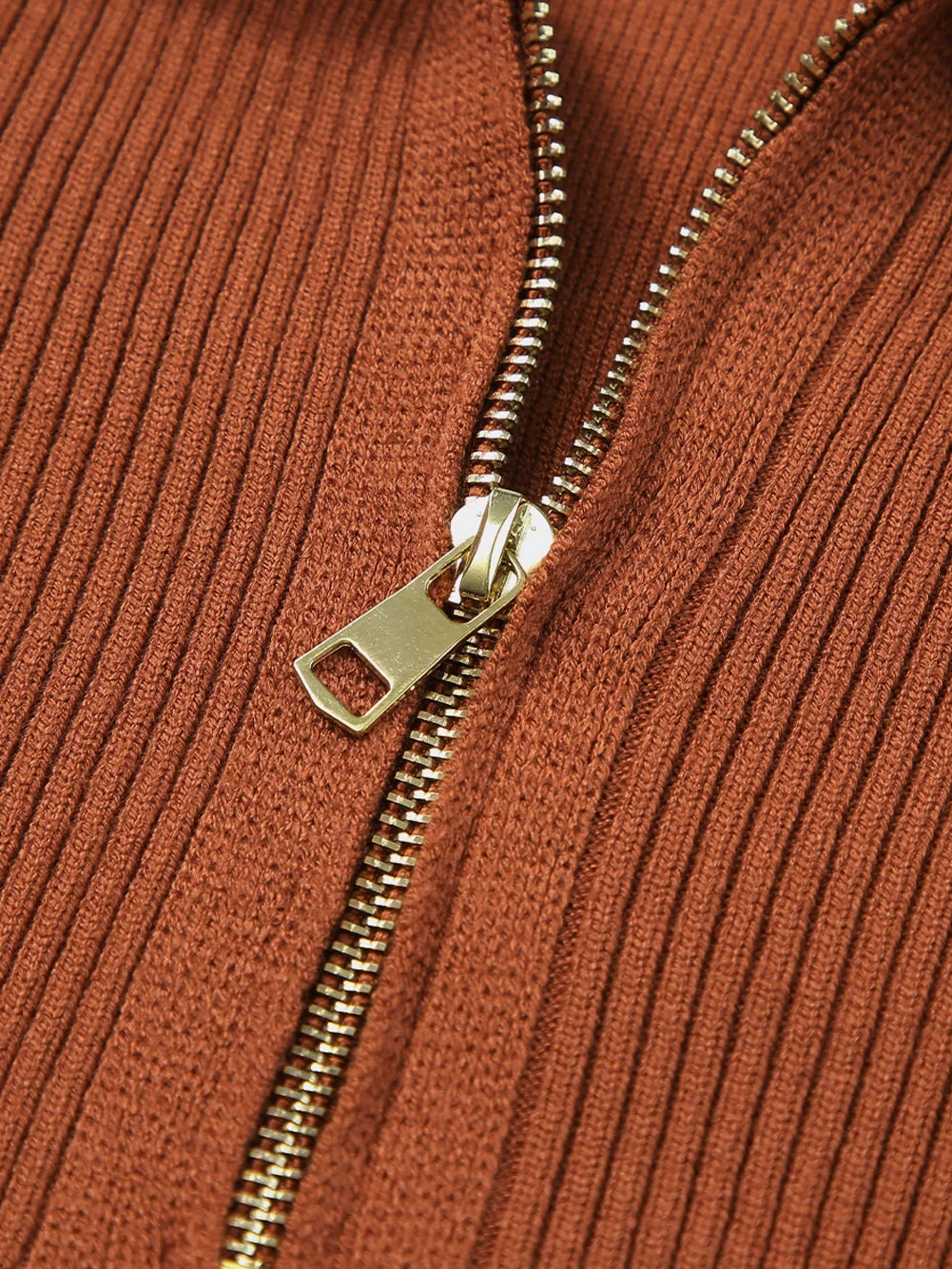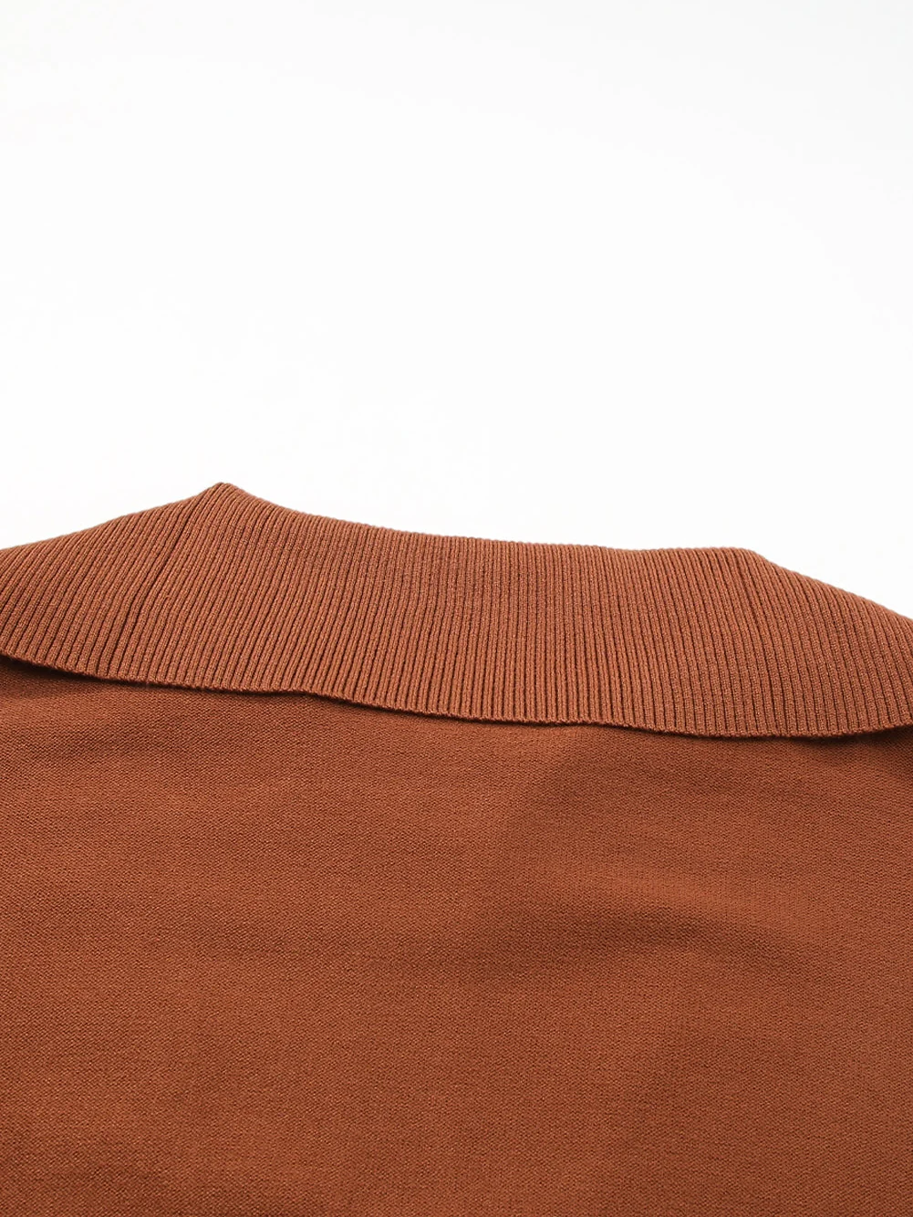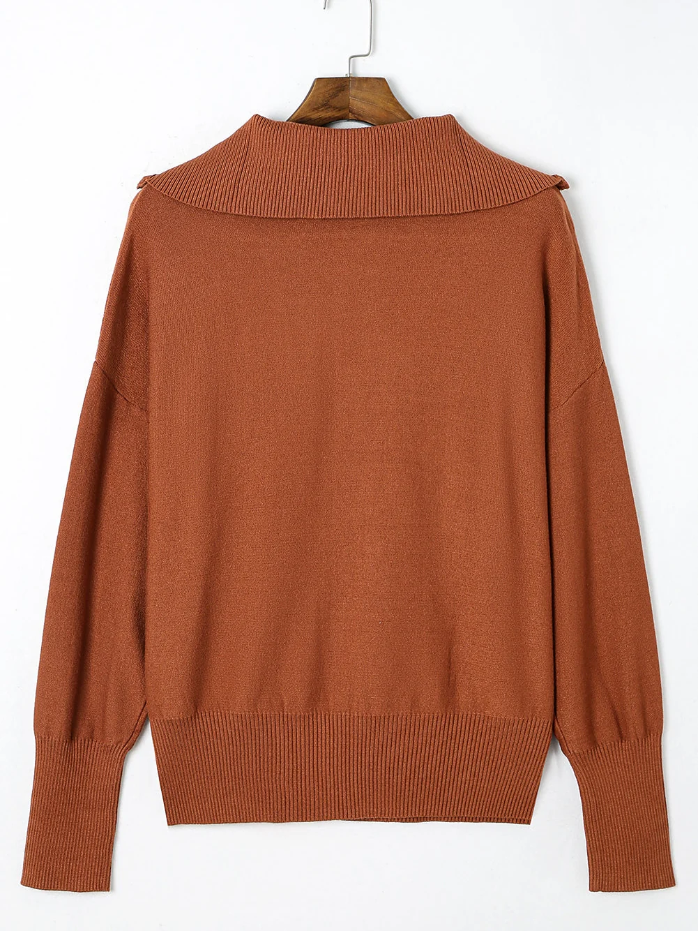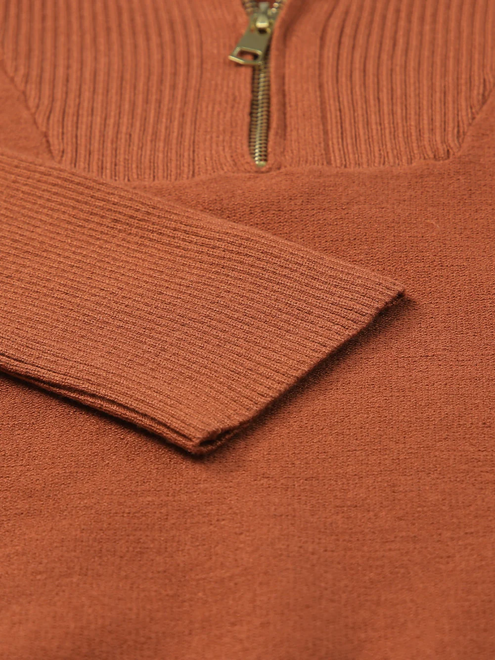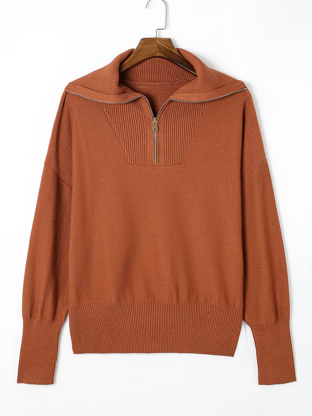 Cozy Brown Zip-Up Collar Plus Size Sweater with Ribbed Detail