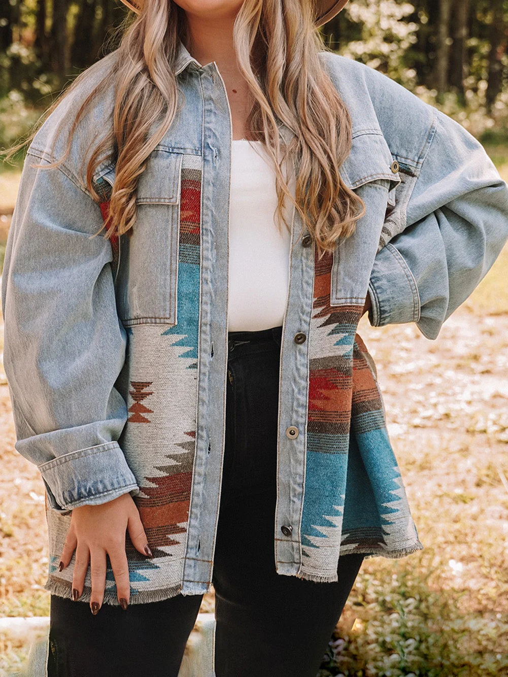 Sky Blue Denim Aztec Print Plus Size Shacket