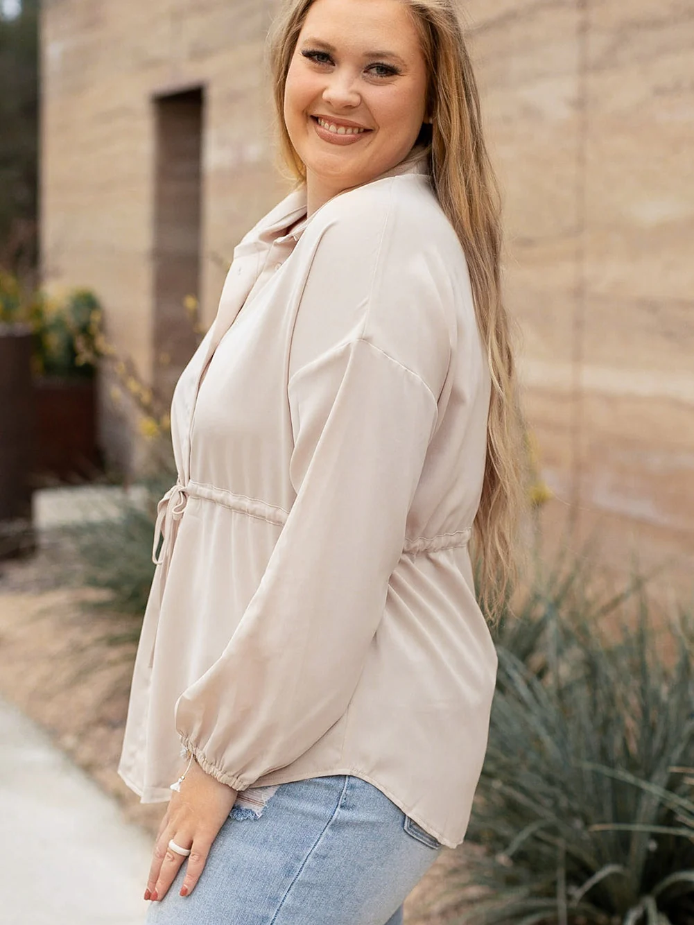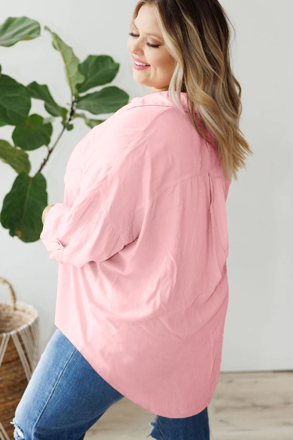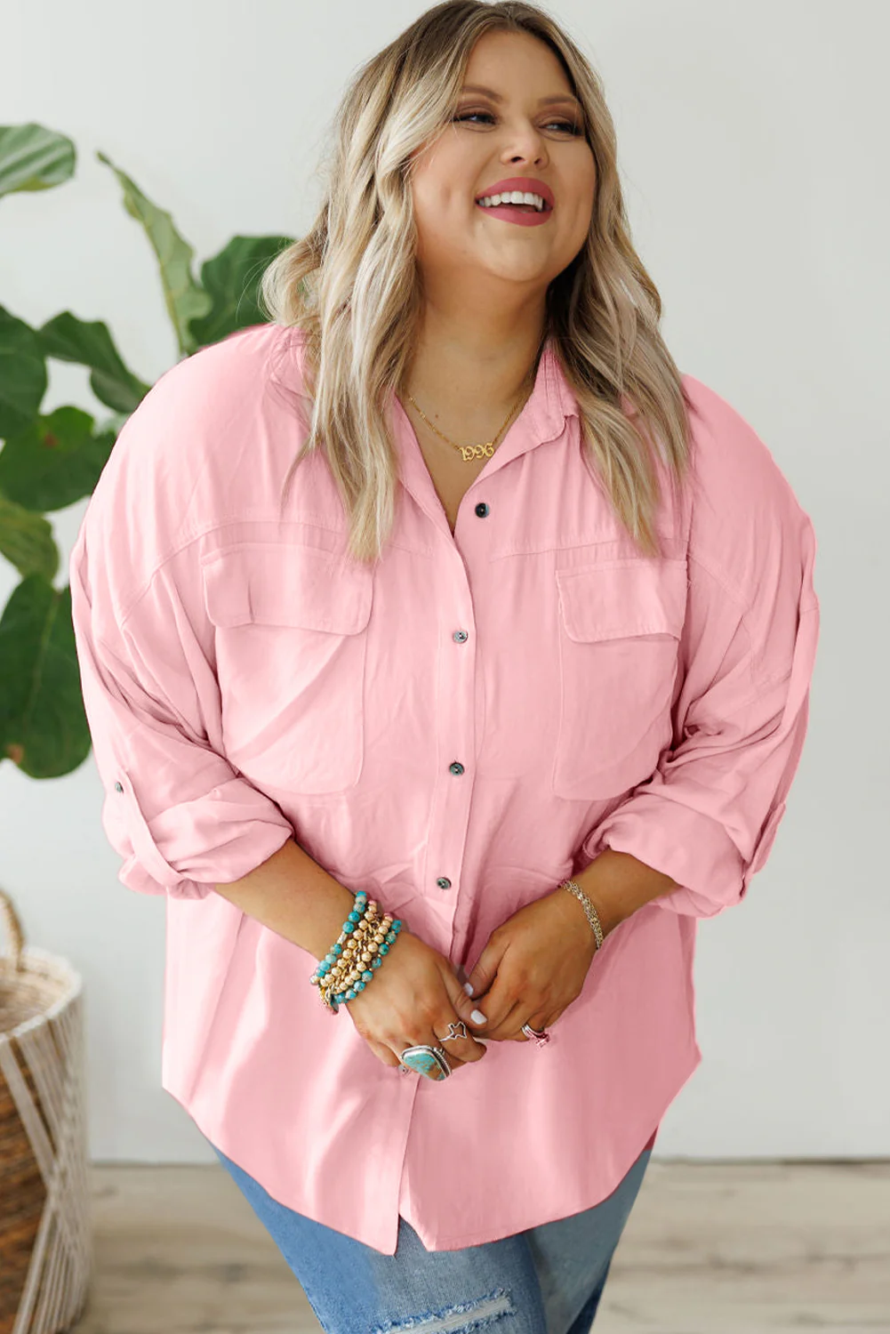 Rose Pink Roll-Tab Sleeve Plus Size Button-Up Shirt