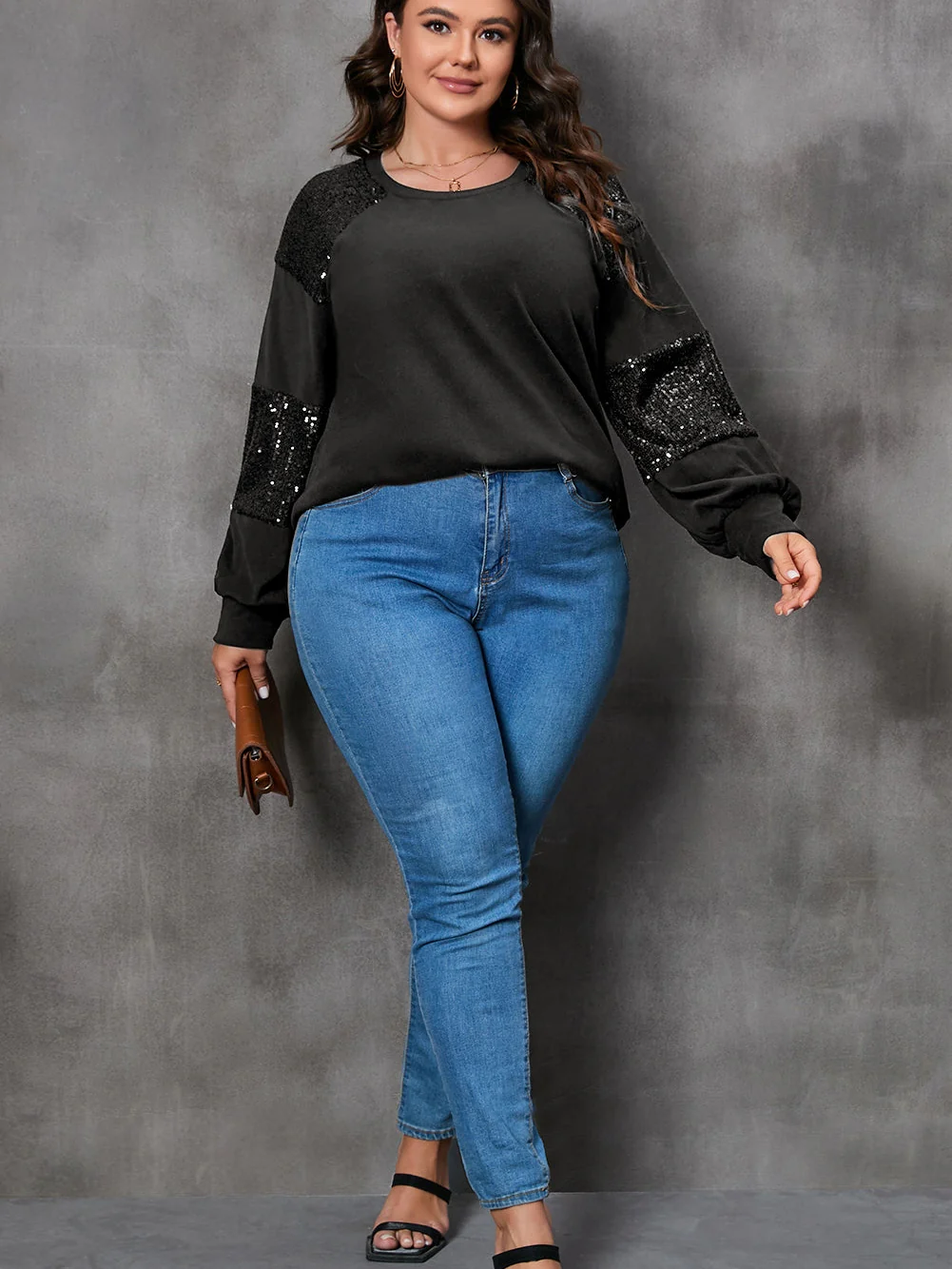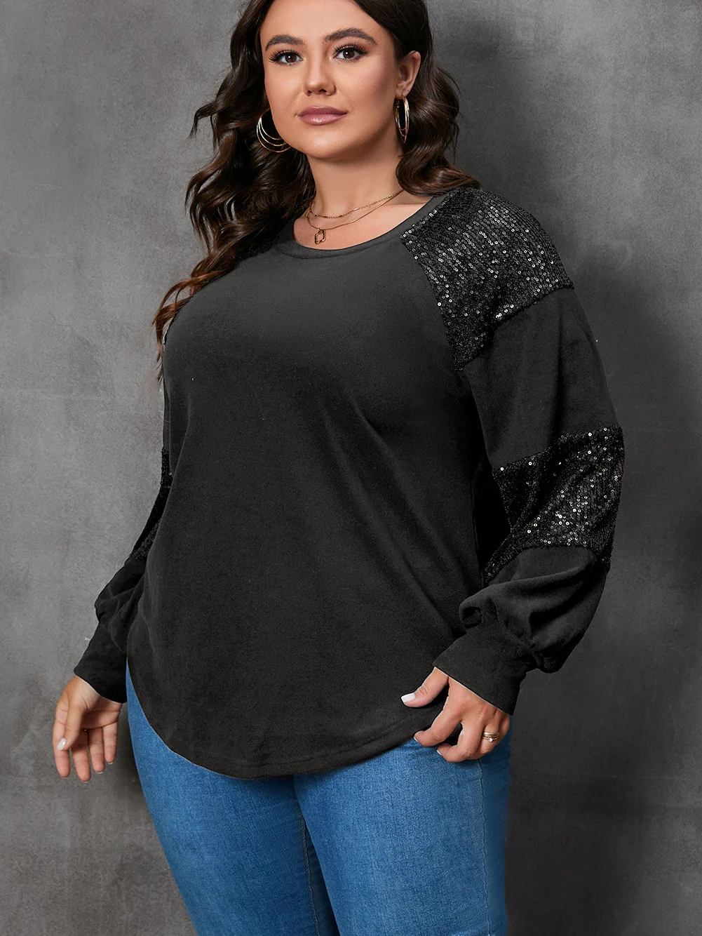 Sparkling Black Plus Size Sequin Patchwork Long Sleeve Top