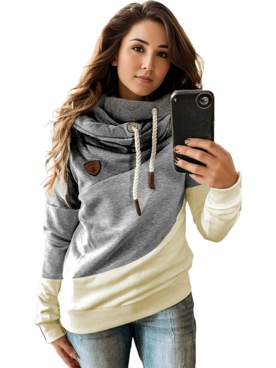 Plus Size Casual Sweatshirt, Women's Plus Colorblock Long Sleeve Hooded Drawstring Slight Stretch Sweatshirt