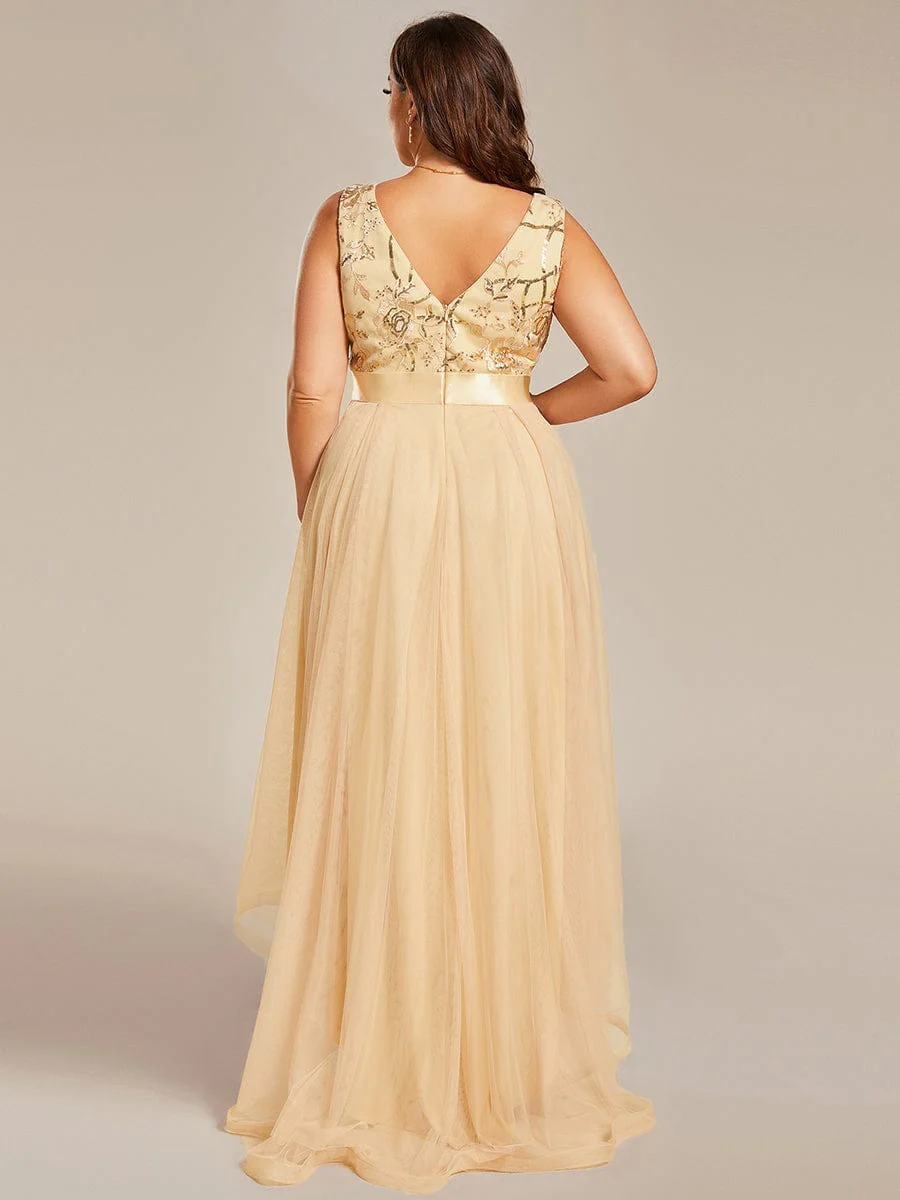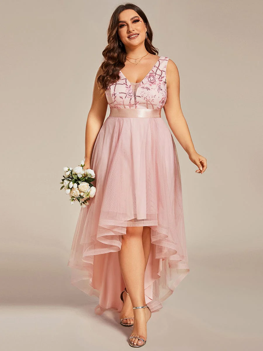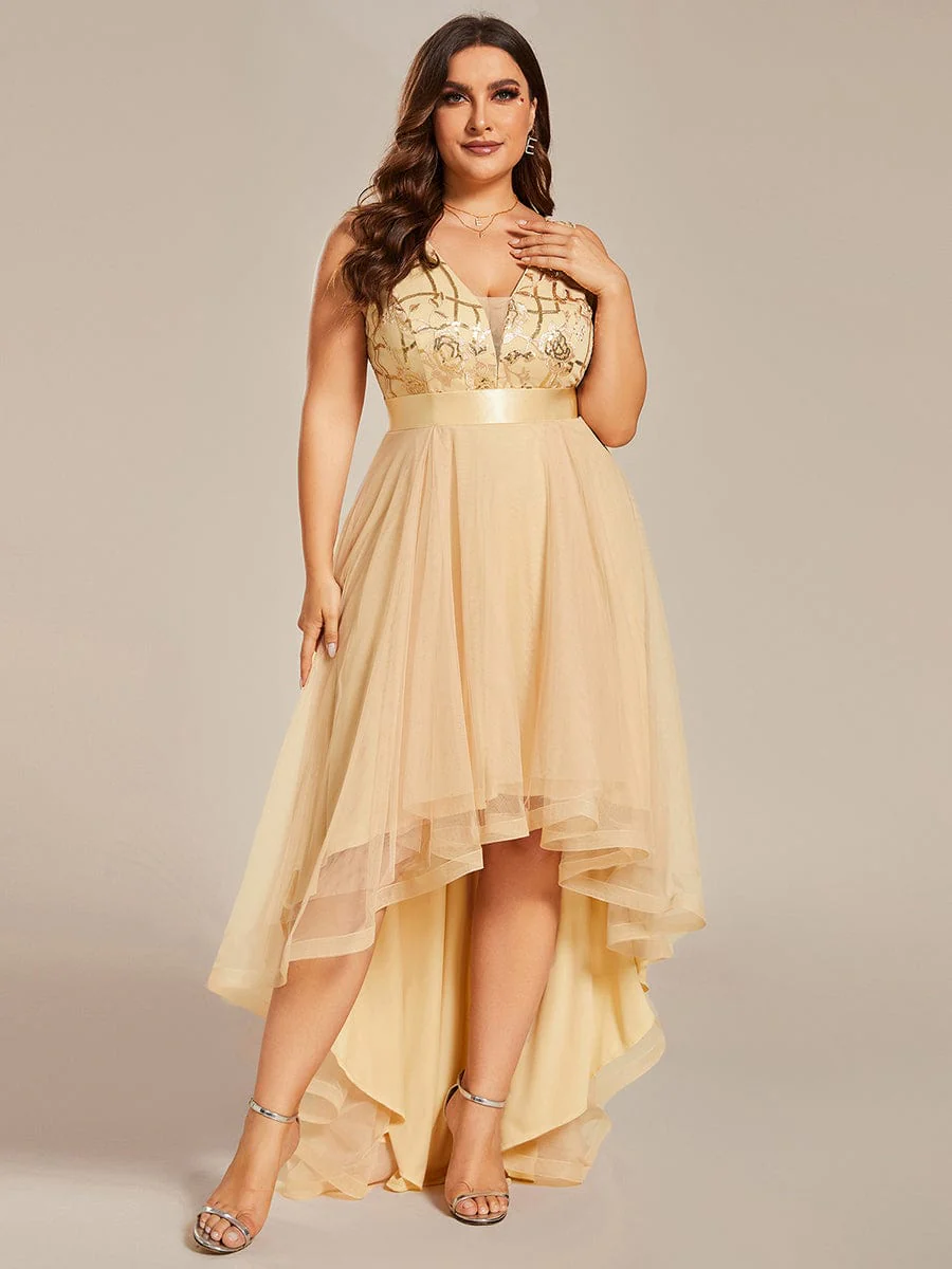 Plus Size Sequin High-Low Deep V Neck Tulle Evening Dresses