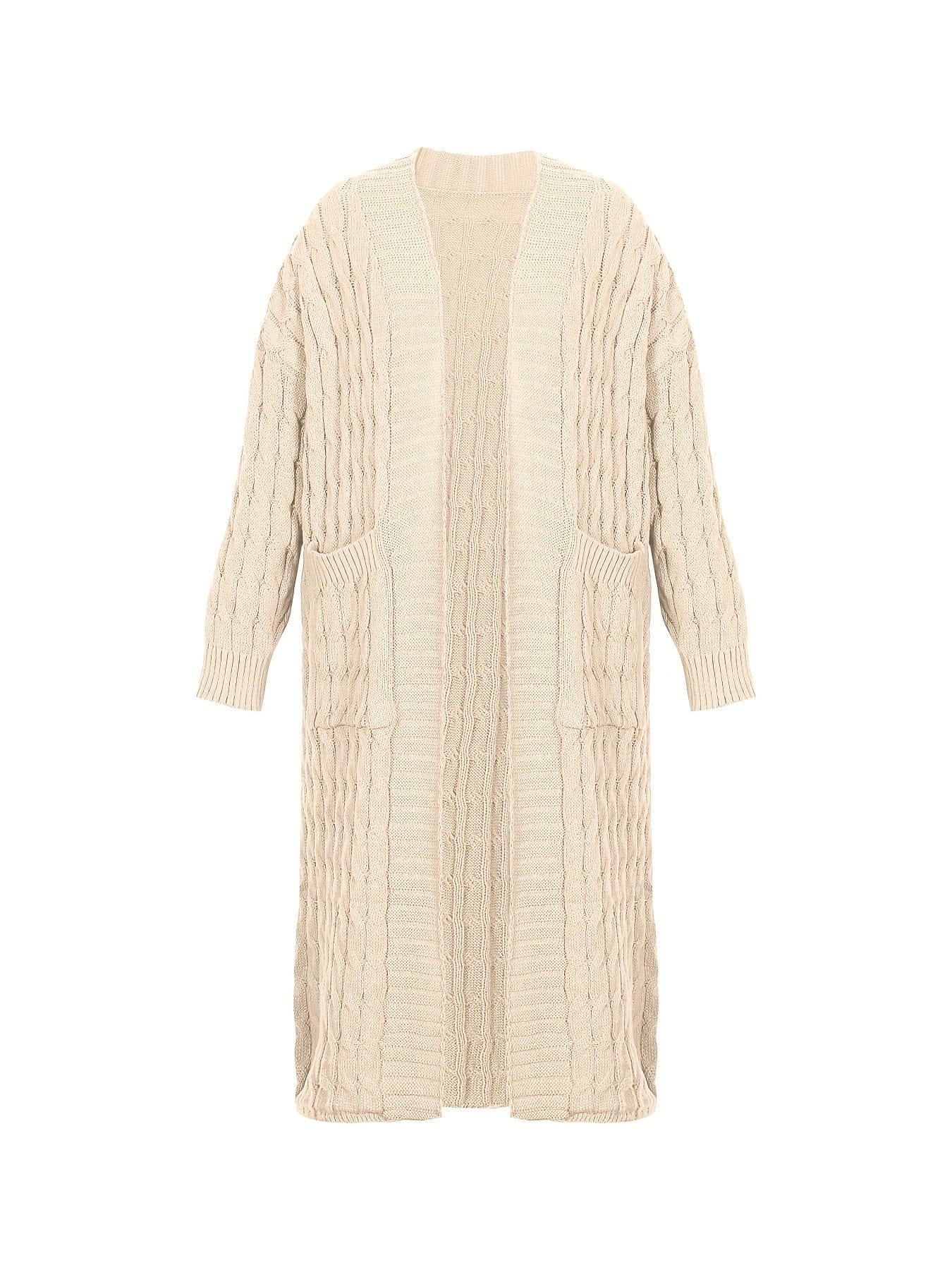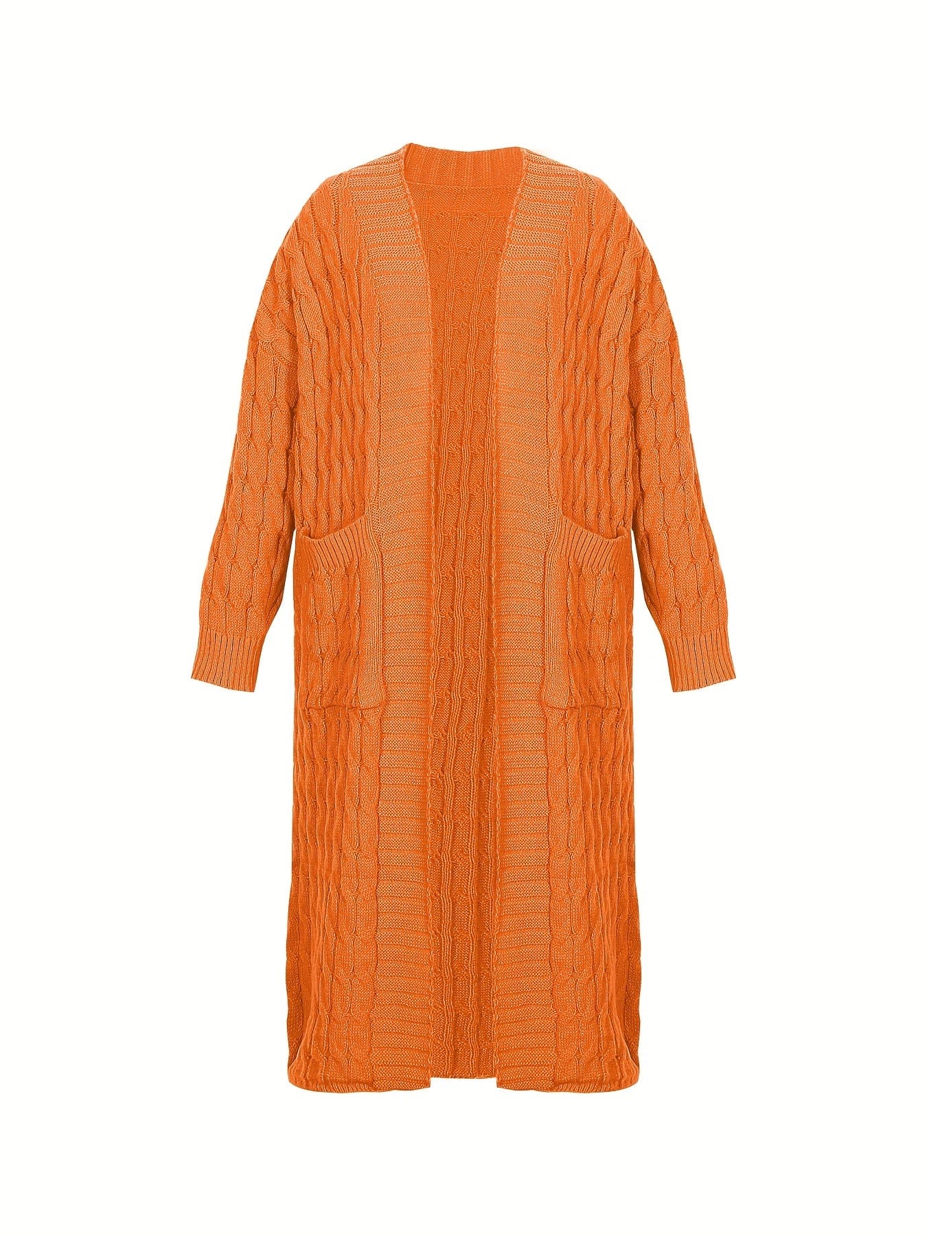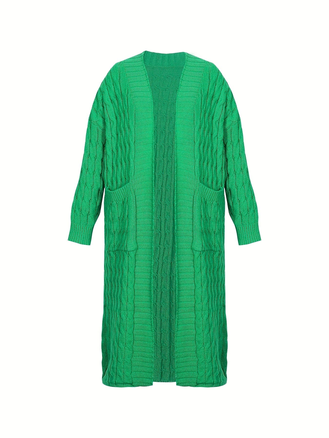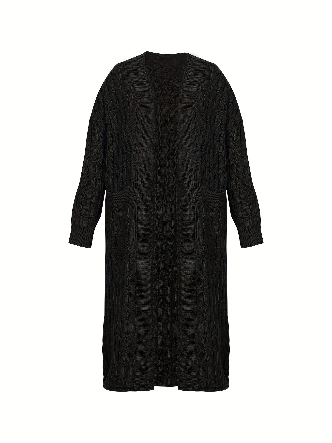 Plus Size Casual Cardigan, Women's Plus Cable Knitted Long Sleeve Open Front Medium Stretch Sweater Cardigan With Pockets