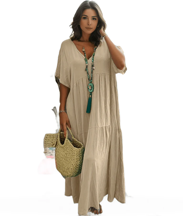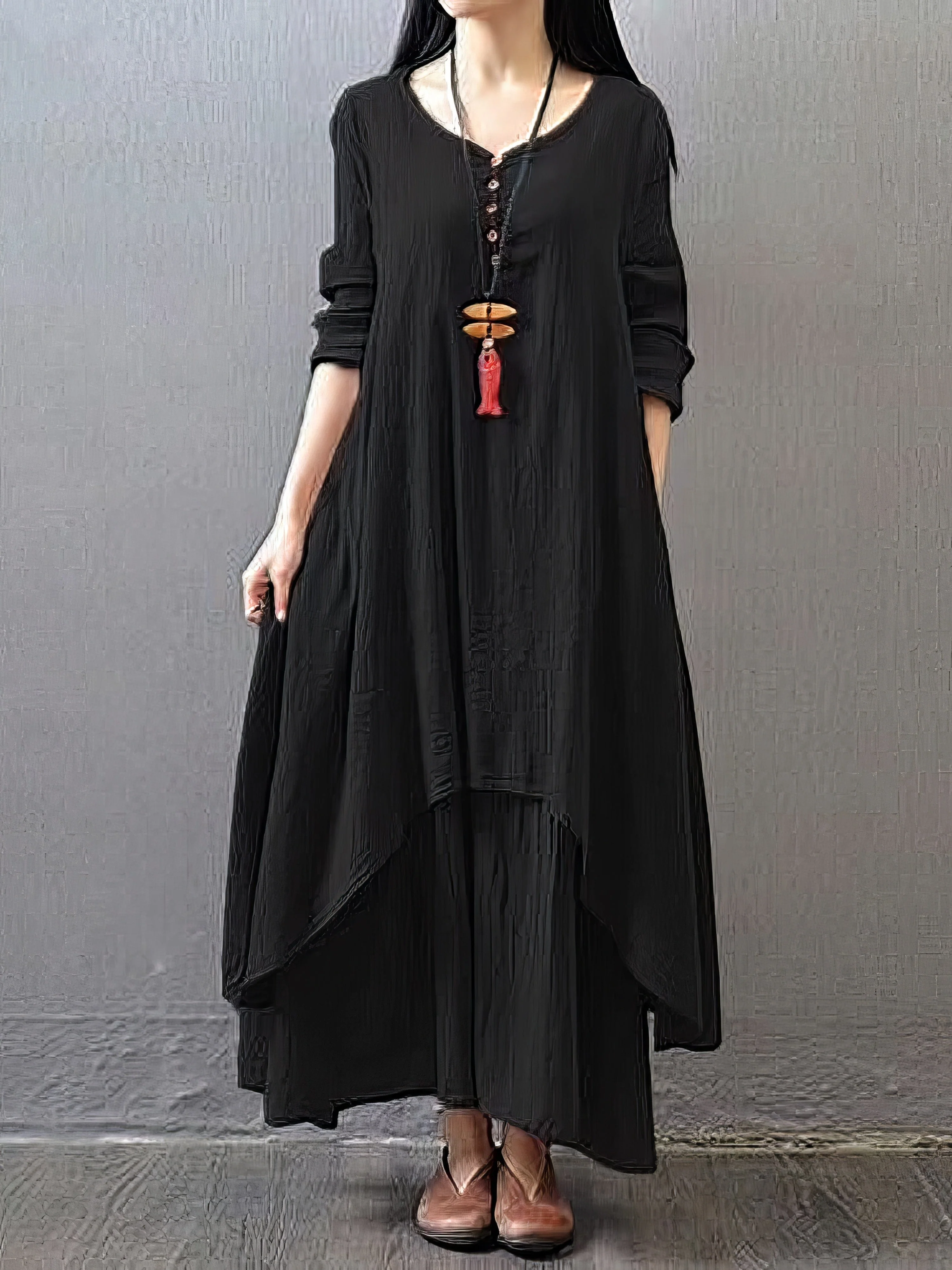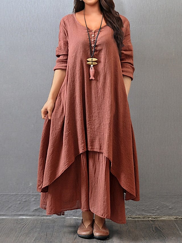 Women's Plus Size Casual Dress Swing Dress Solid Color Long Dress Maxi Dress Long Sleeve Button Fake Two Piece V Neck