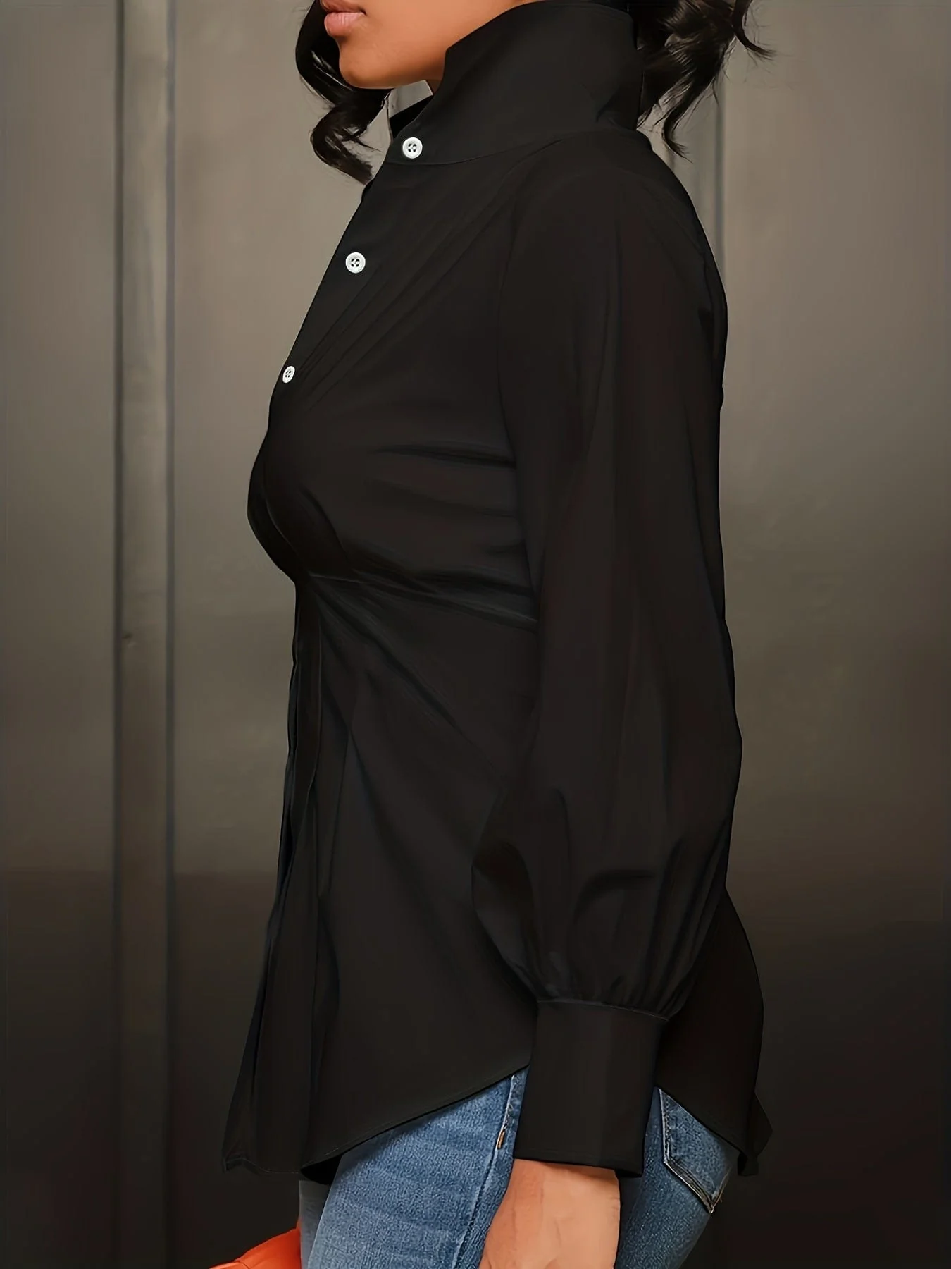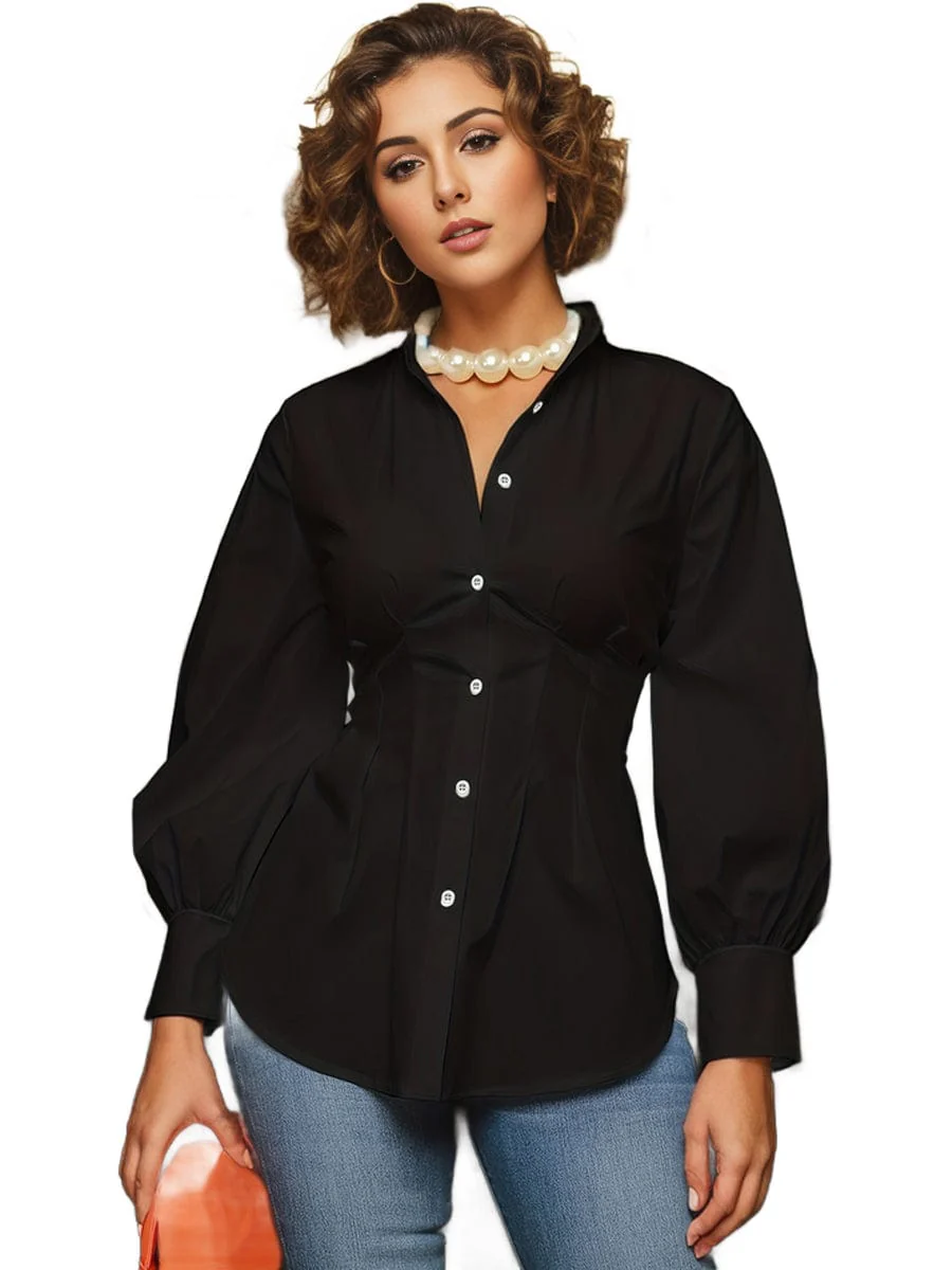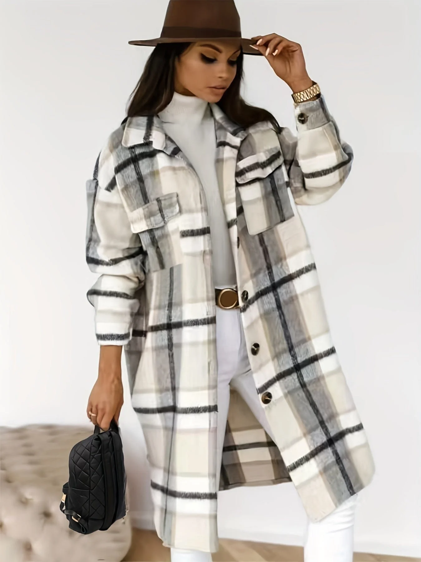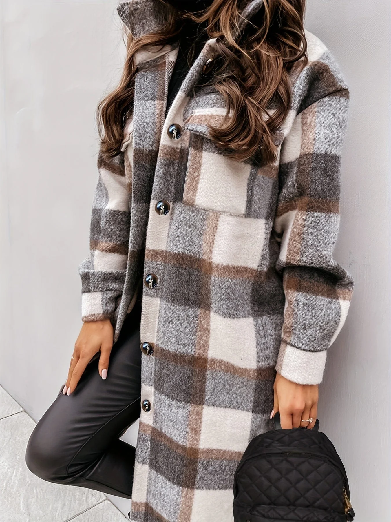 Plus Size Casual Coat, Women's Plus Plaid Print Long Sleeve Lapel Collar Button Up Shacket Jacket