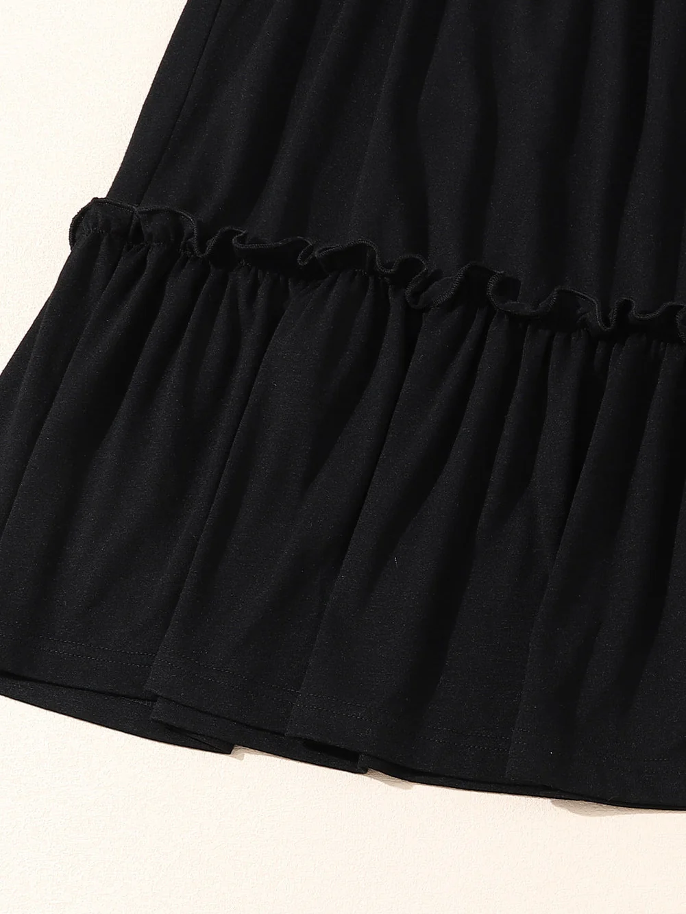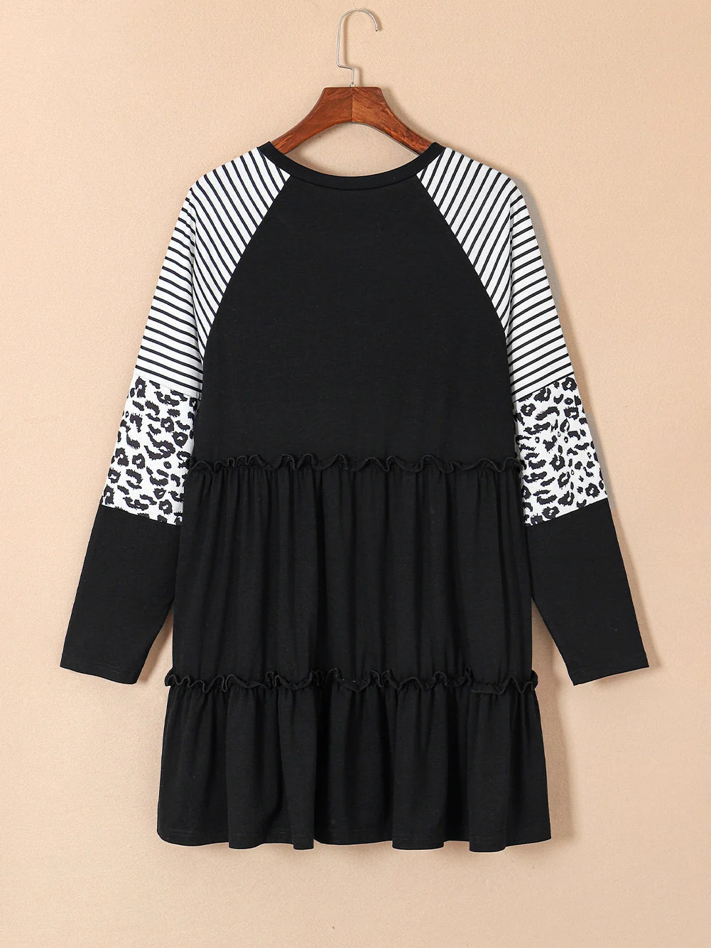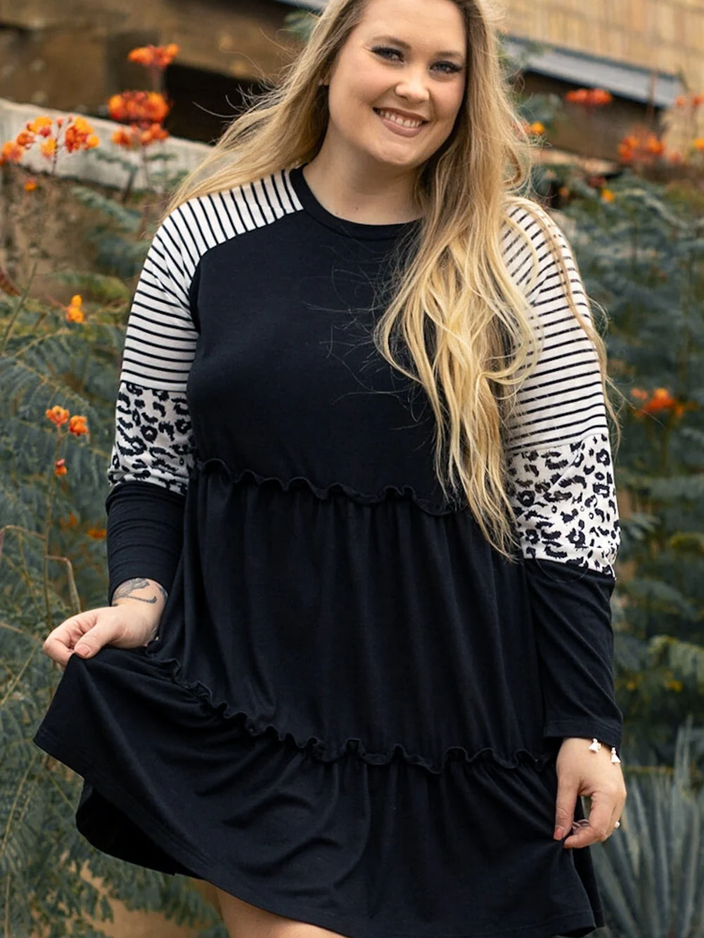 Black Plus Size Striped Leopard Patch Sleeve Ruffle Tiered Dress