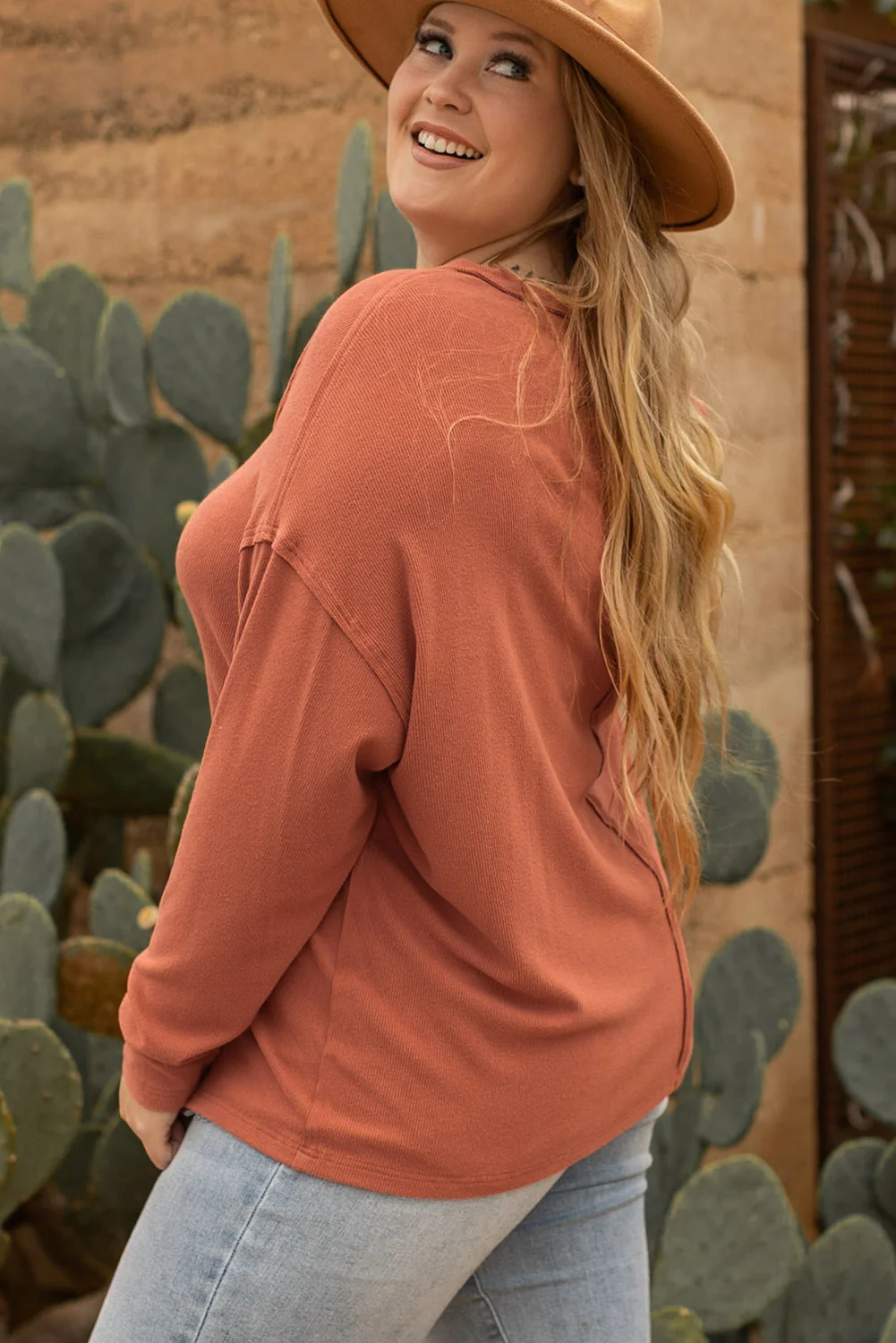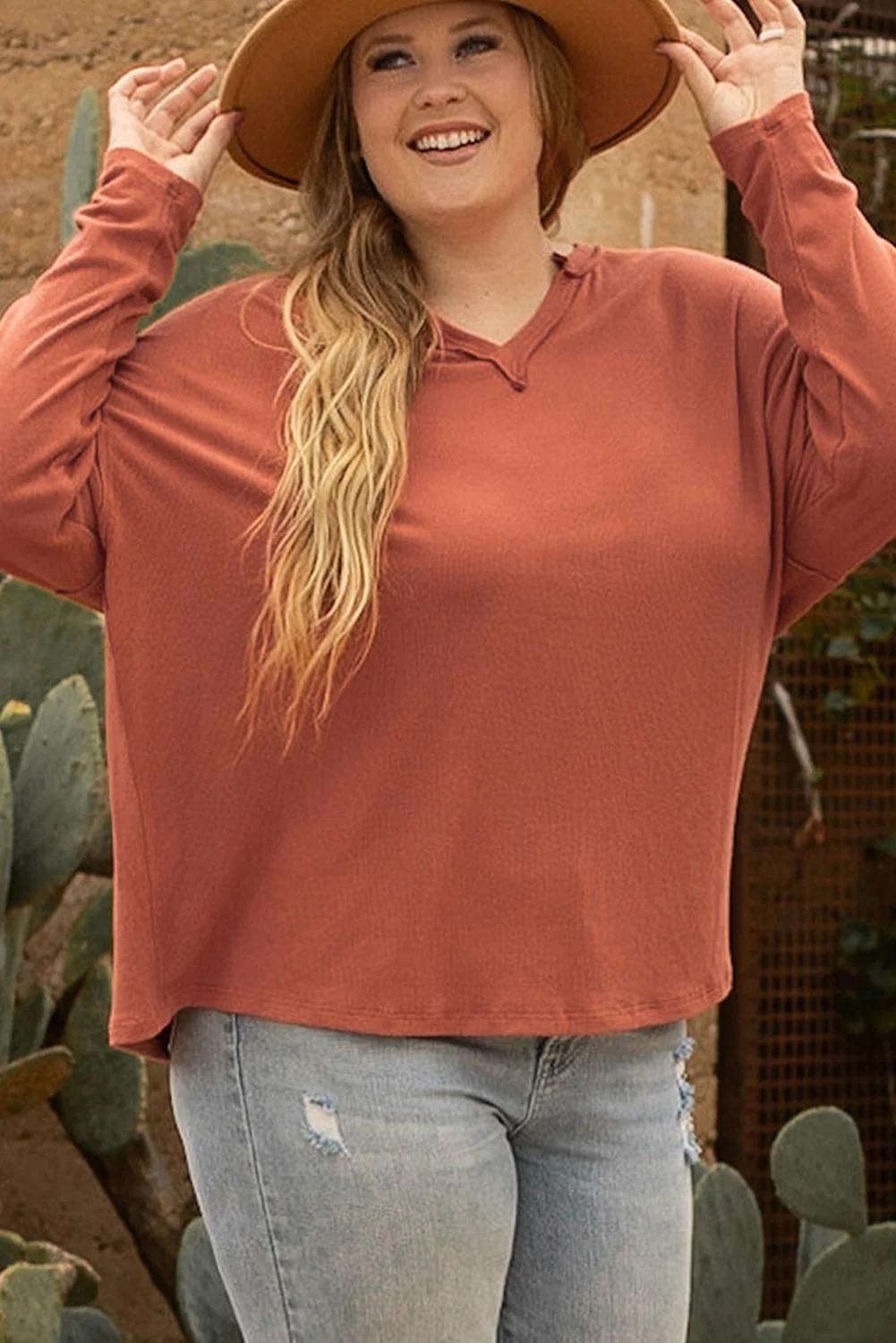 Gold Flame Plus Size Exposed Seam V Neck Long Sleeve Top
