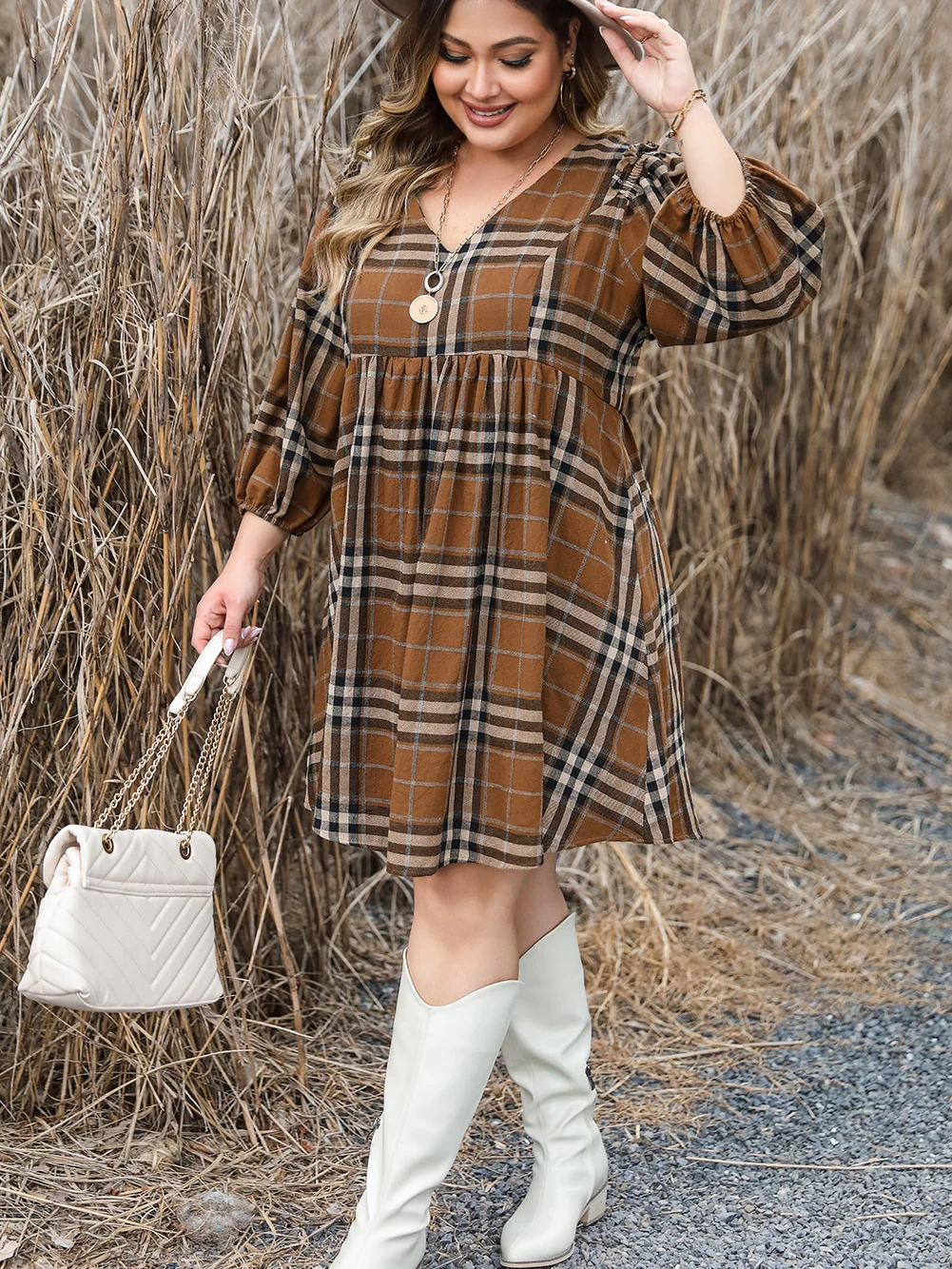 Brown Printed Plaid V Neck Plus Size Babydoll Dress