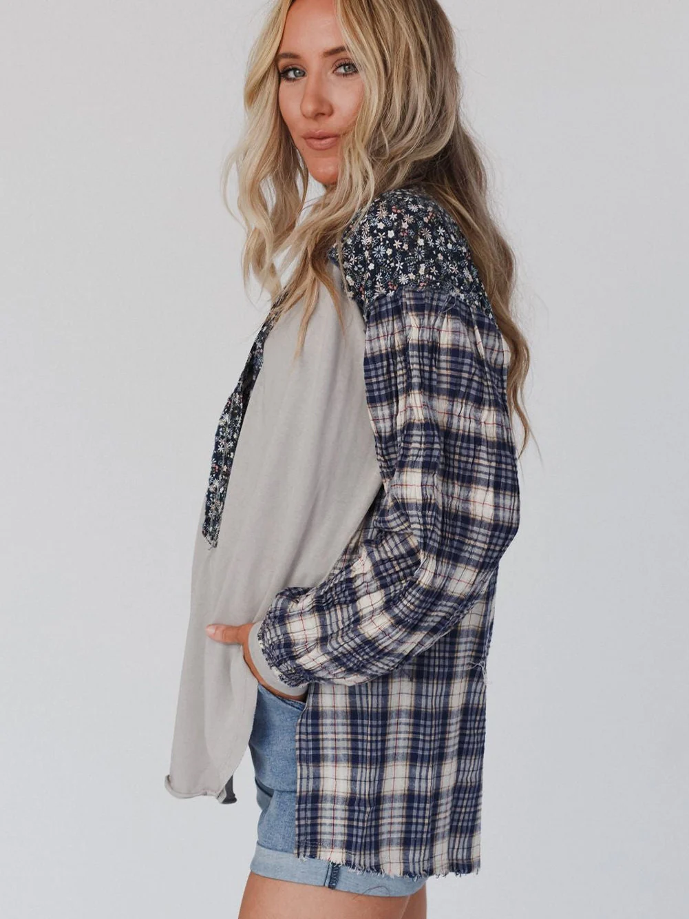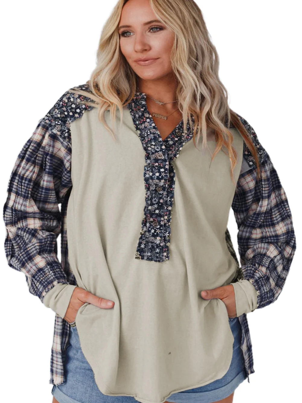 Navy Blue Mixed Print Half Buttons Plus Size Pullover Top