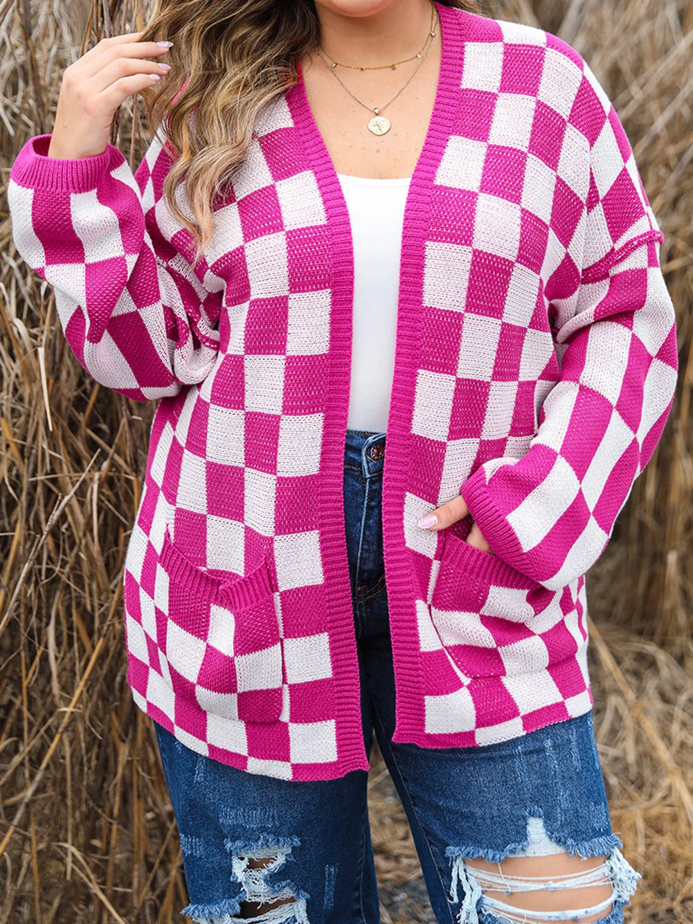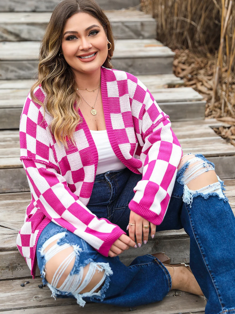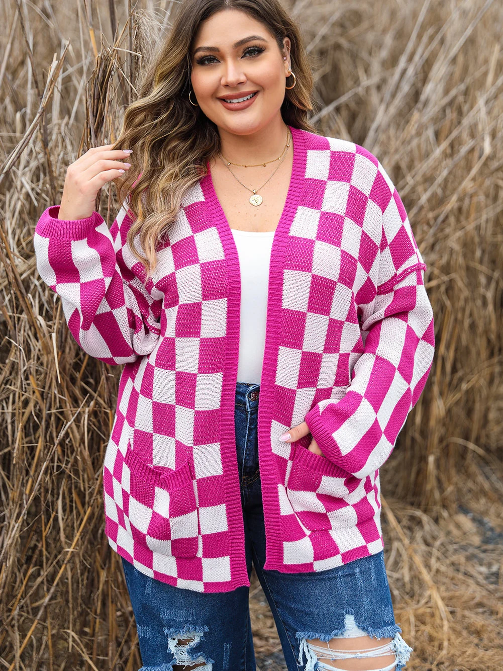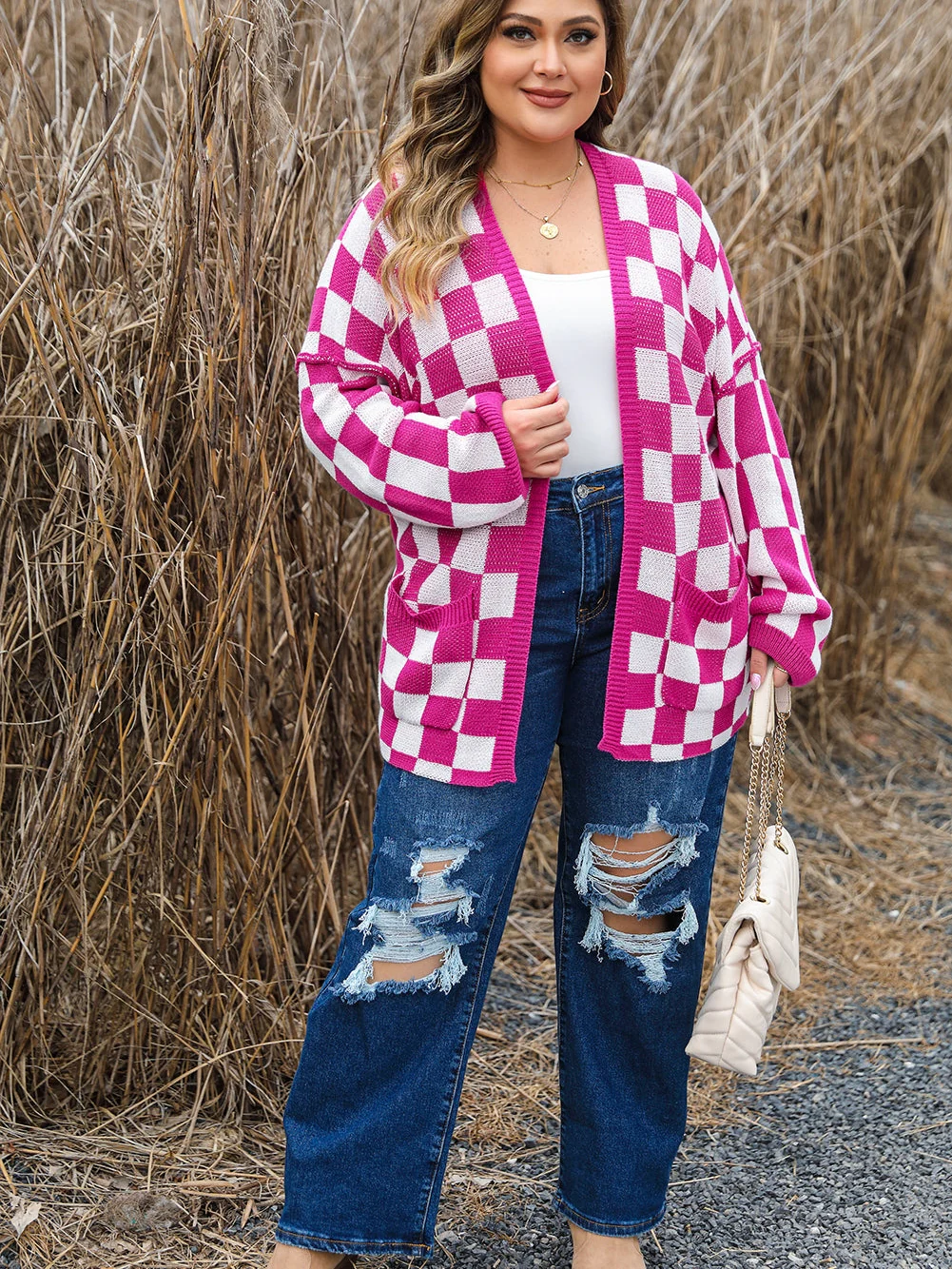 Bonbon Checkered Pattern Open Front Plus Size Cardigan