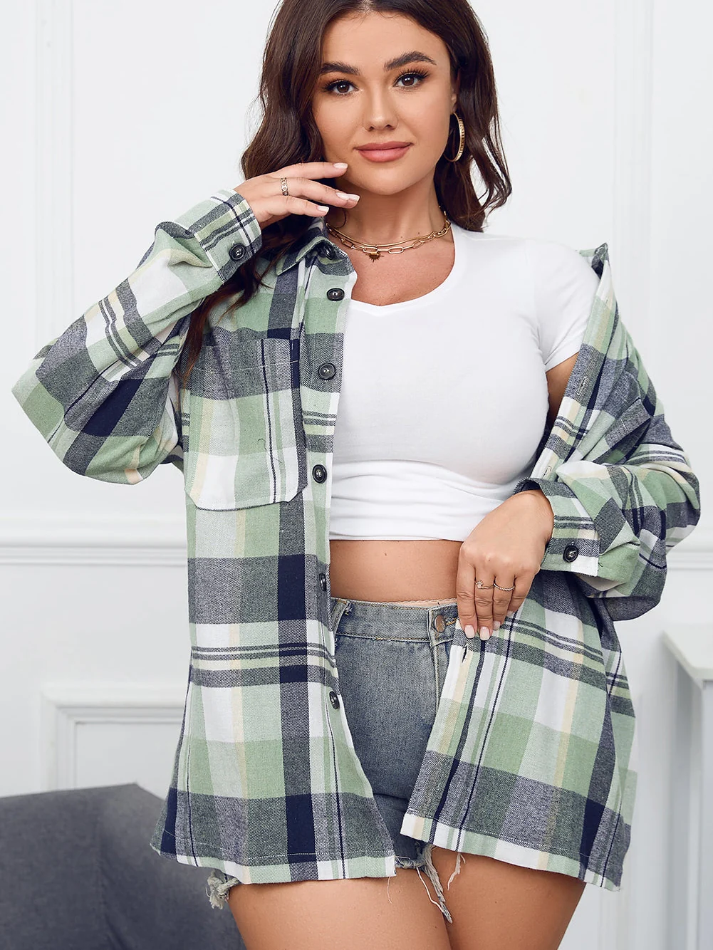 Green Printed Plus Size Chest Pocket Plaid Shirt