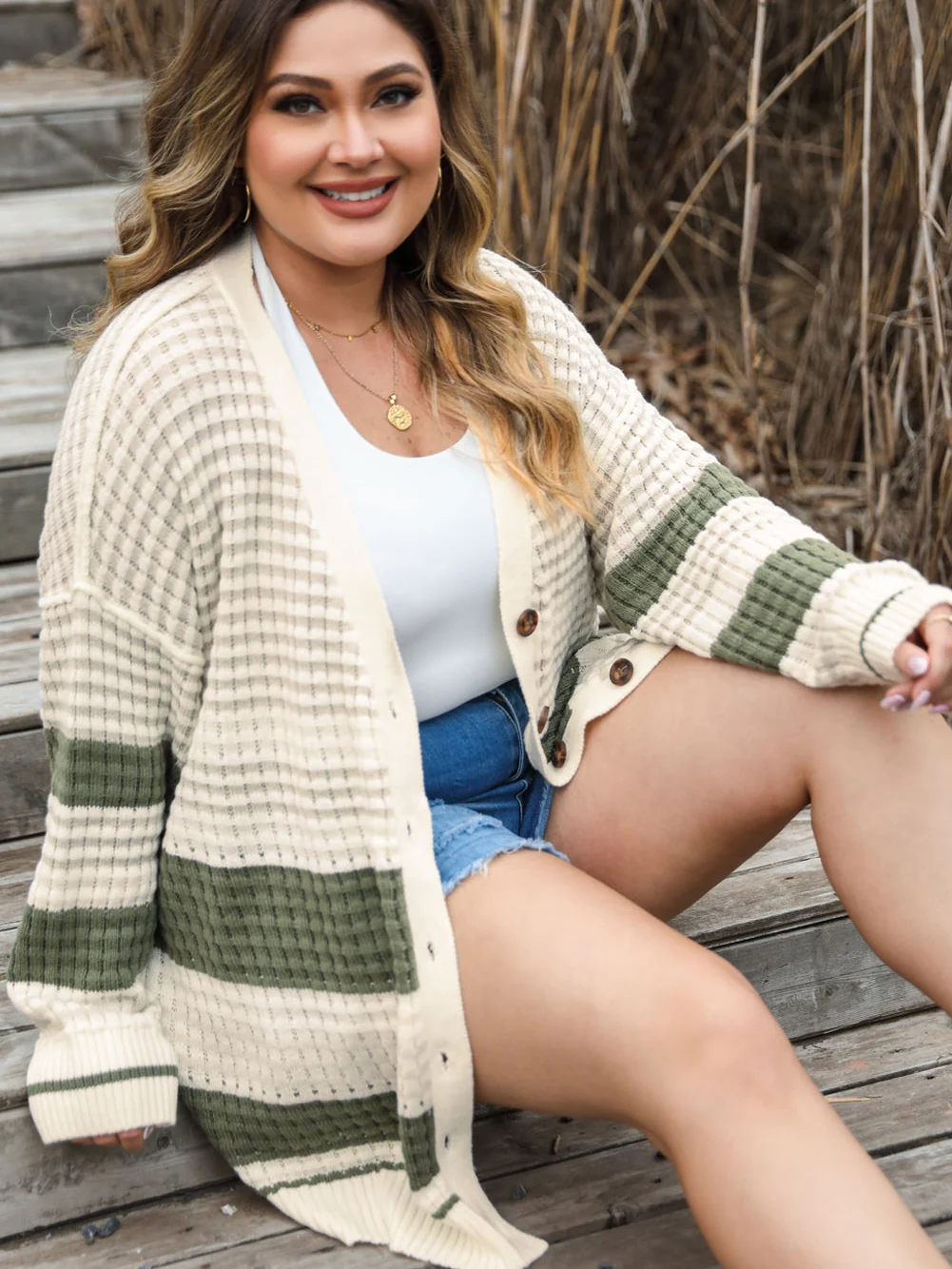 White Plus Size Color Block Cable Knit Buttoned Cardigan