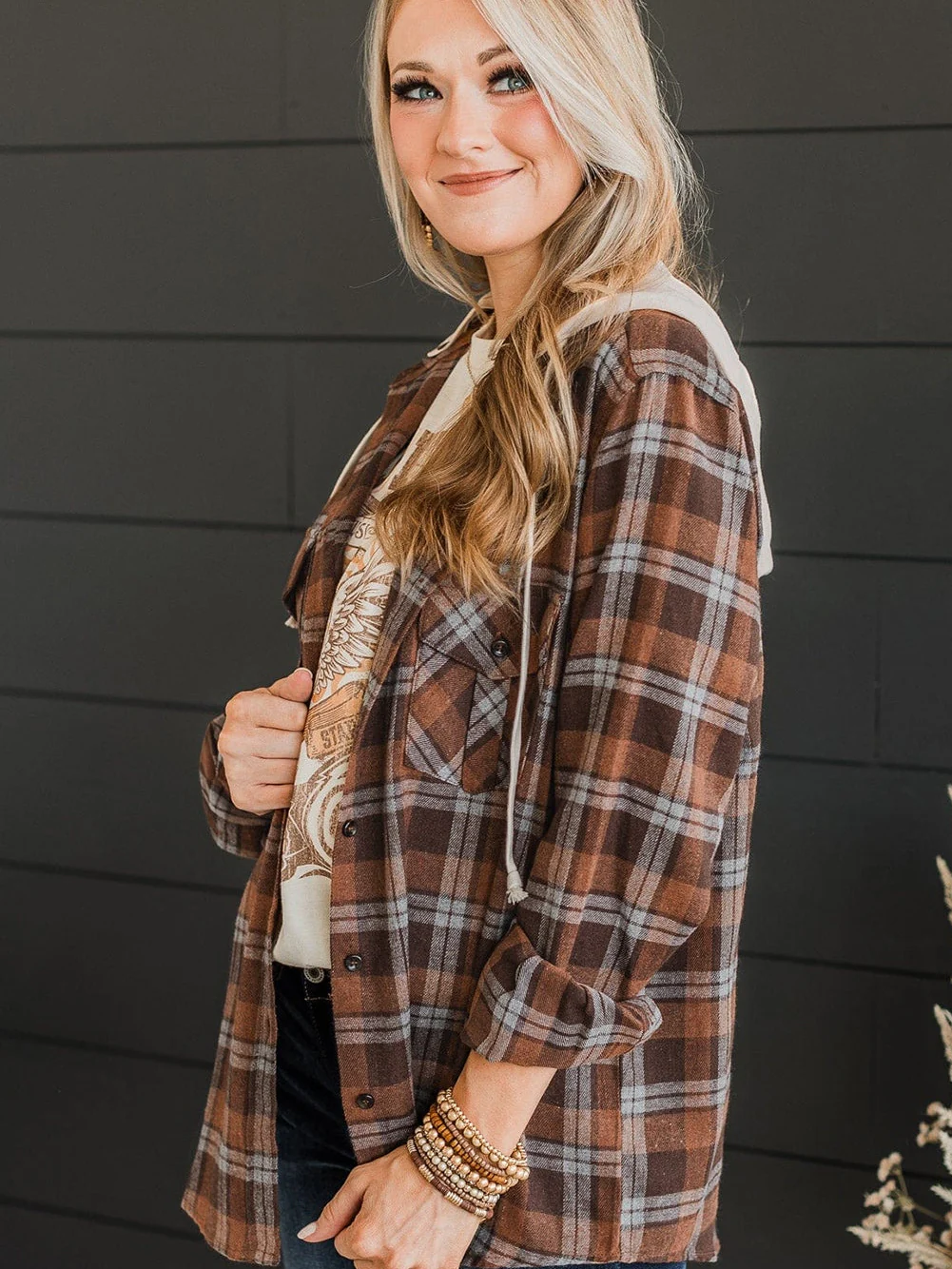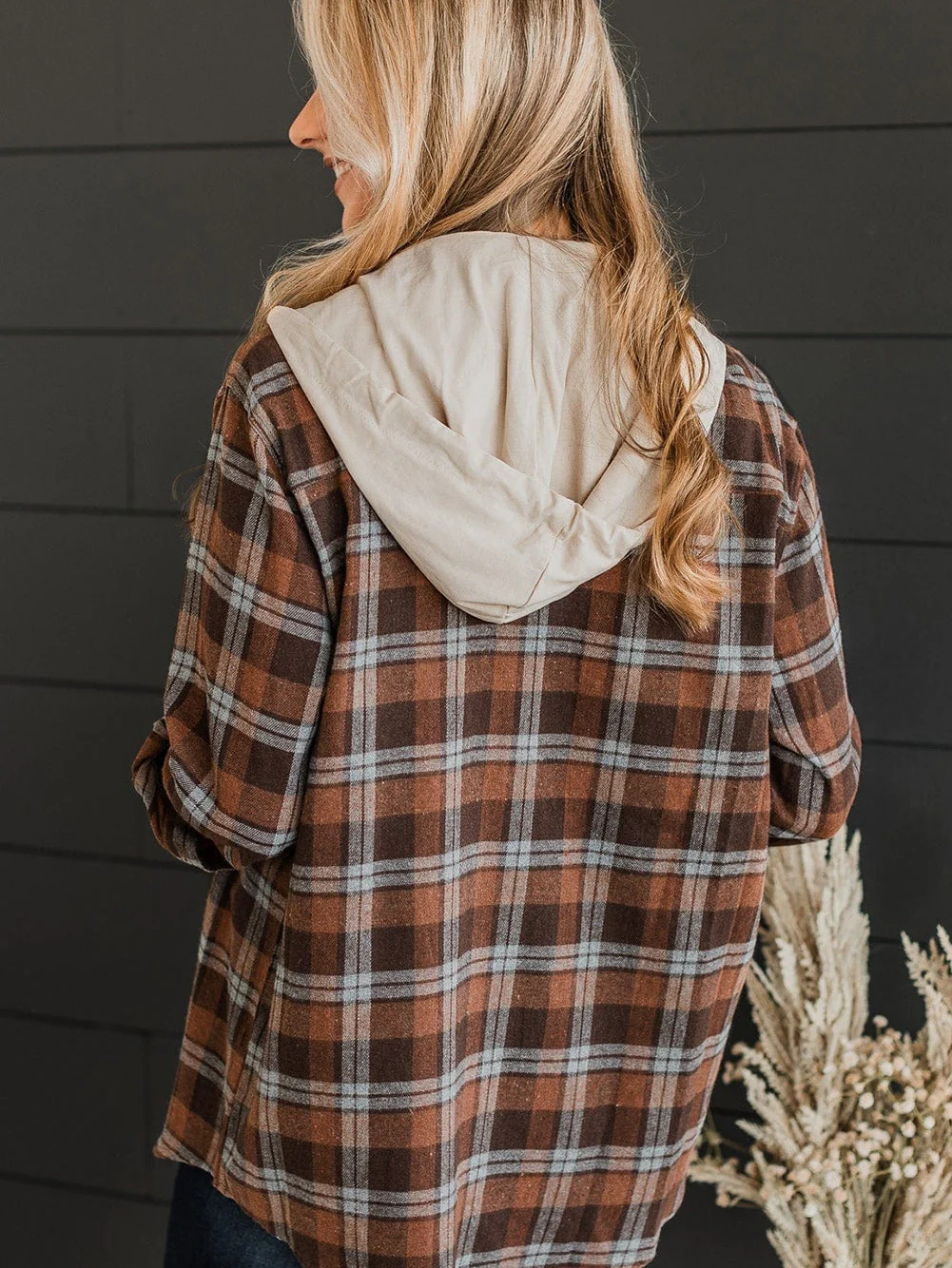Brown Plus Size Plaid Contrast Button up Hooded Jacket