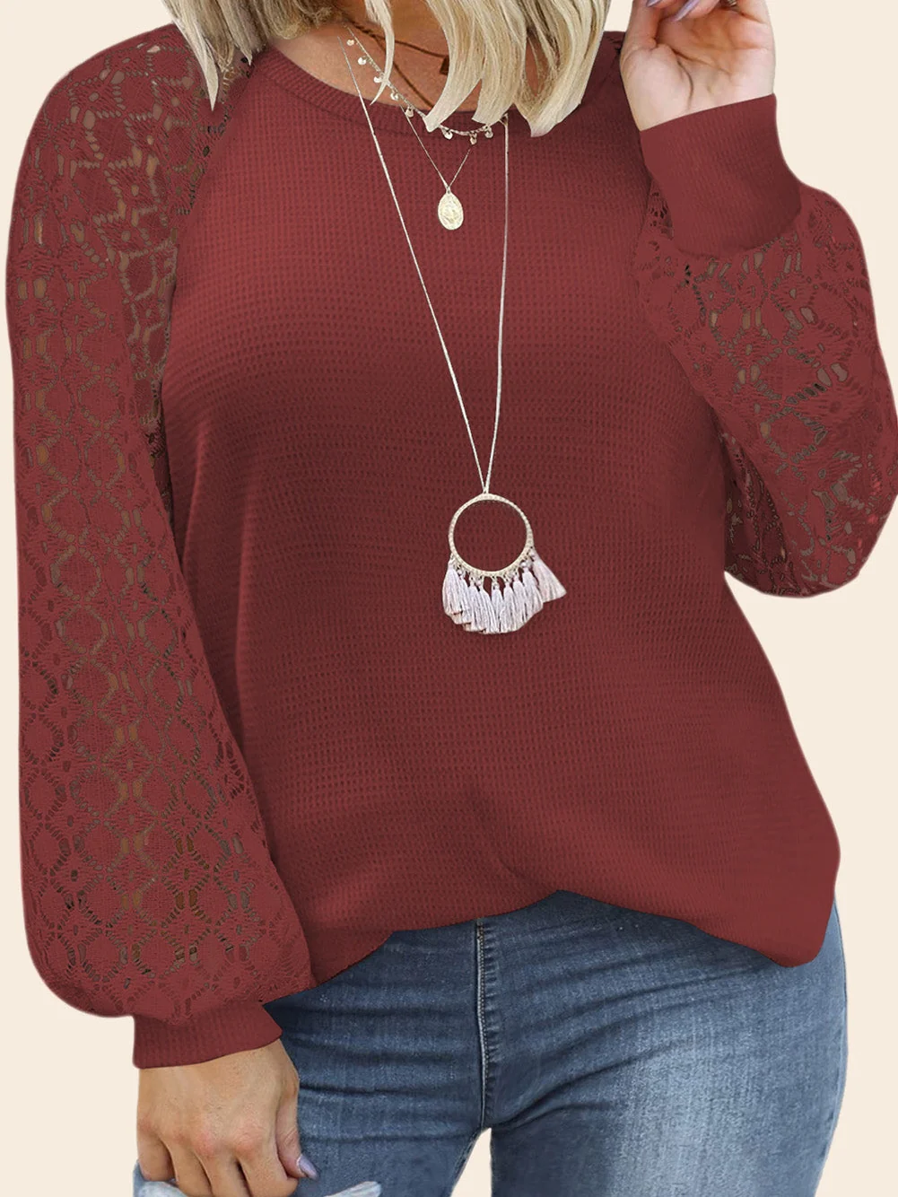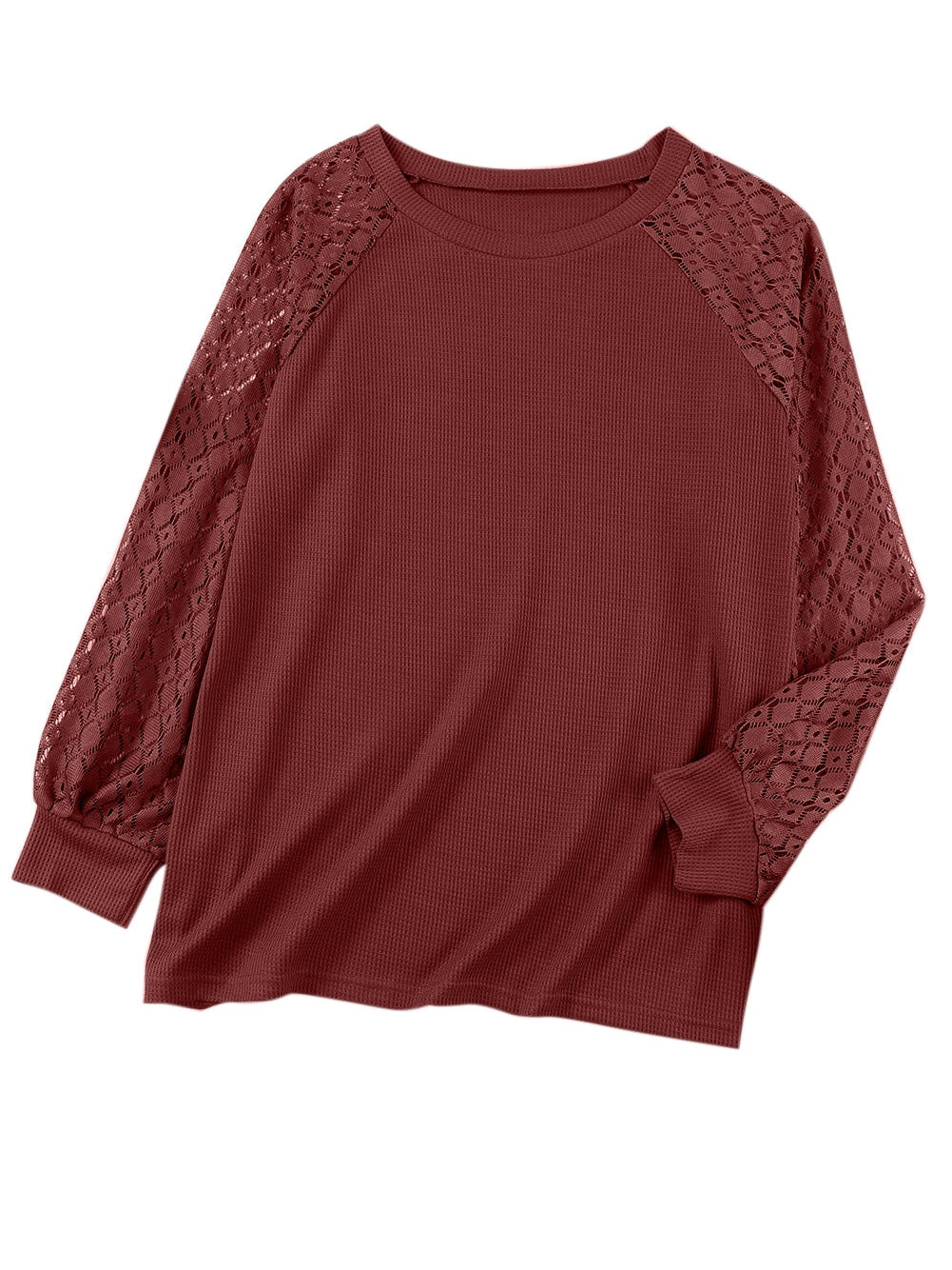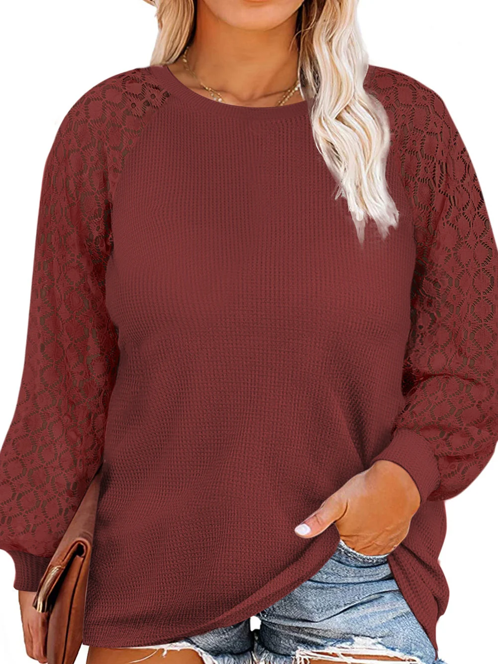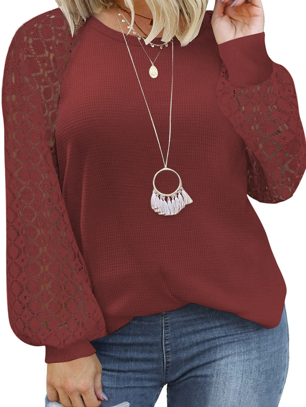 Red Plus Size Contrast Lace Sleeve Waffle Knit Top