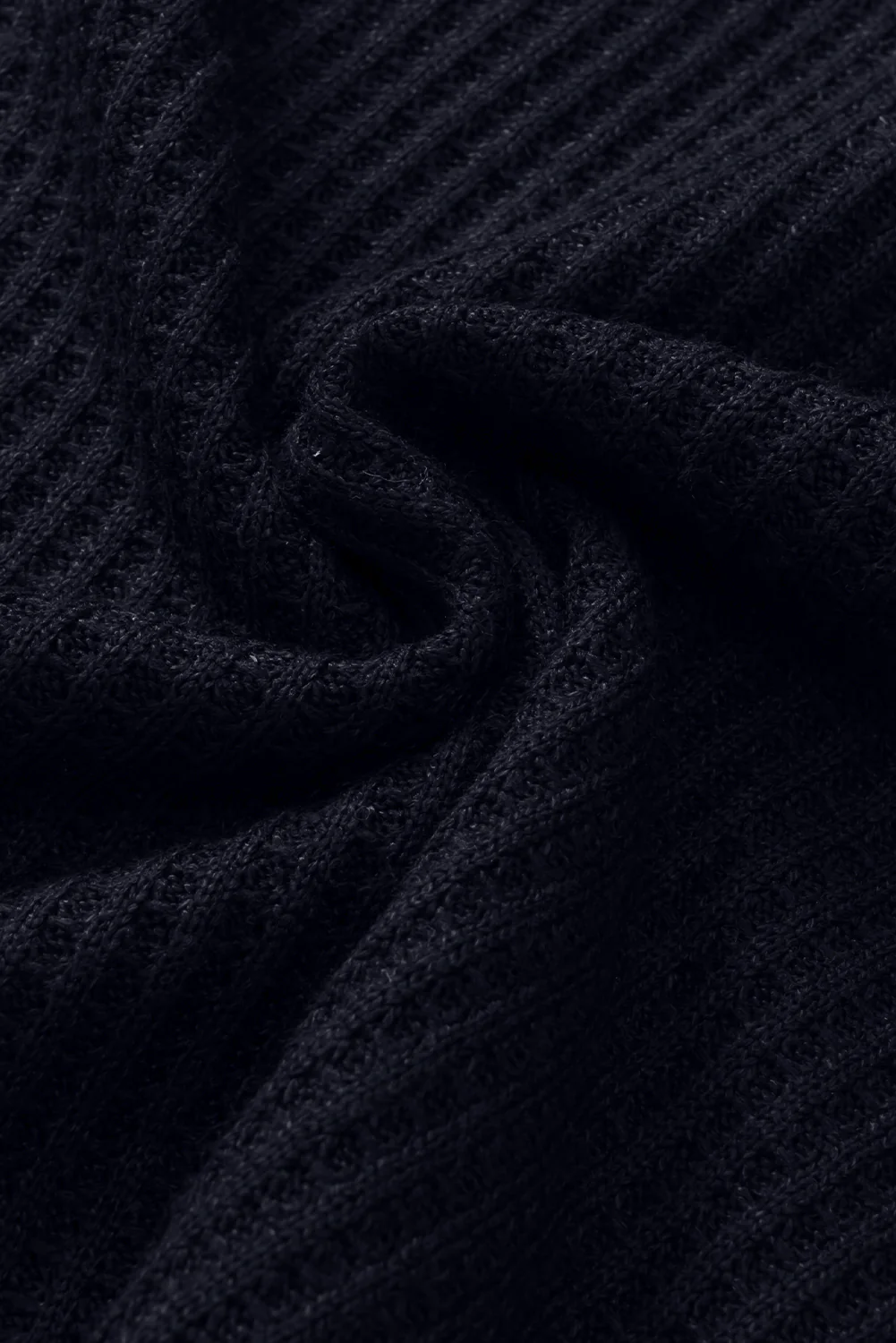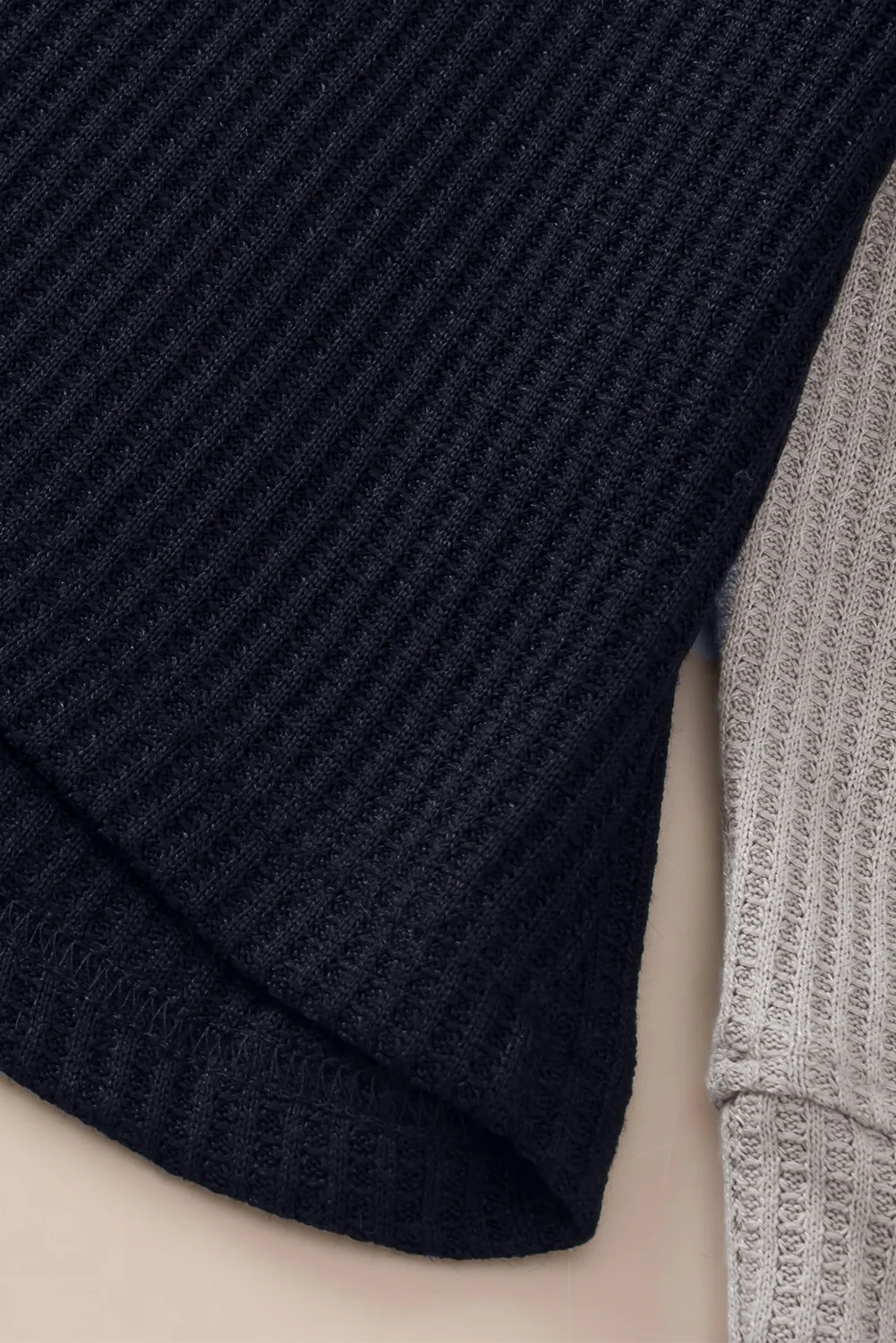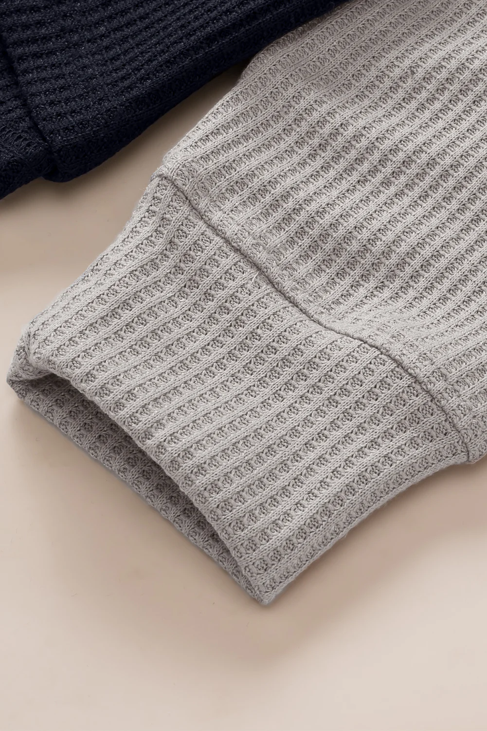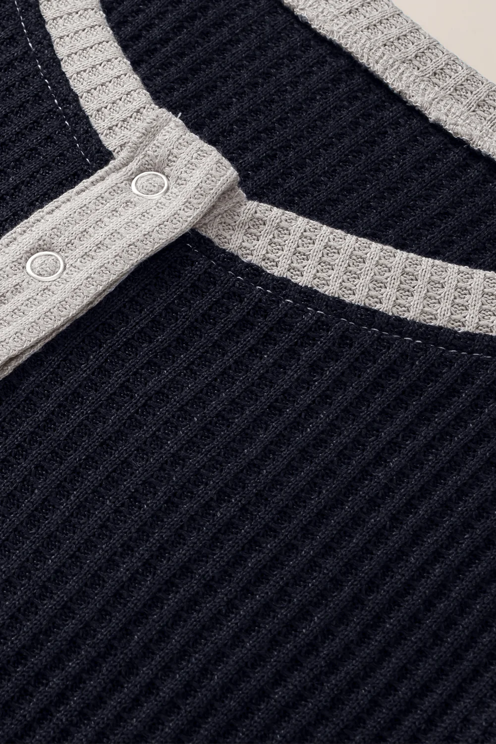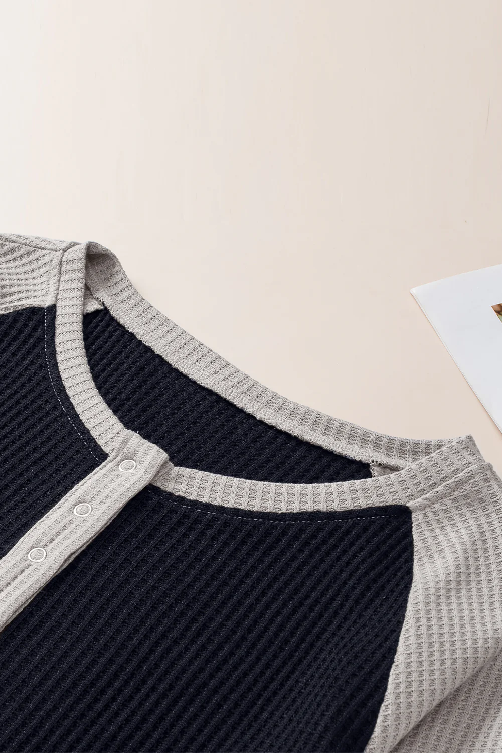 Black Color Contrast Waffle Knit Buttoned Plus Size Top