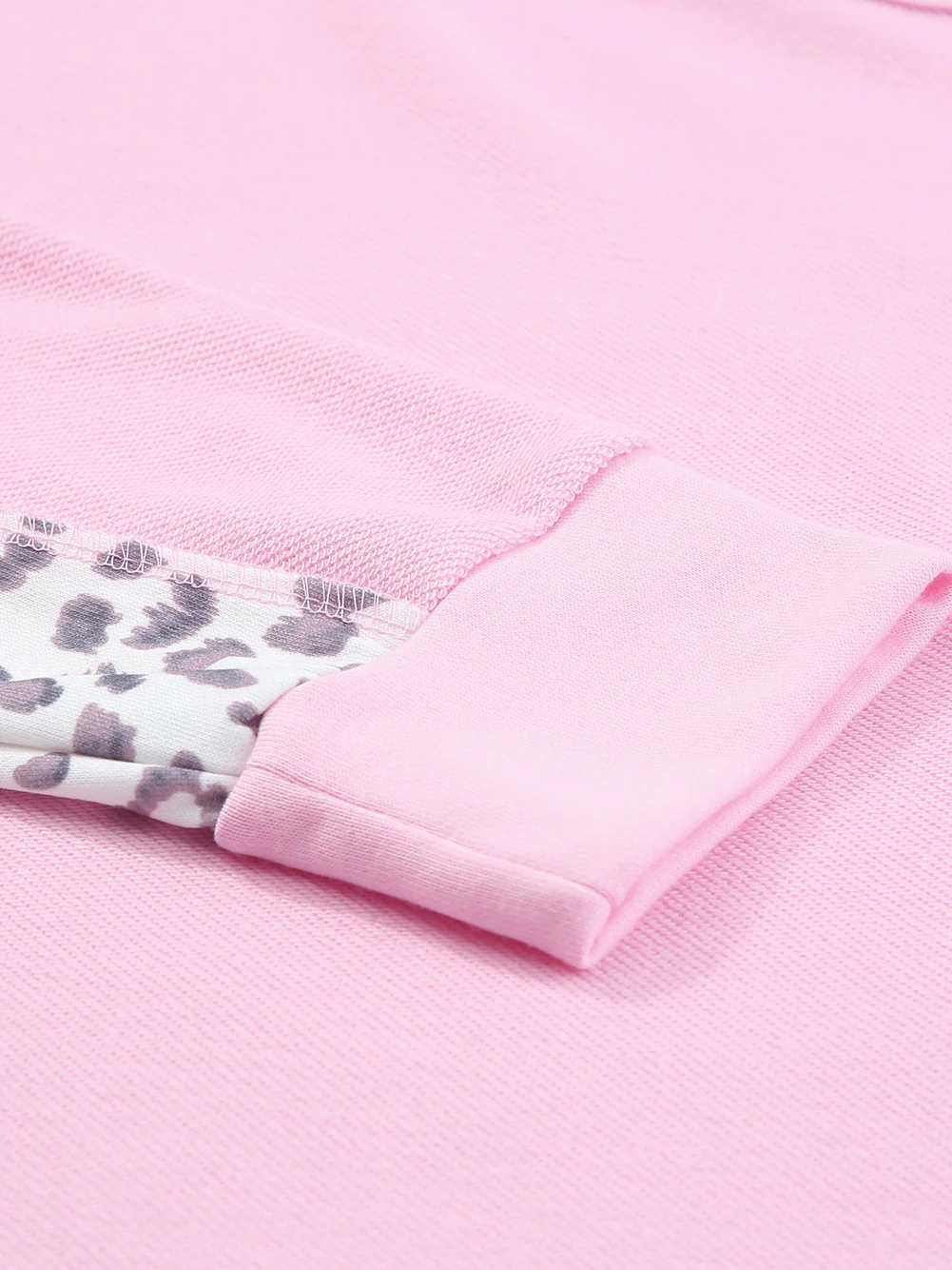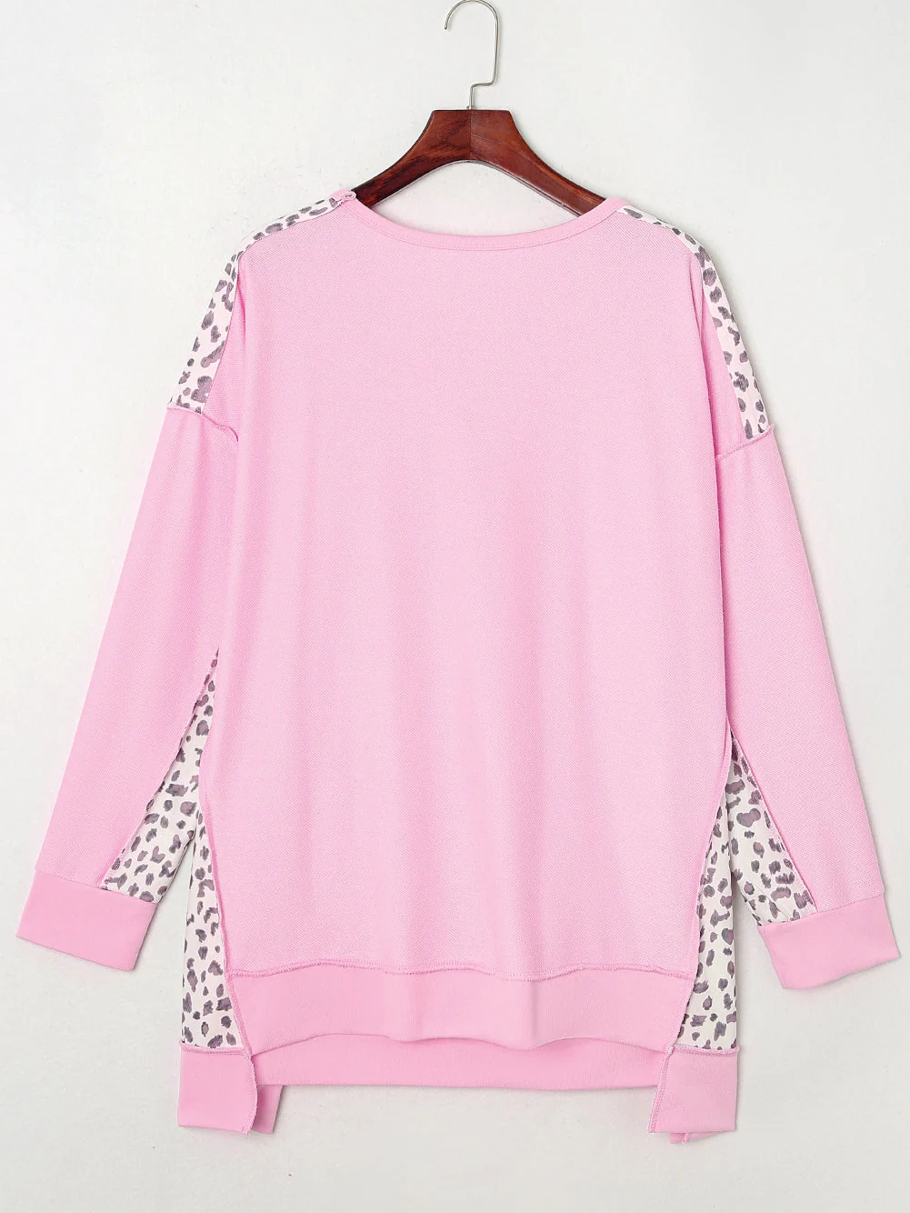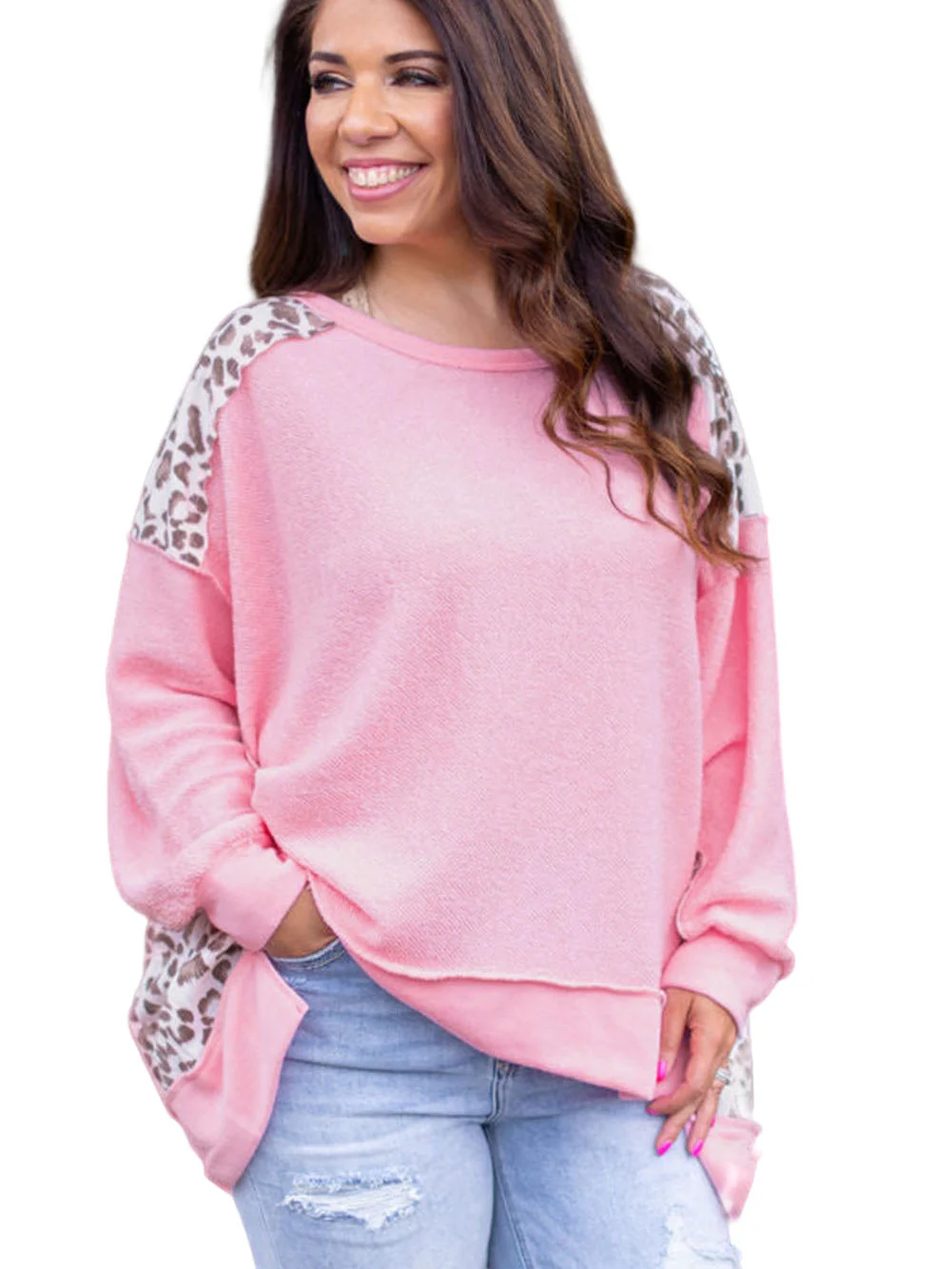 Pink Leopard Patchwork Plus Size Sweatshirt with Exposed Seams