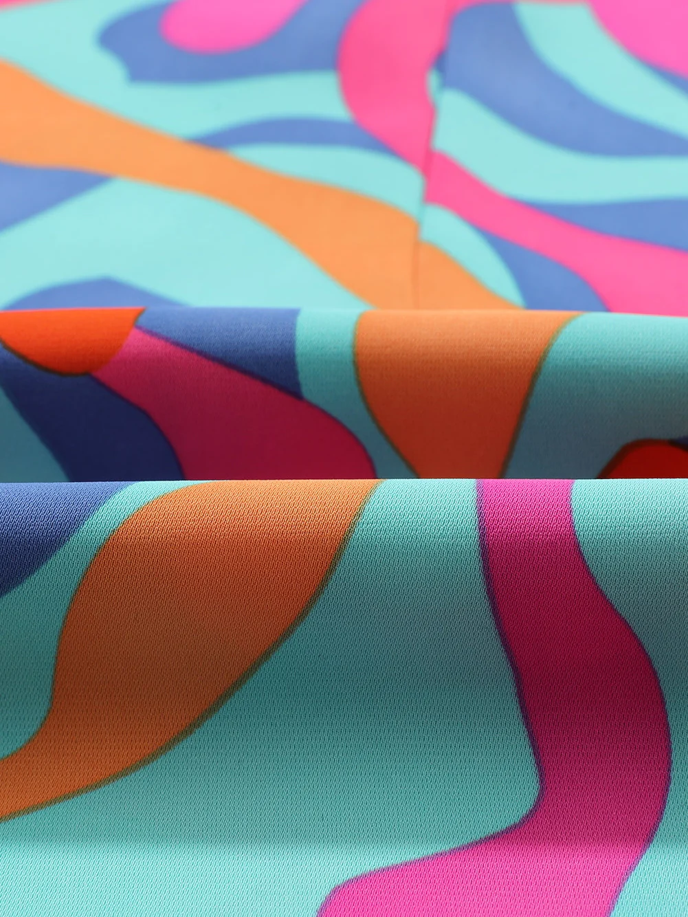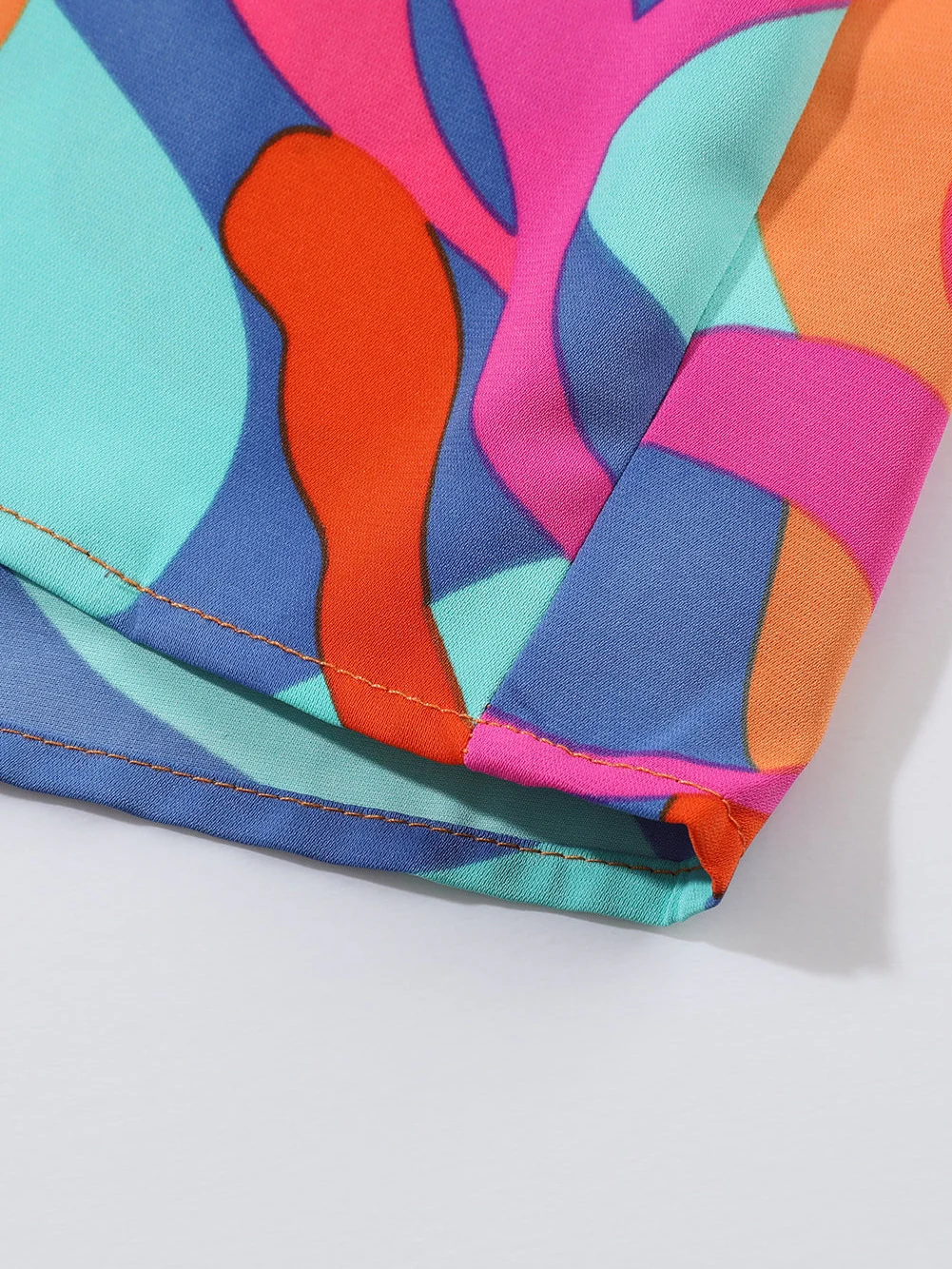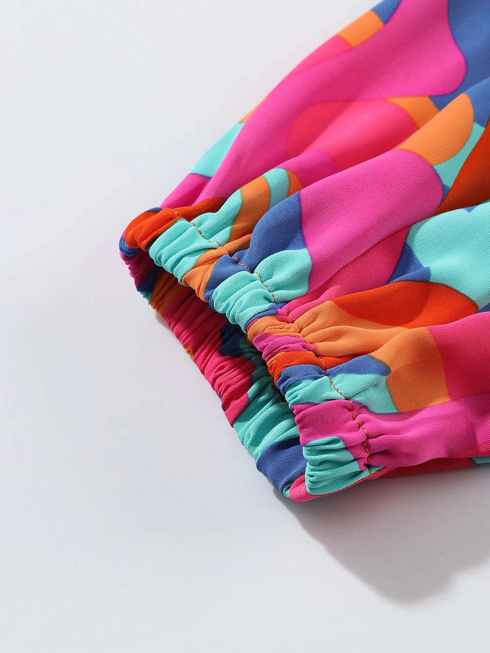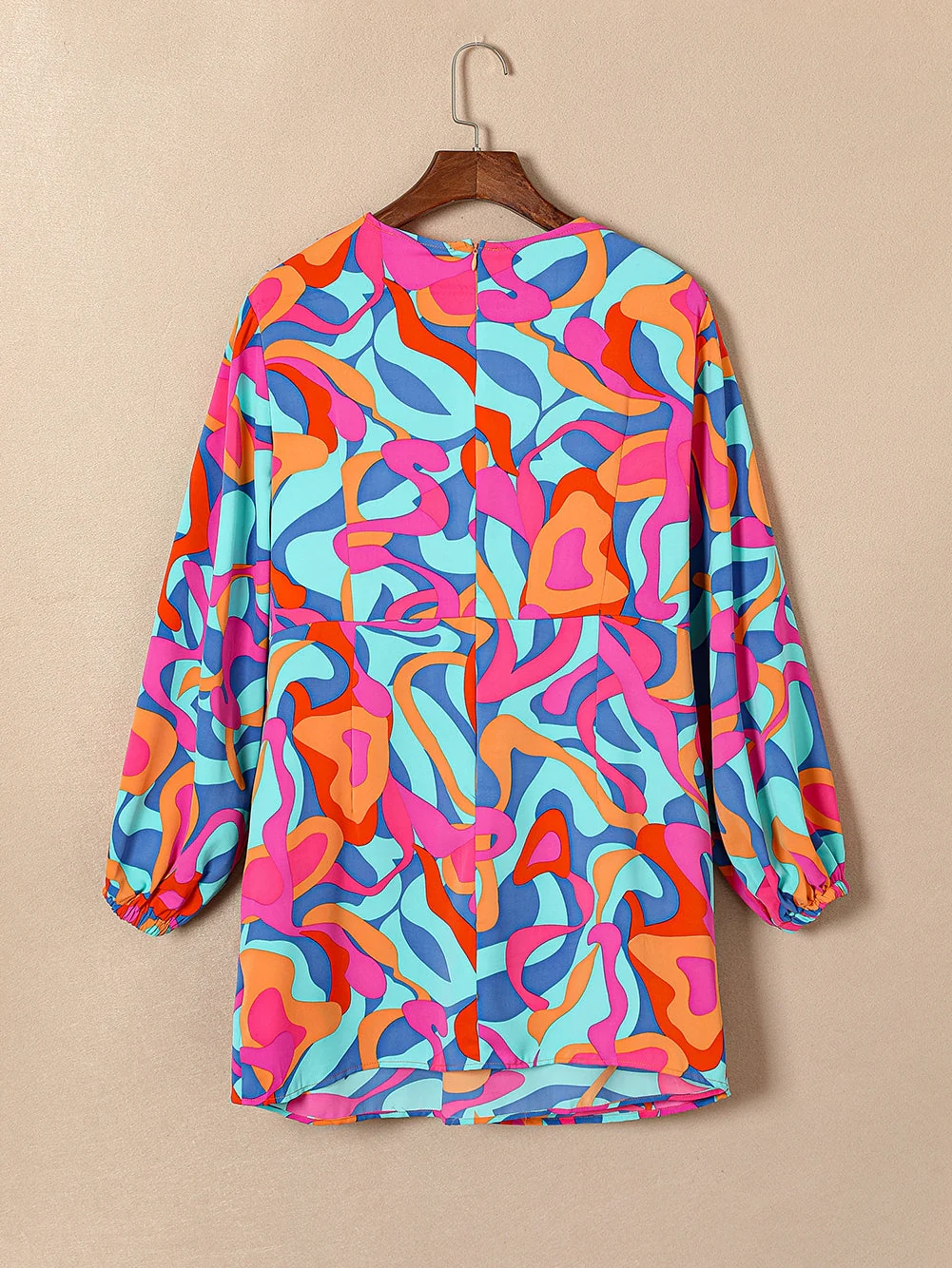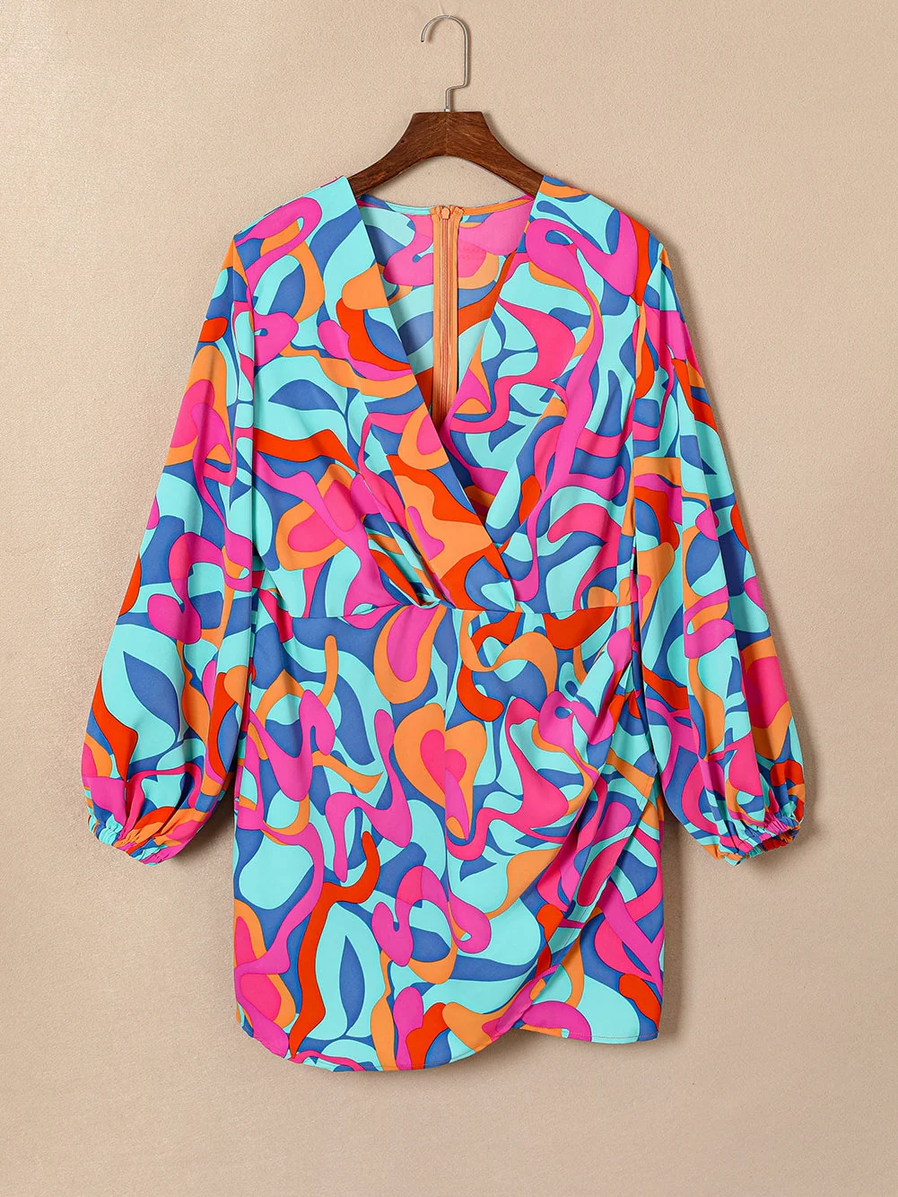Abstract Print Plus Size V-Neck Pleated Long Sleeve Dress