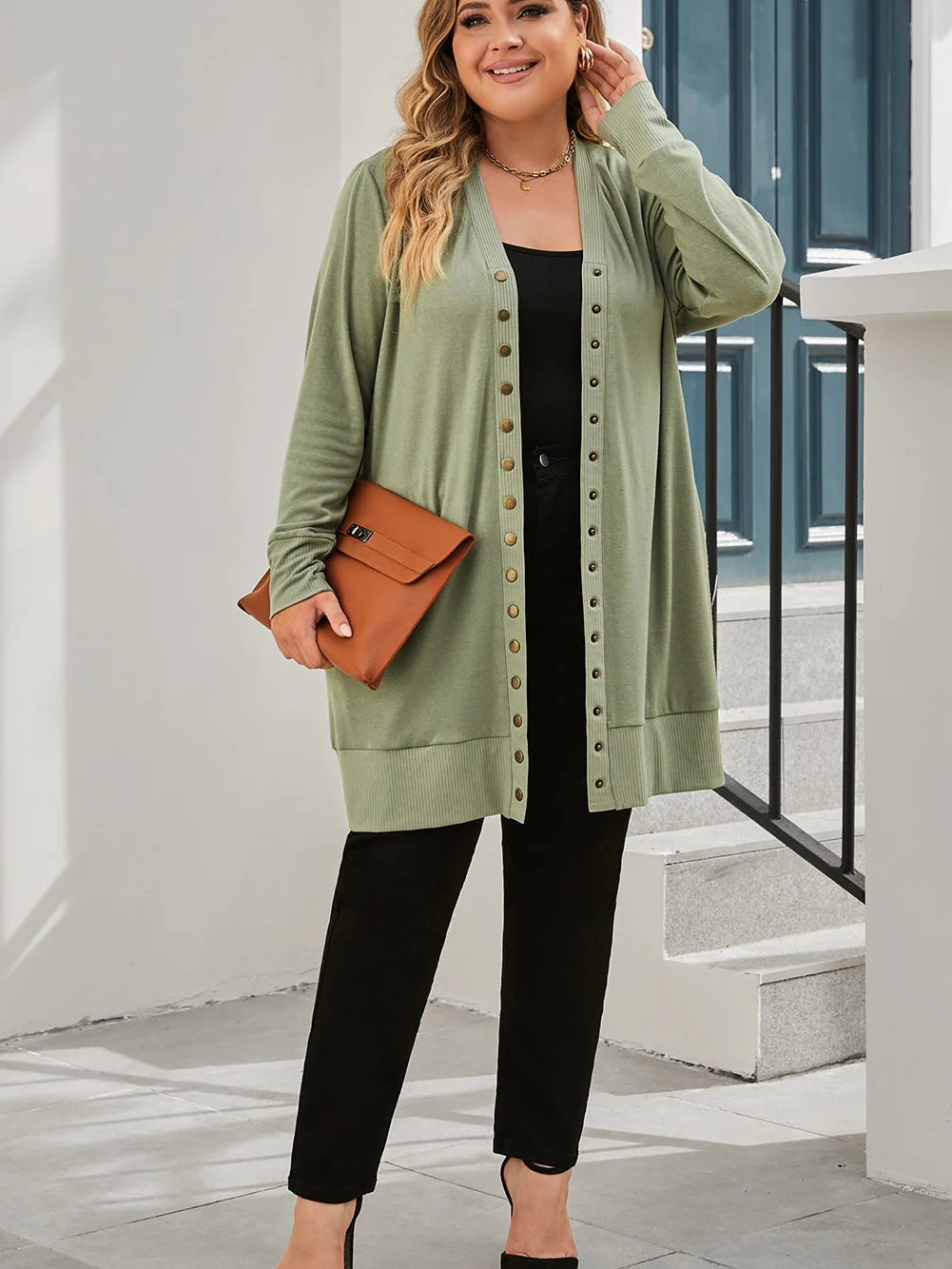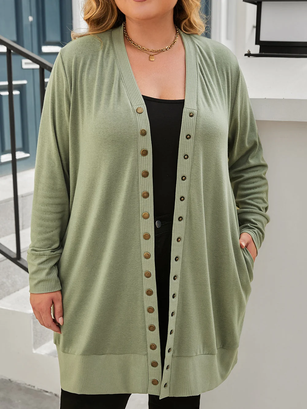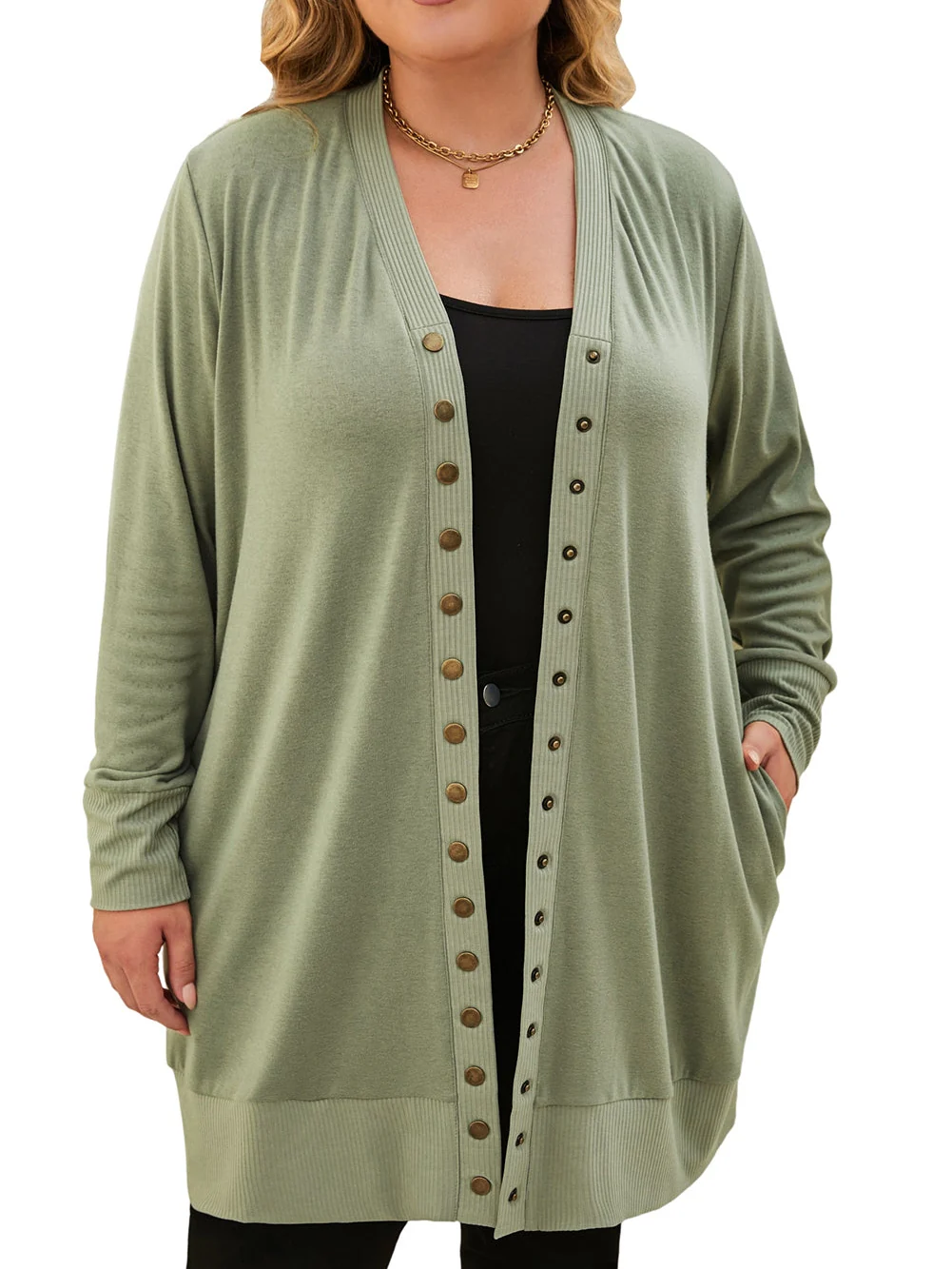 Green V-Neck Plus Size Snap Button Cardigan with Pockets