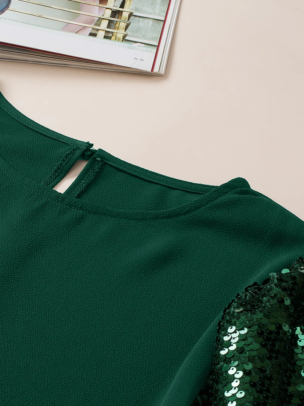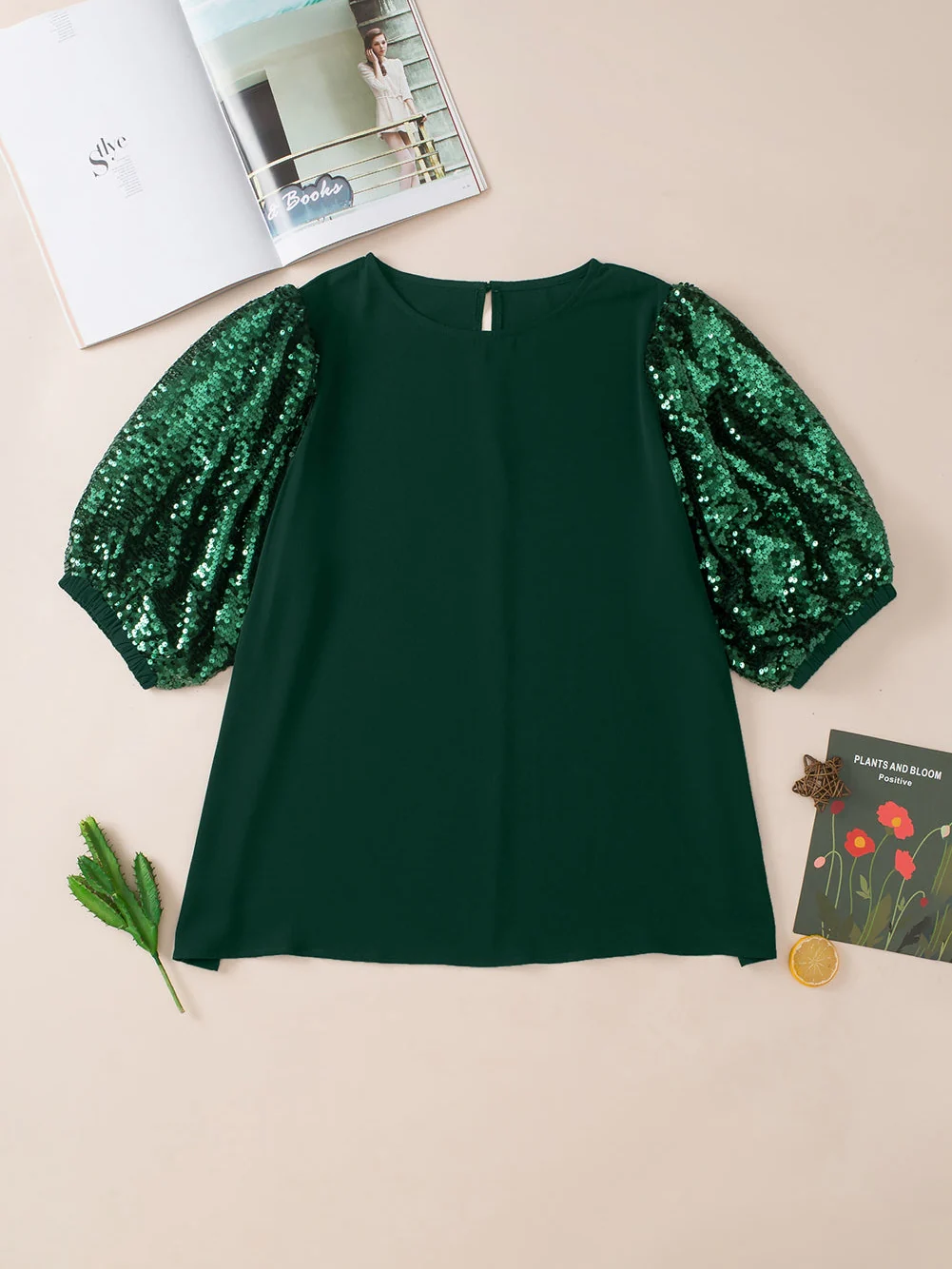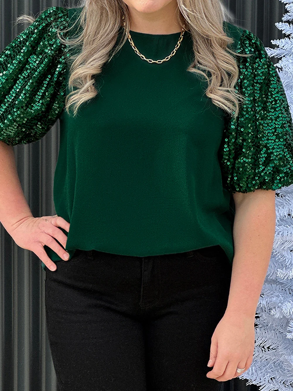 Blackish Green Plus Size Sequin Short Puff Sleeve Top