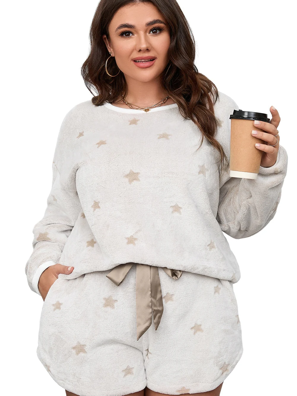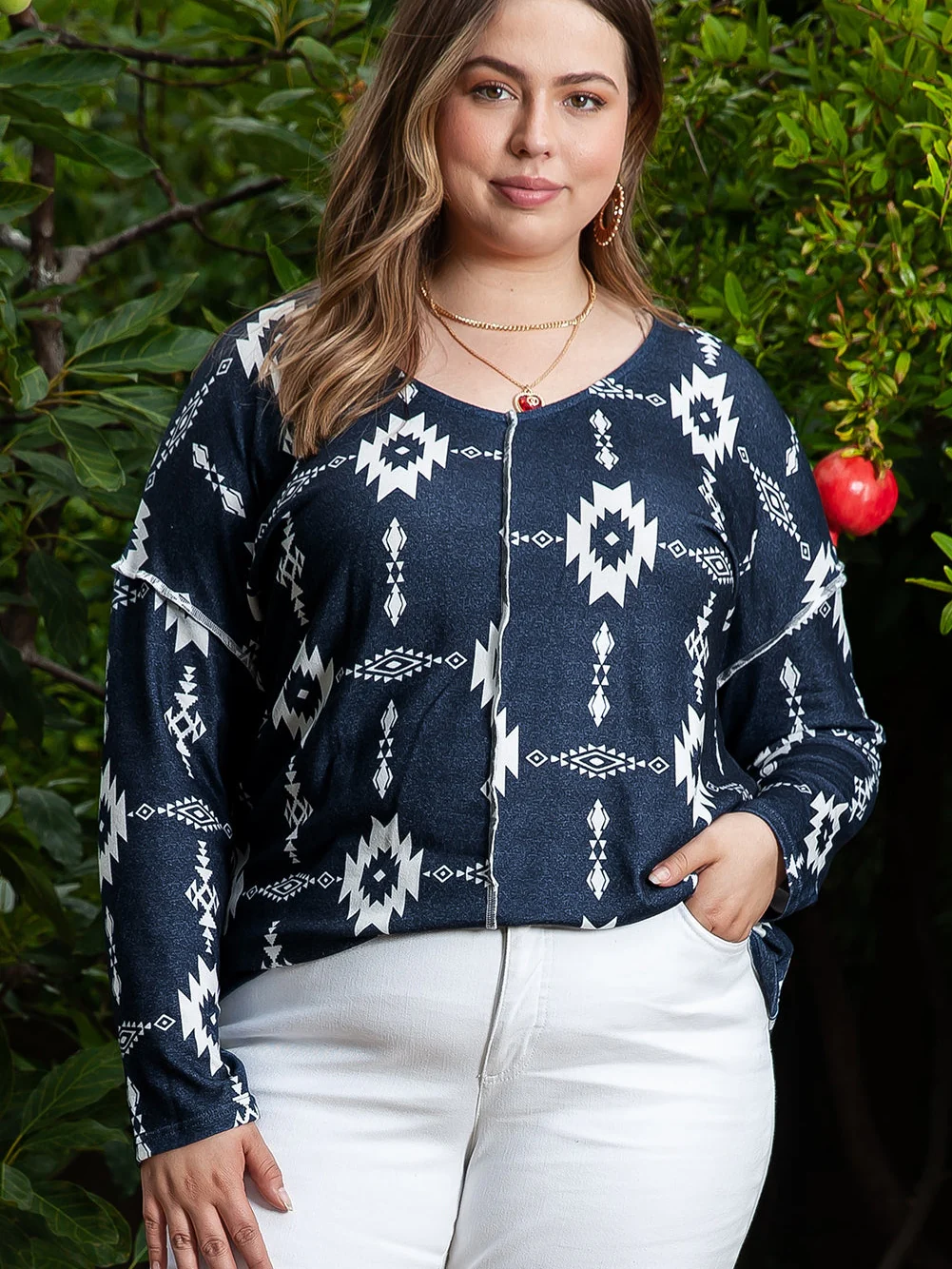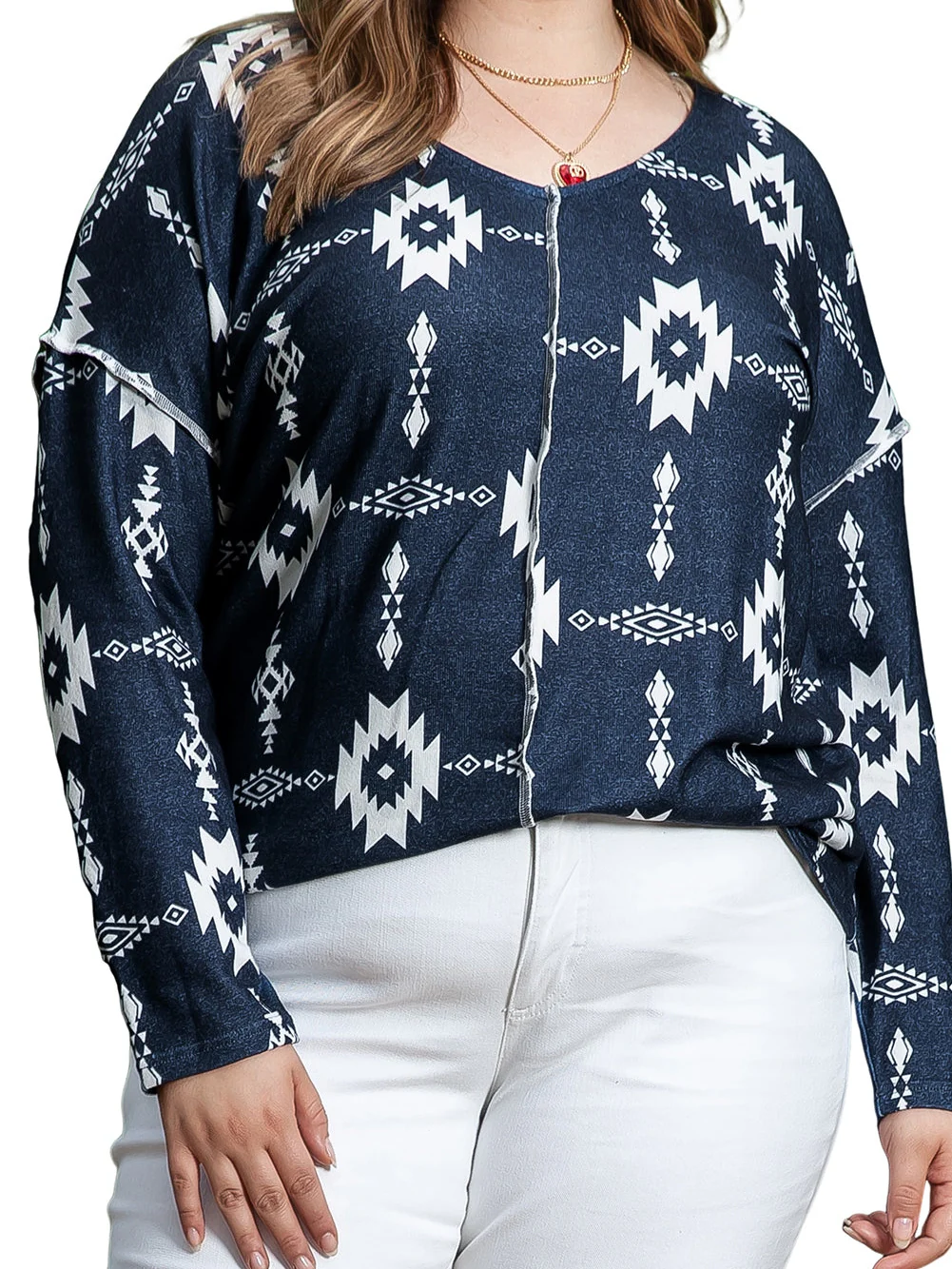 Cozy Grey Aztec Print V-Neck Plus Size Top