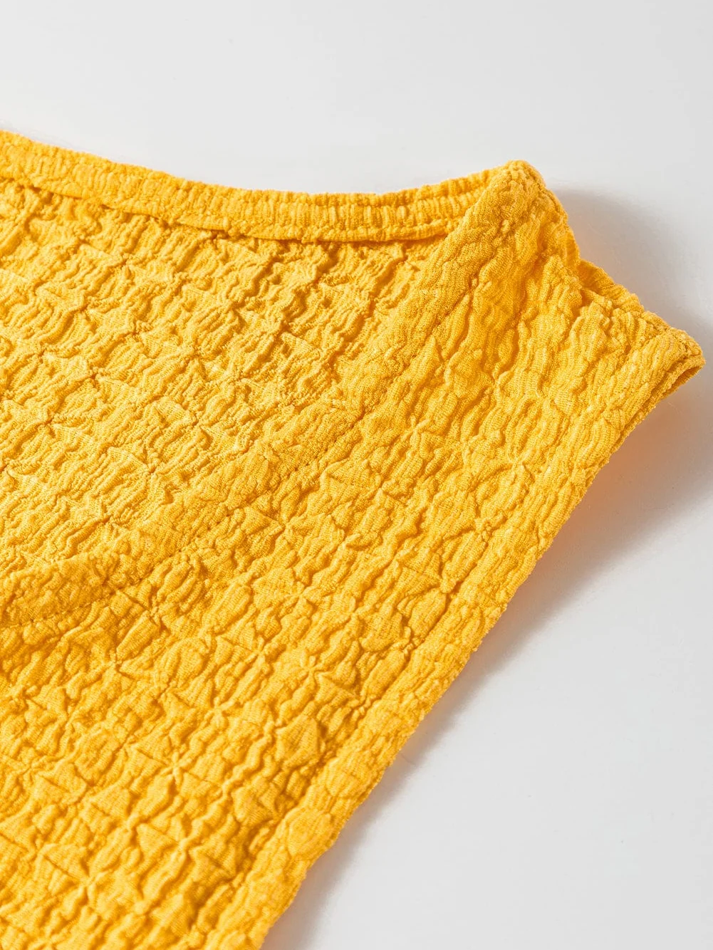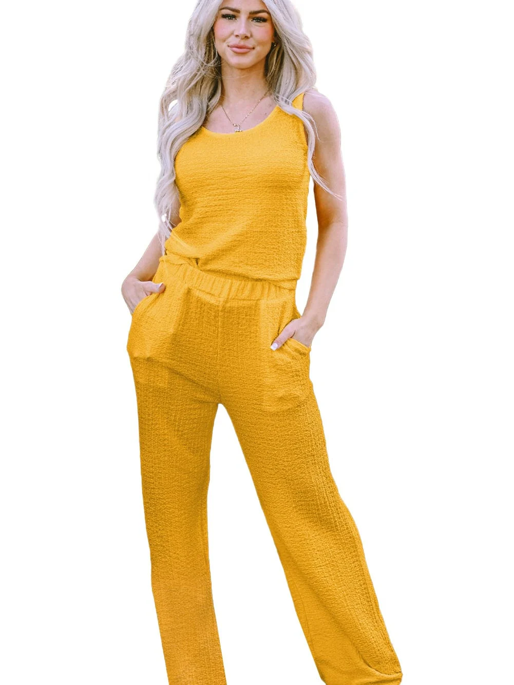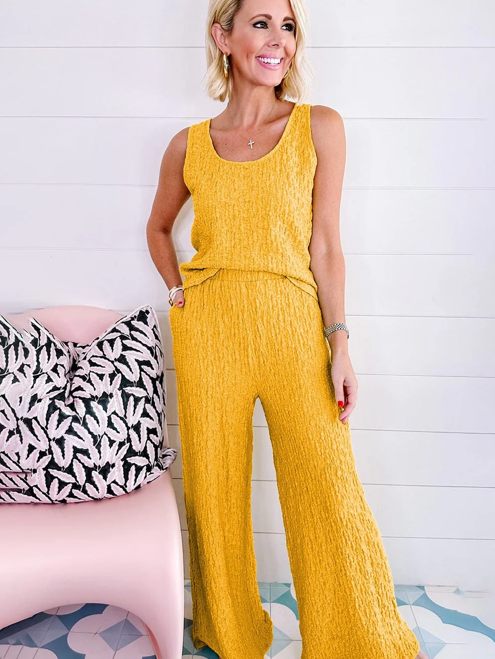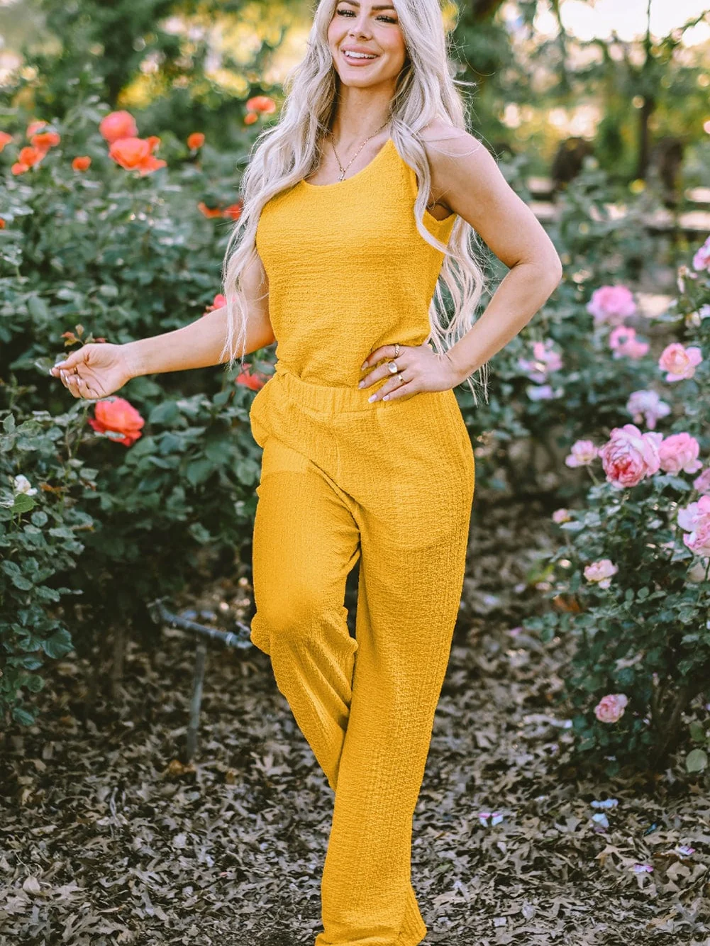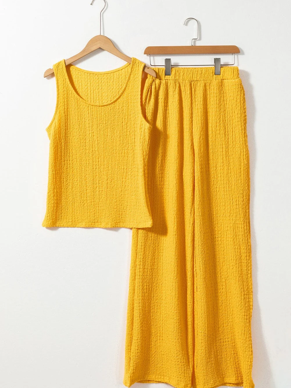 Yellow Crinkle Texture Sleeveless Tank Top and Wide Leg Pants Ensemble