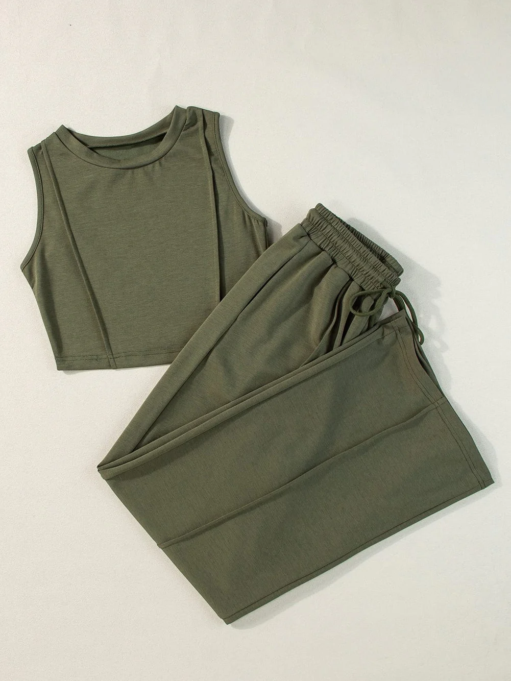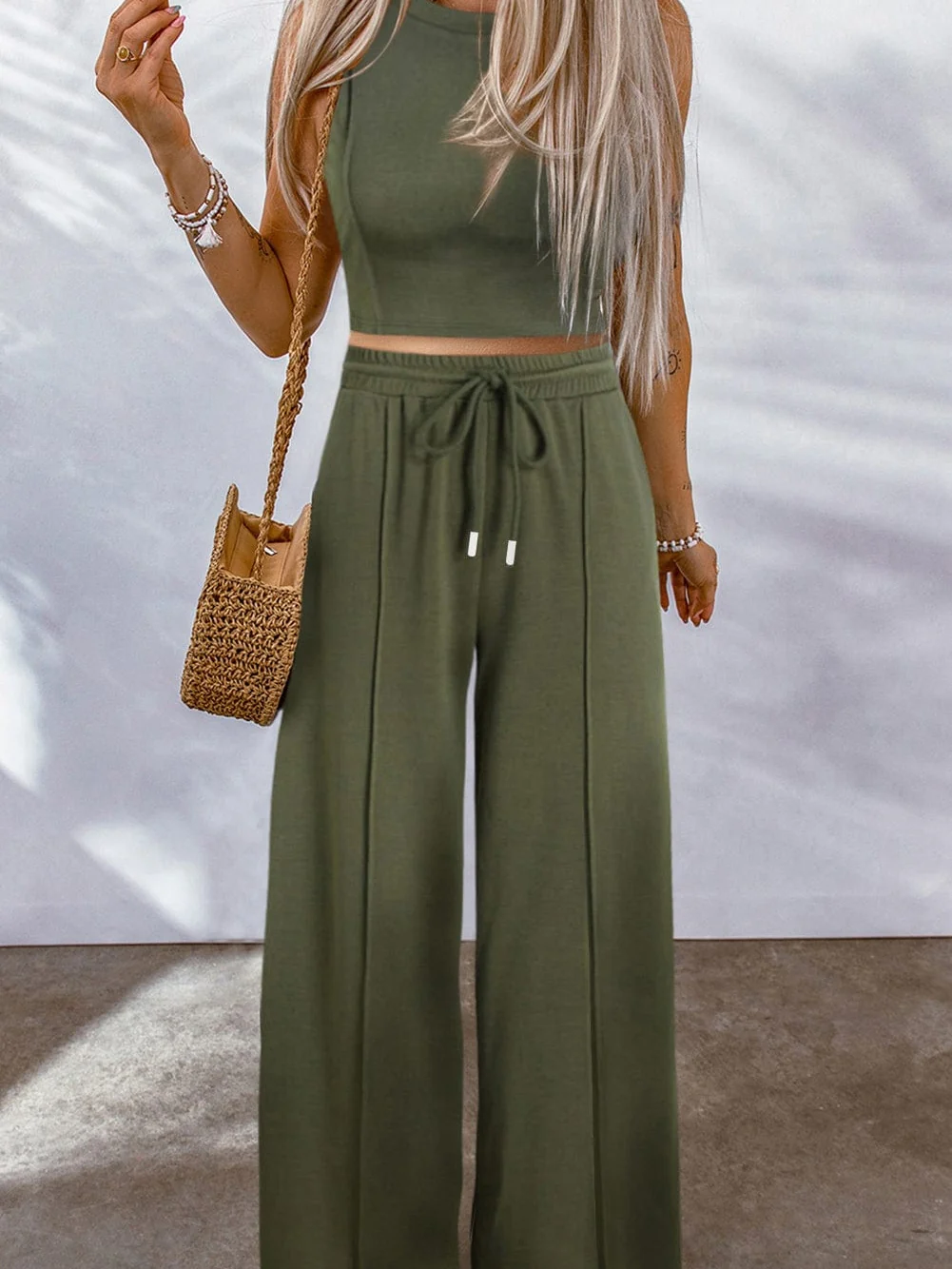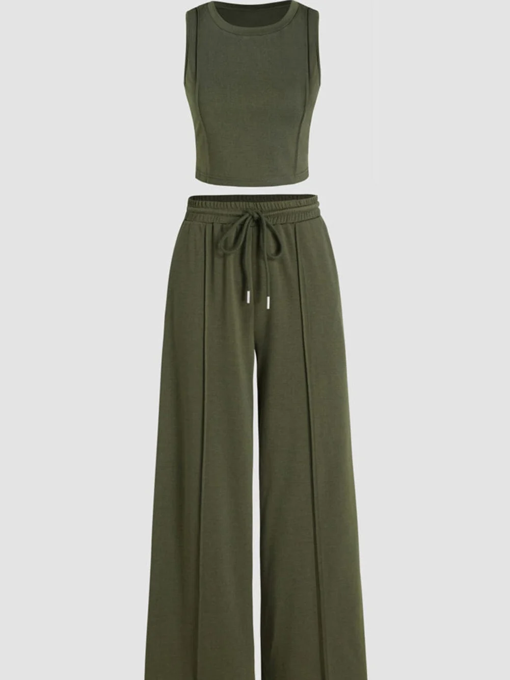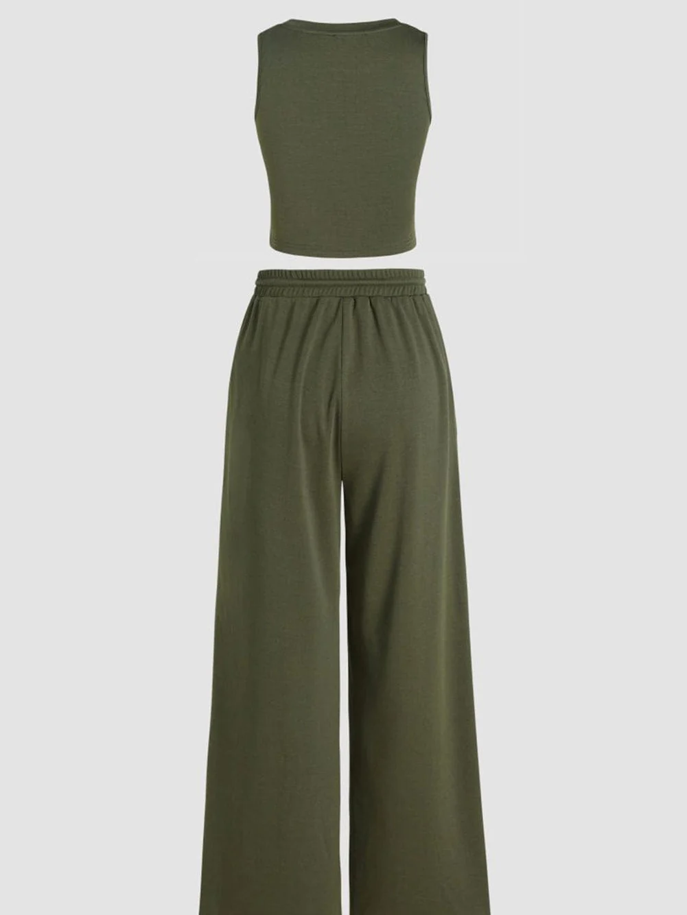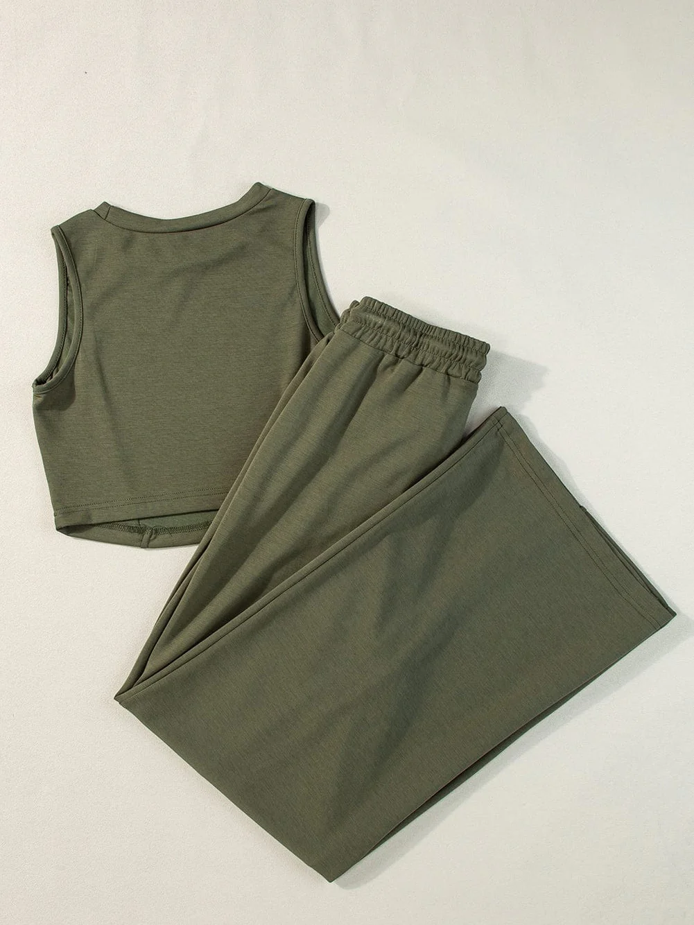 Jungle Green Chic Sleeveless Top and Wide Leg Pants Set