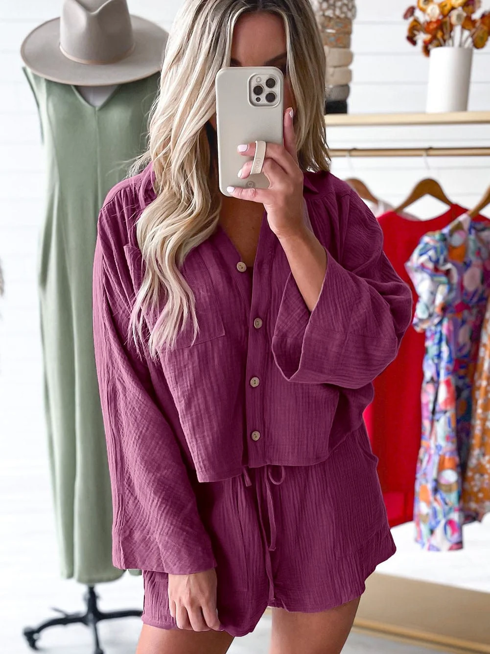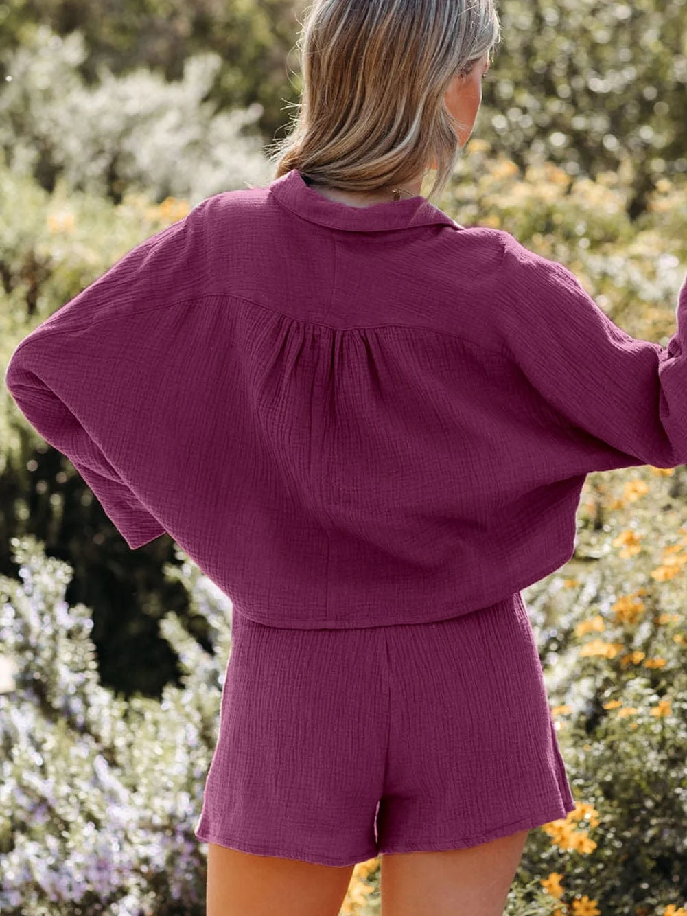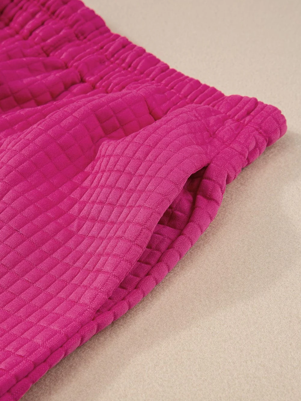 Pink Crinkled Square Neck Puff Sleeve Top and Shorts Set - Stylish and Cozy