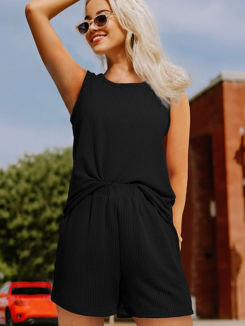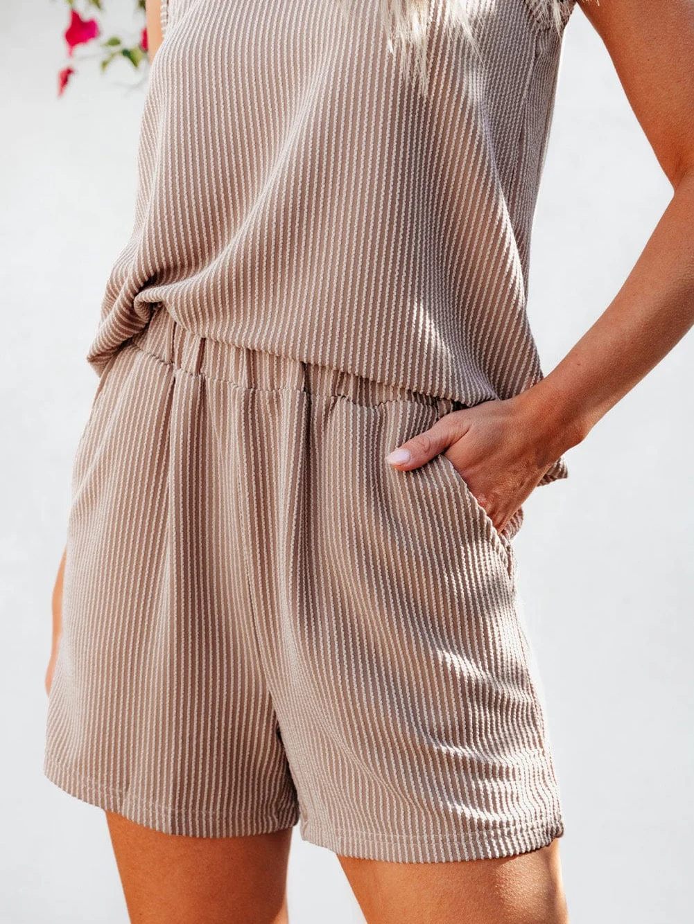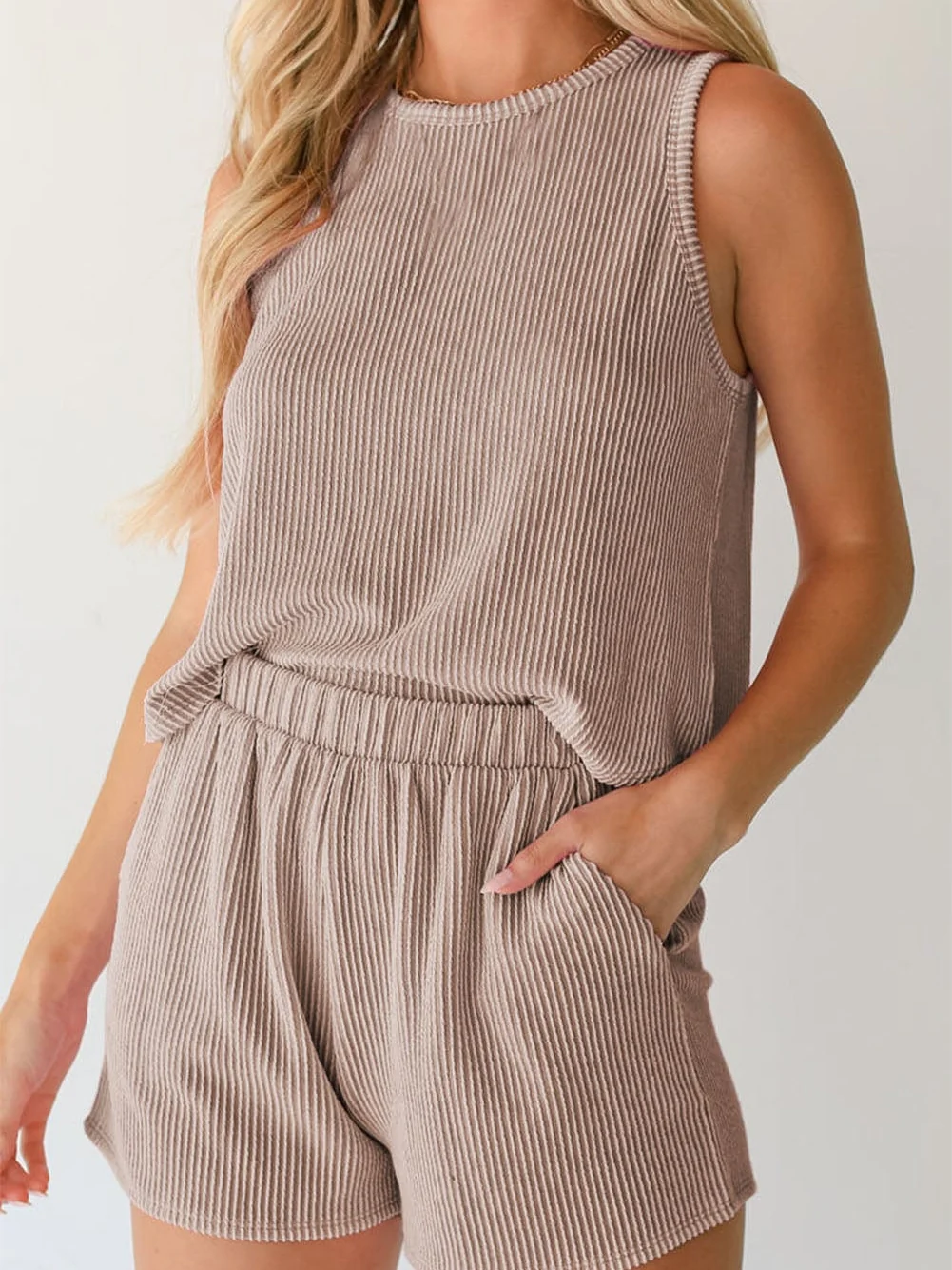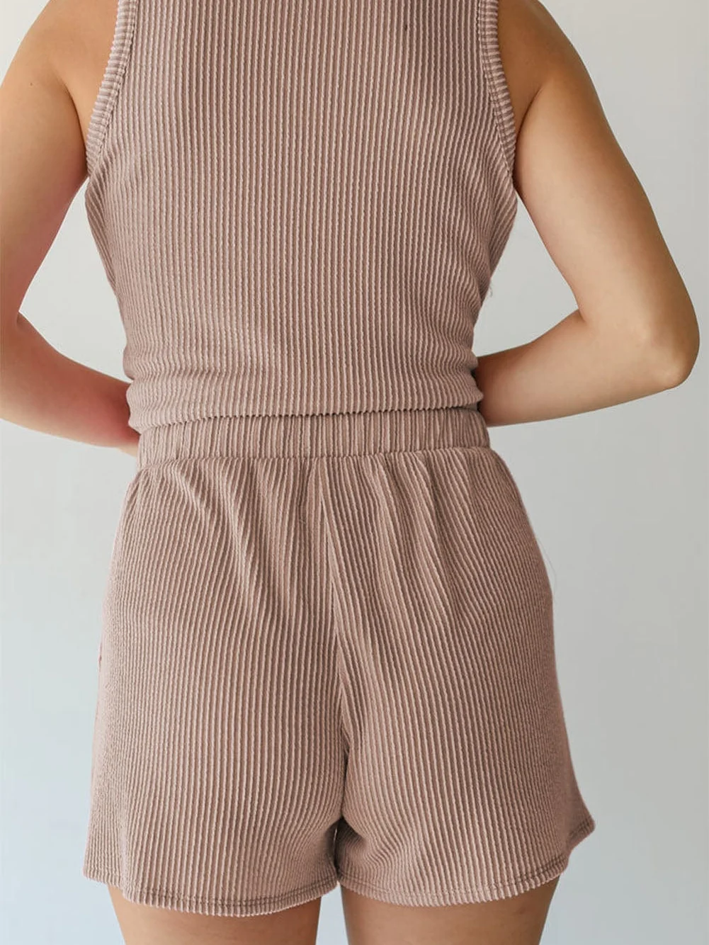 Gray Ribbed Sleeveless Top and Shorts Set with Pockets