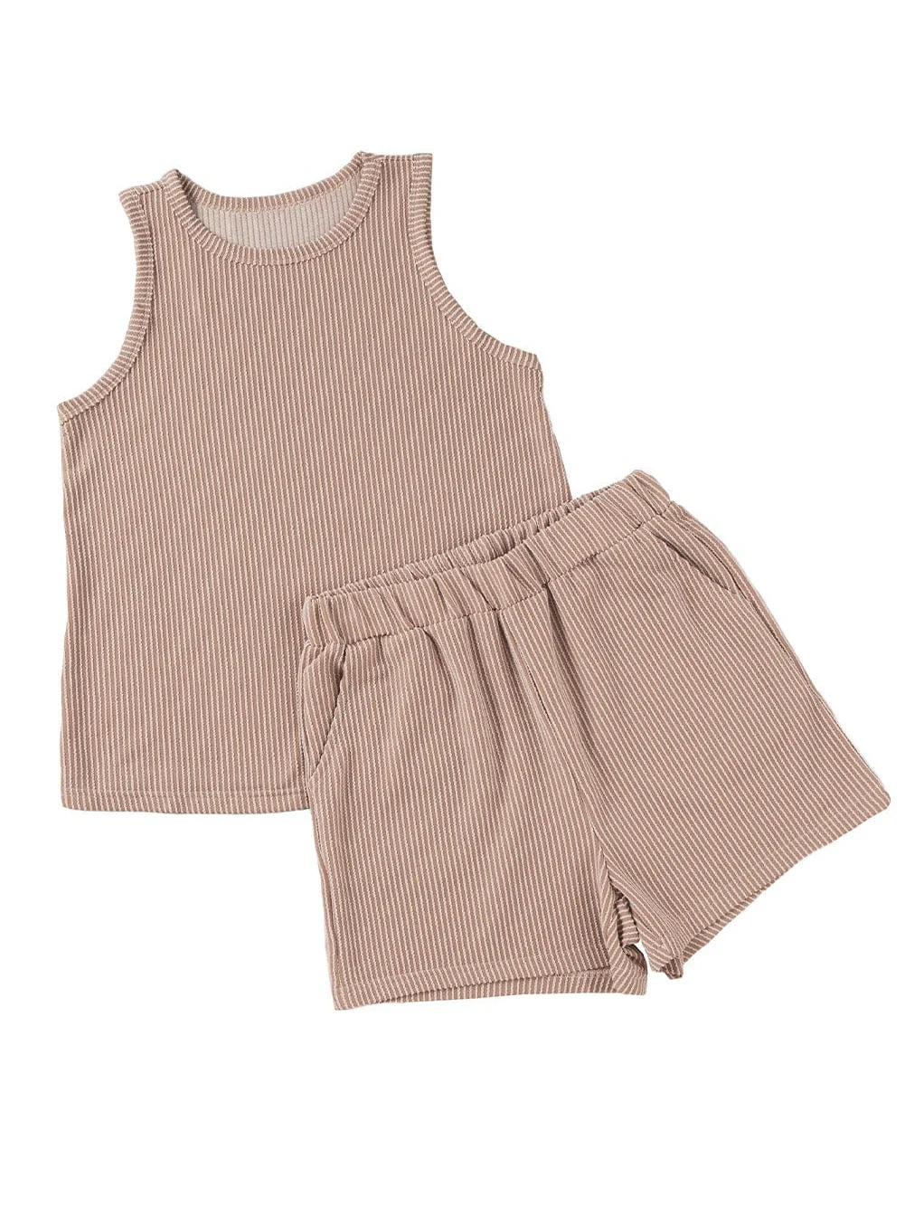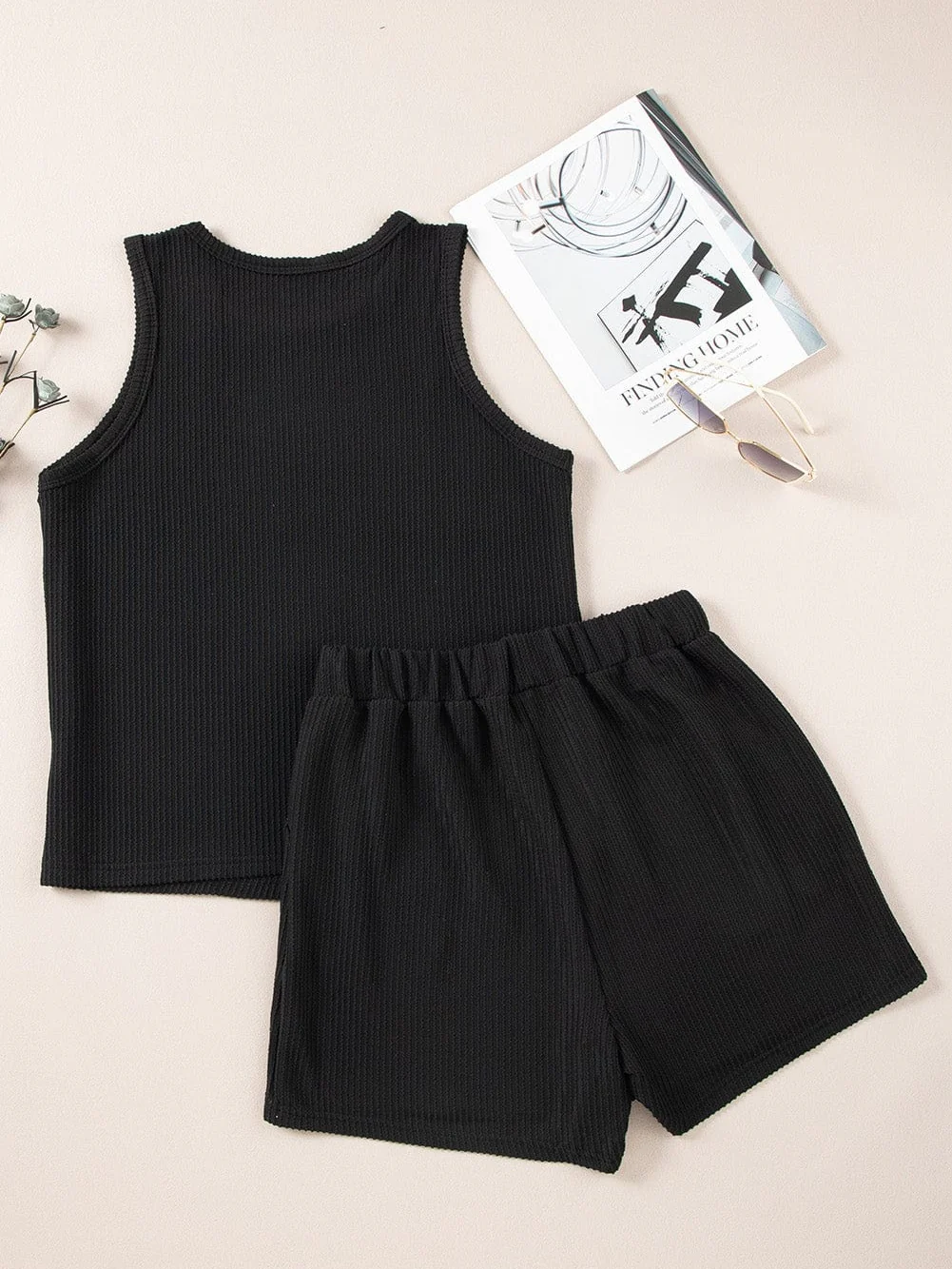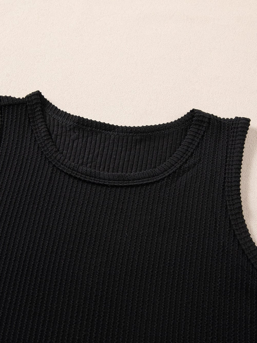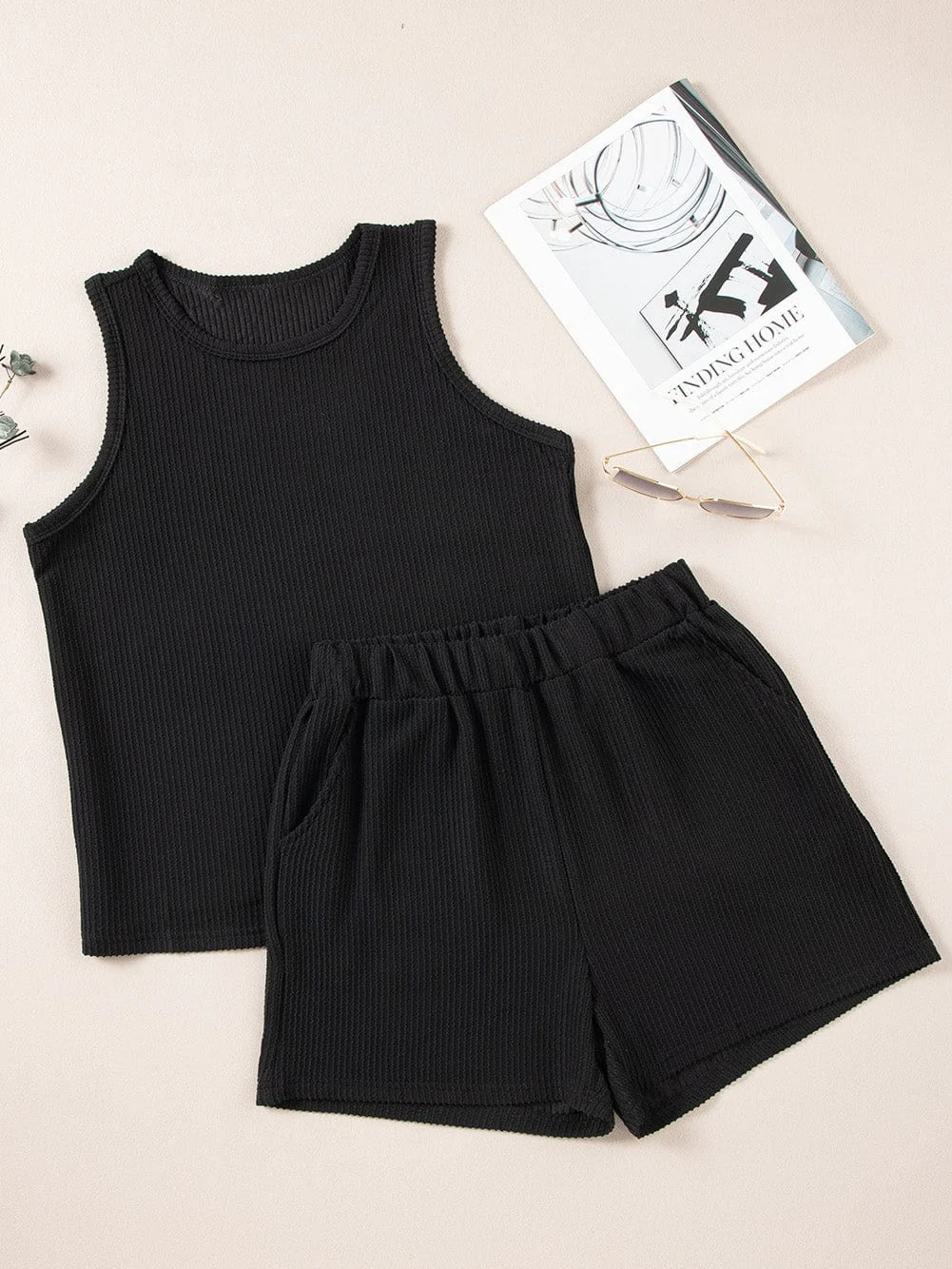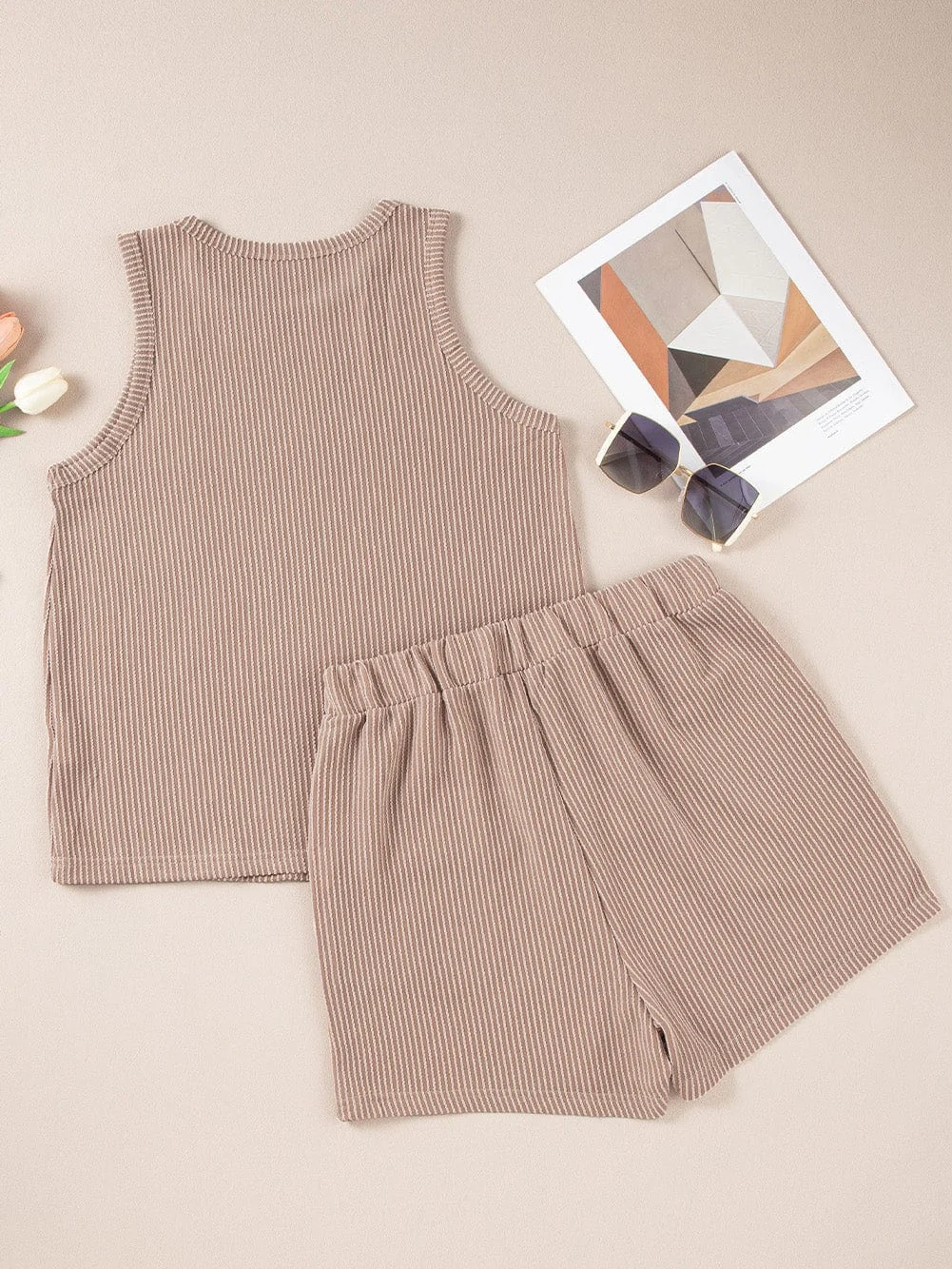Gray Ribbed Sleeveless Top and Shorts Set with Pockets