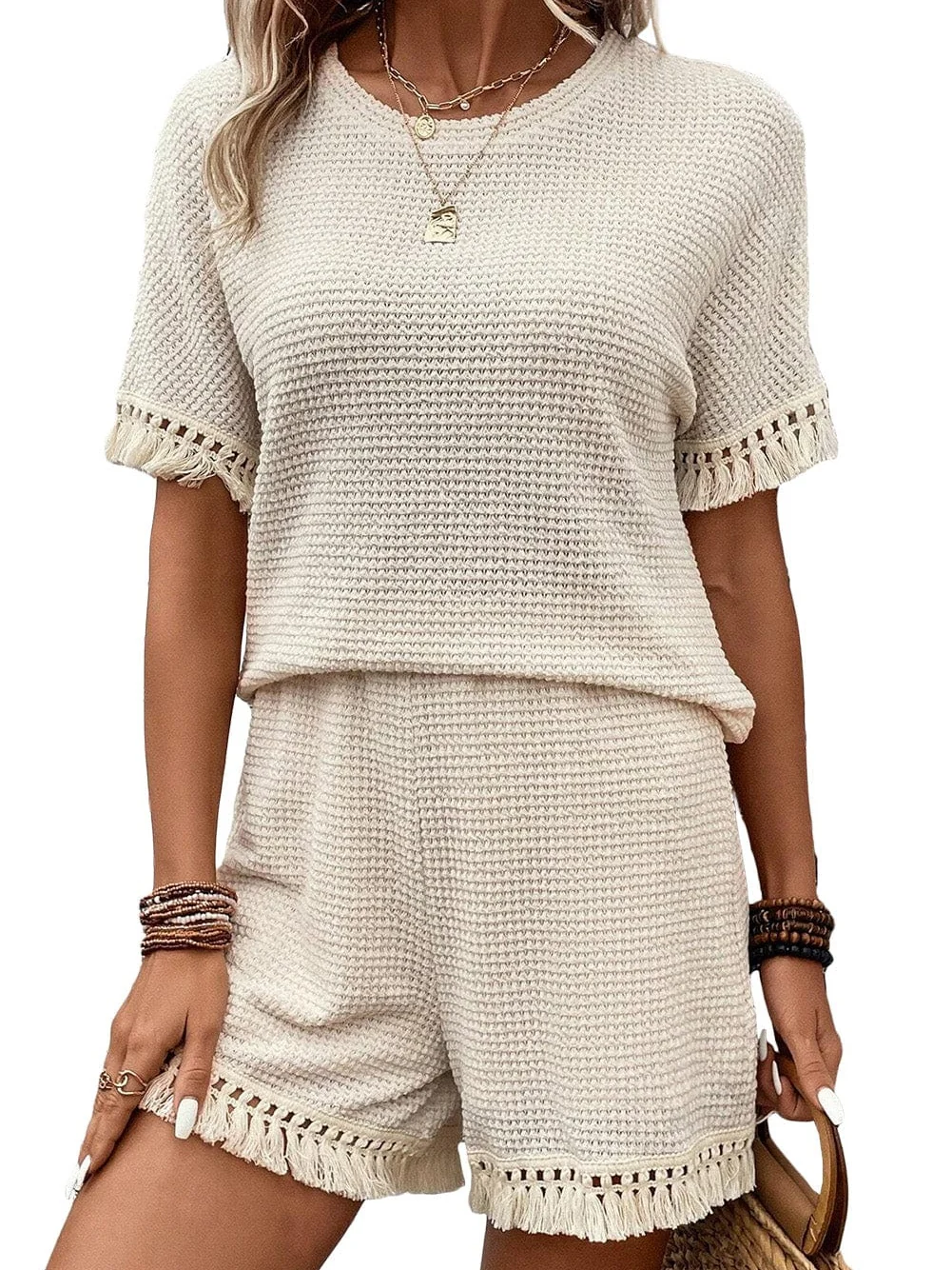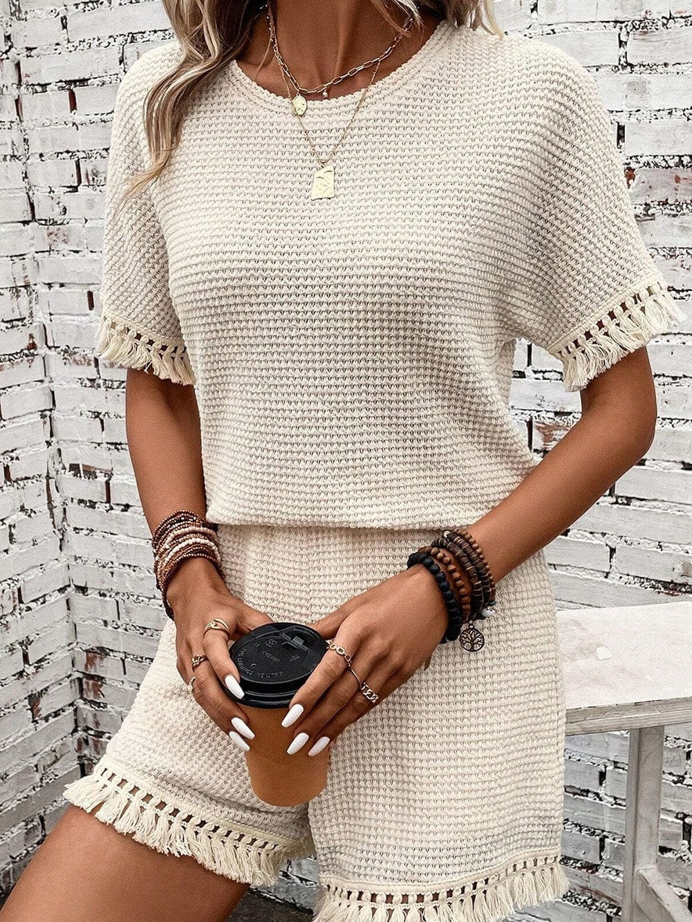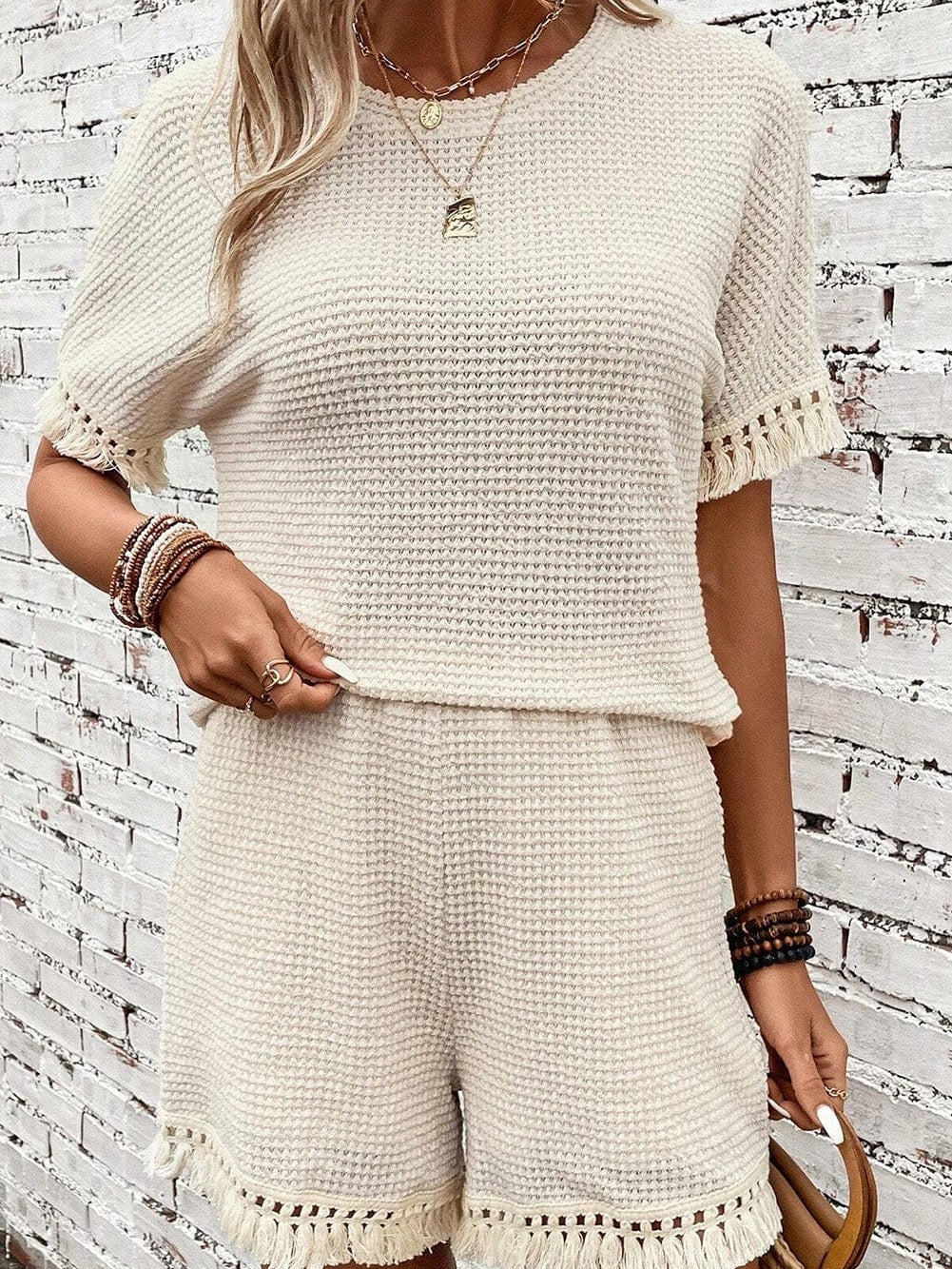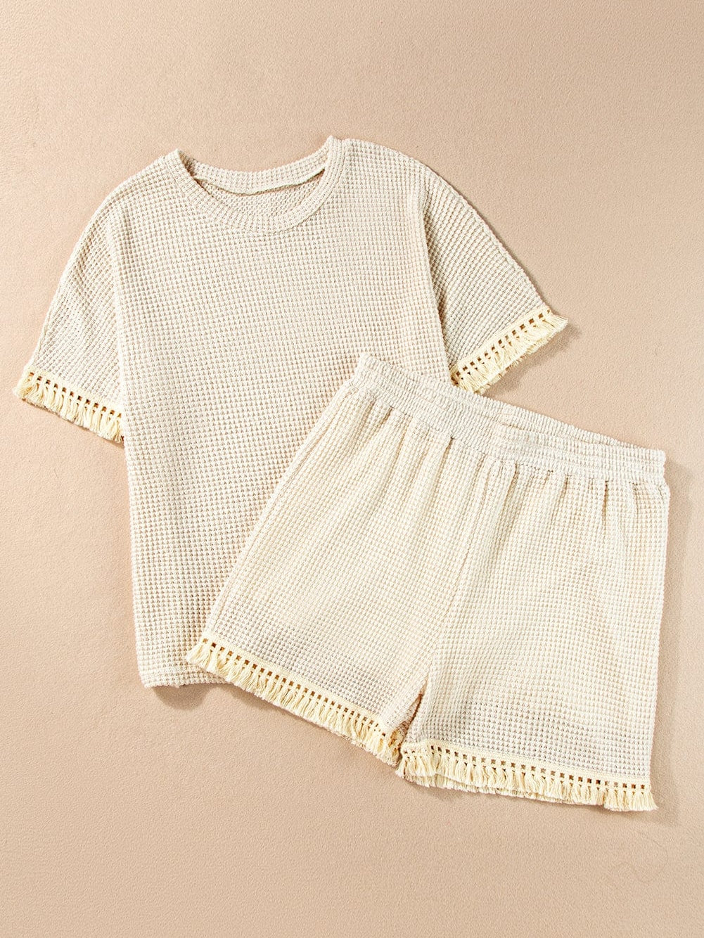 Boho Chic Beige Waffle Knit Fringed Two-Piece Set