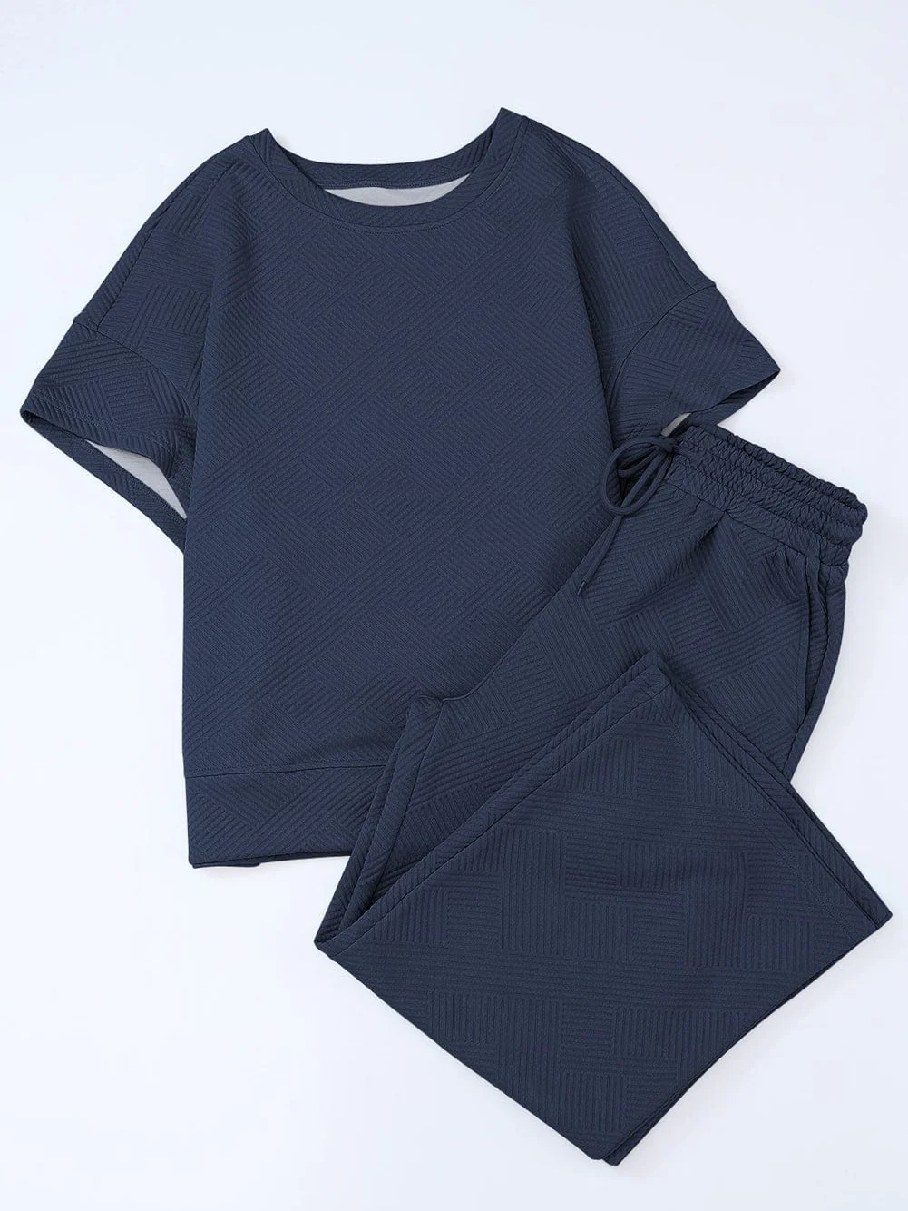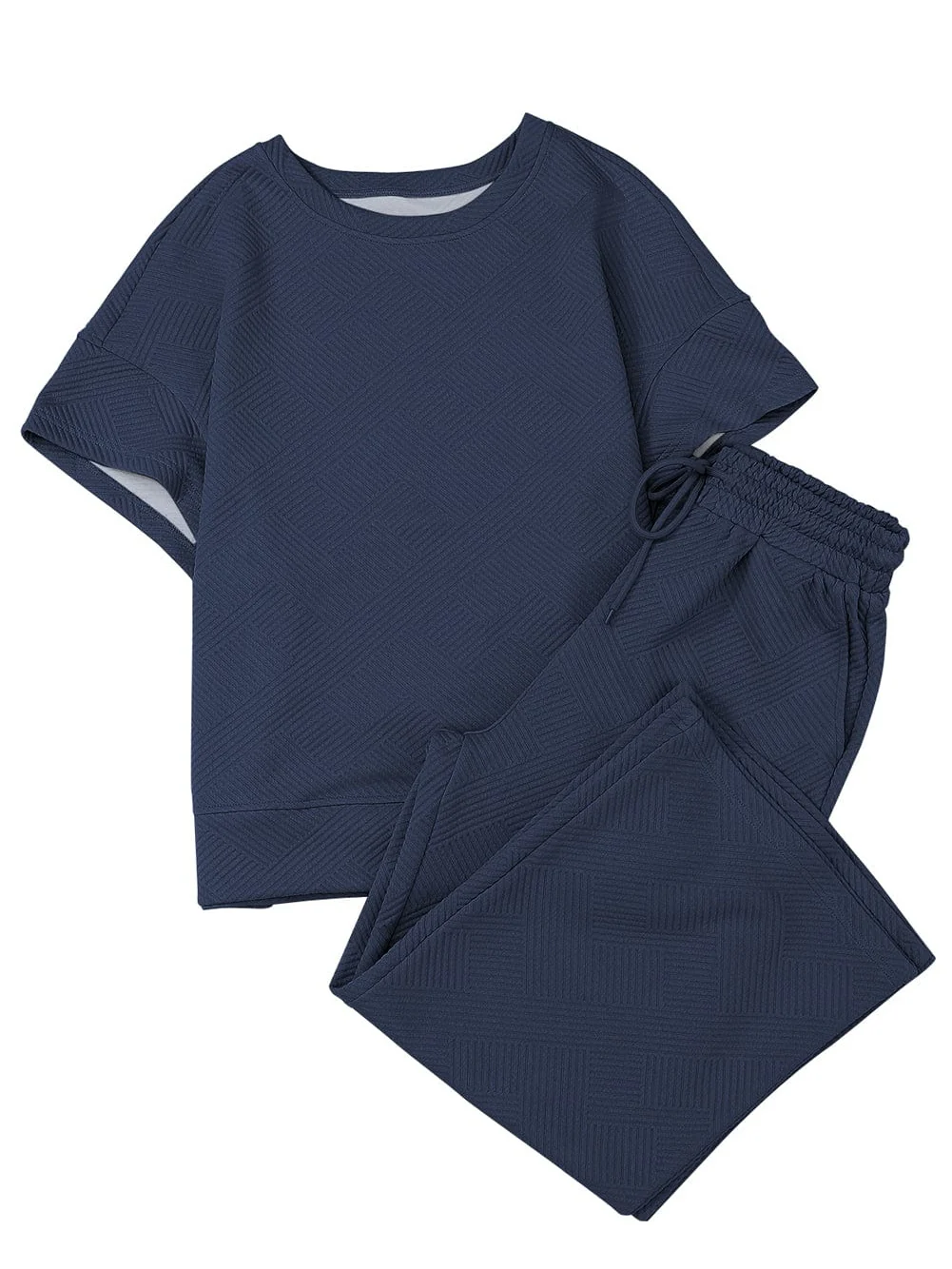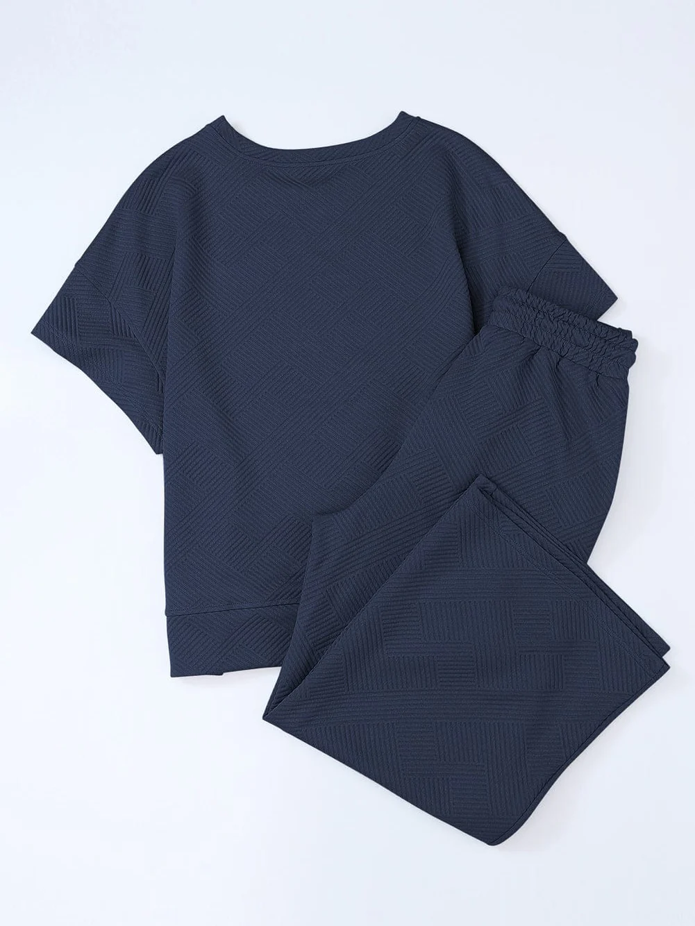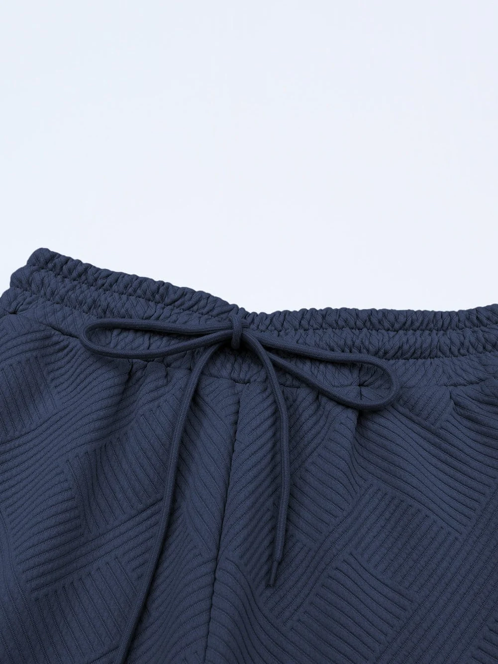 Navy Blue Ribbed Loose Fit Two-Piece Pant Set with Drawstring Waist