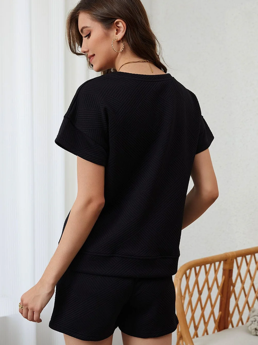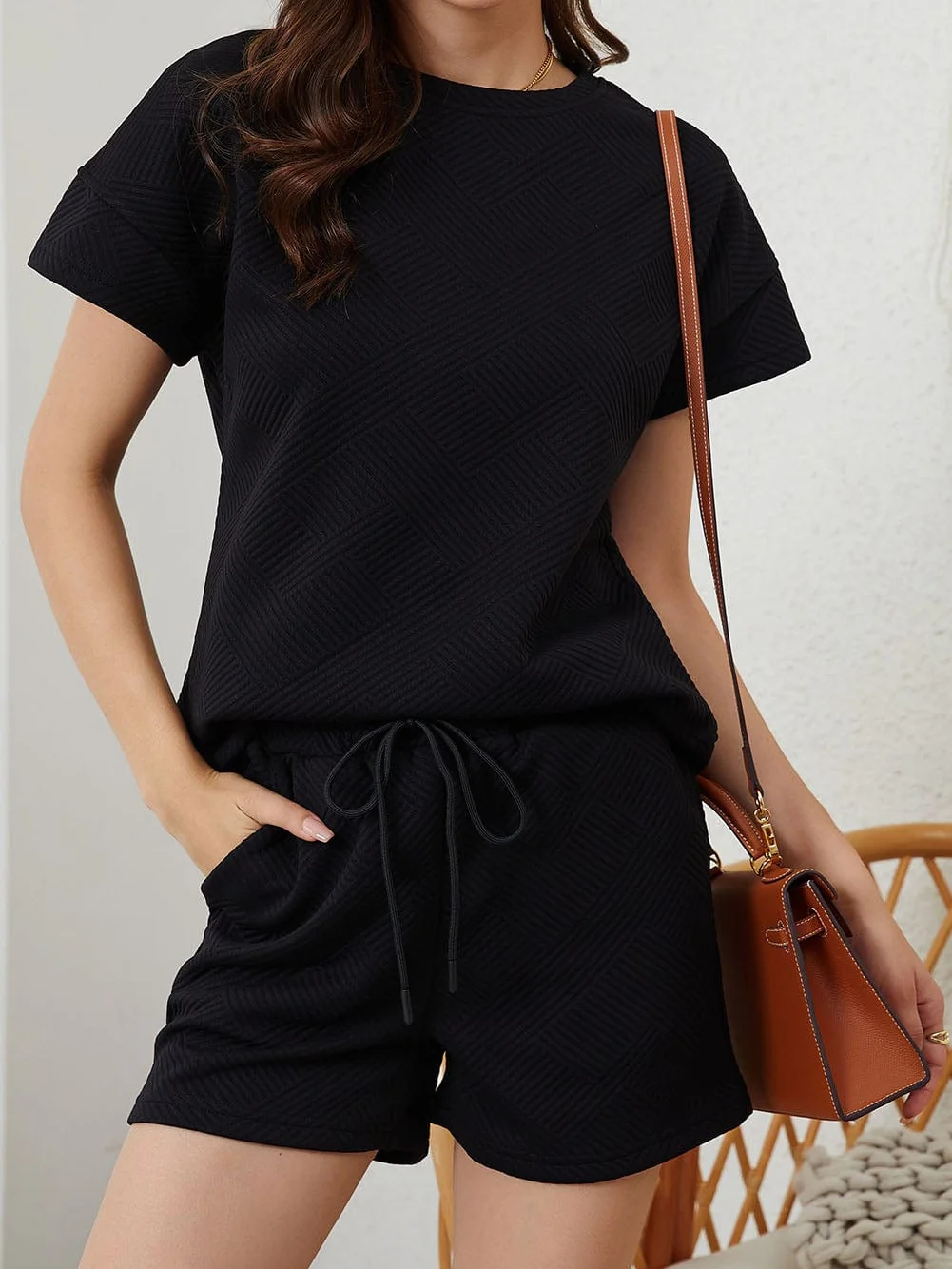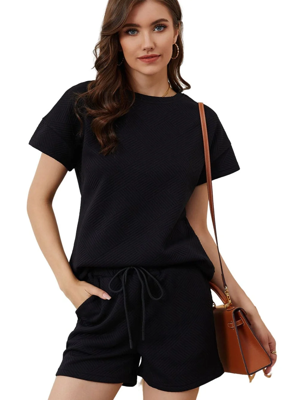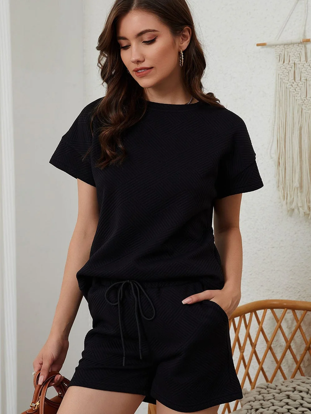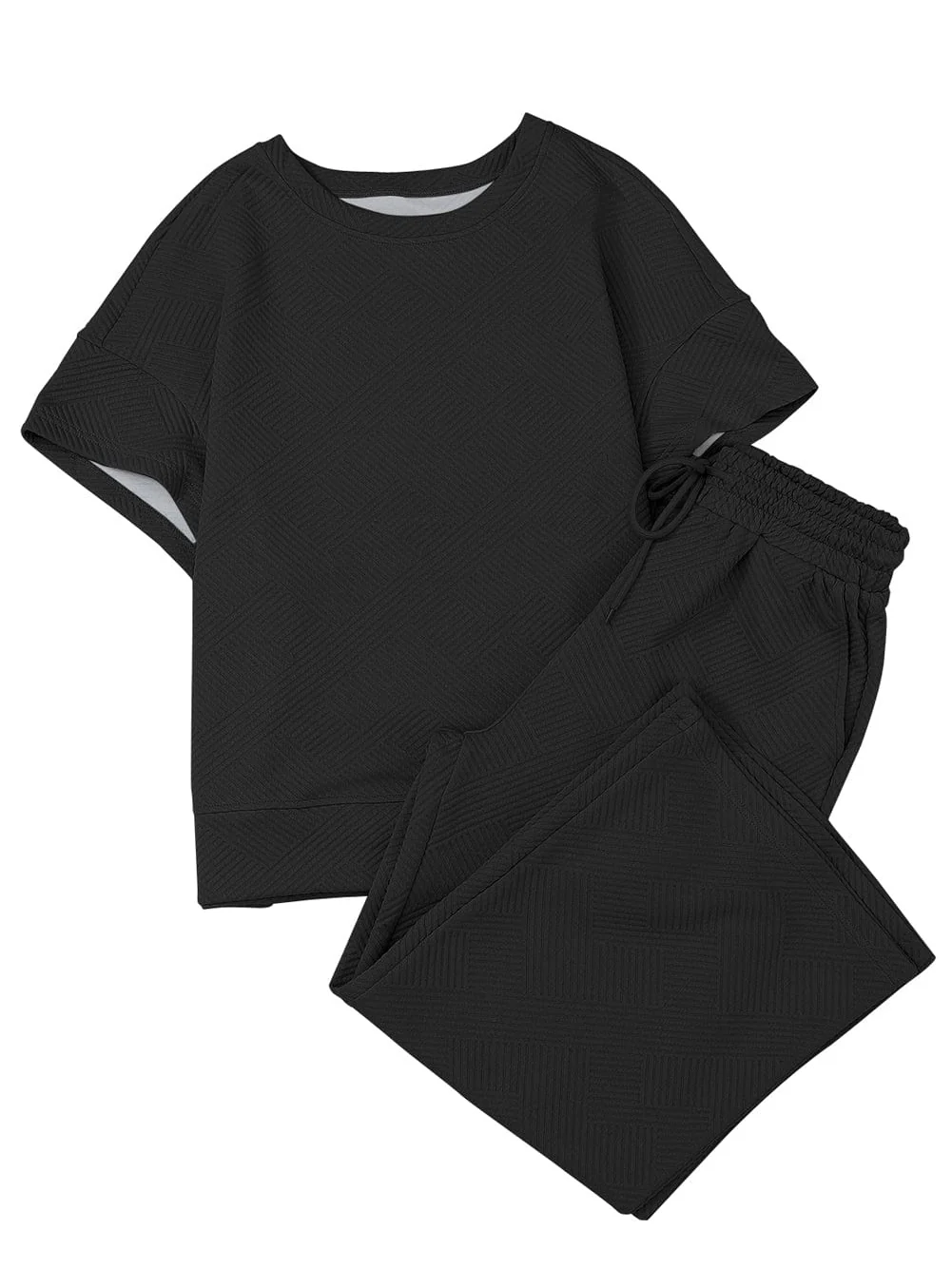 Black Textured Ribbed Two-Piece Set with Drawstring Shorts