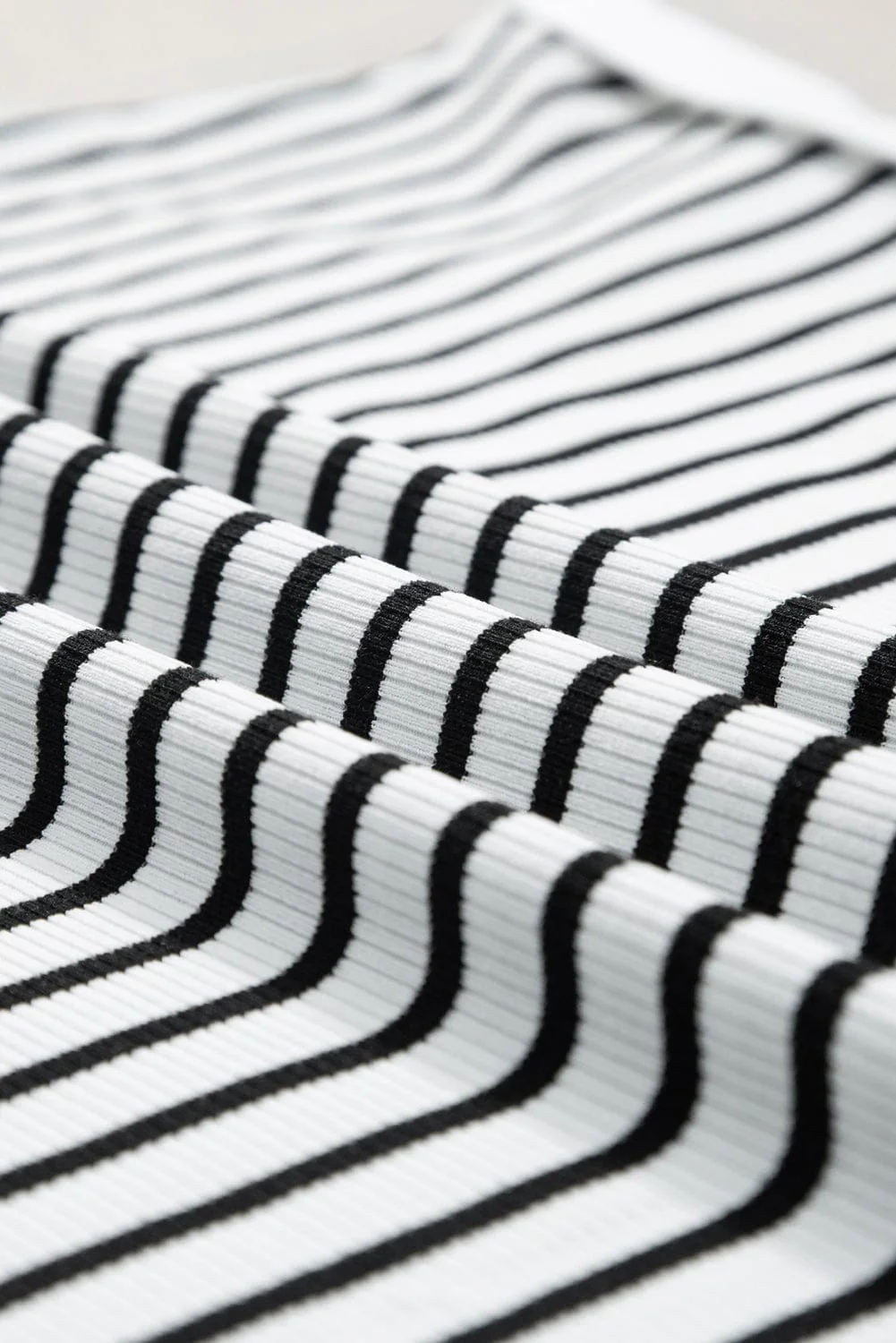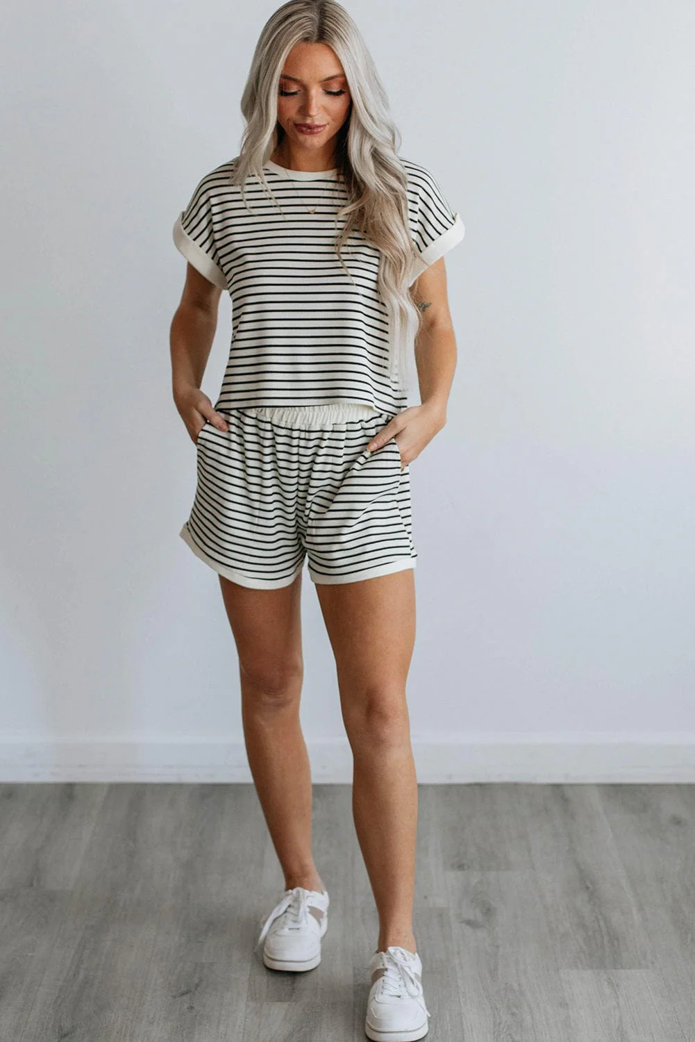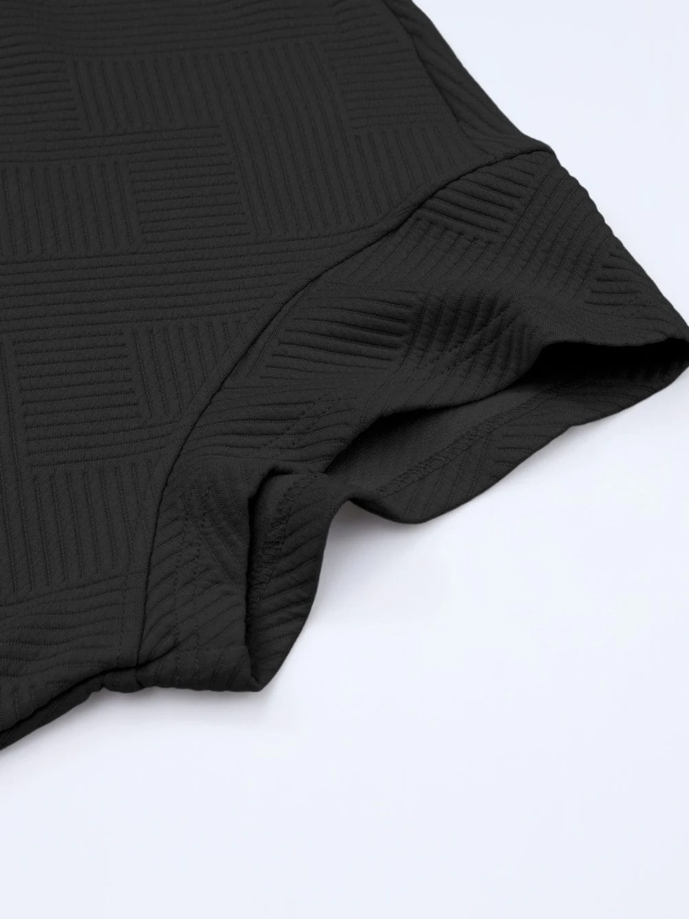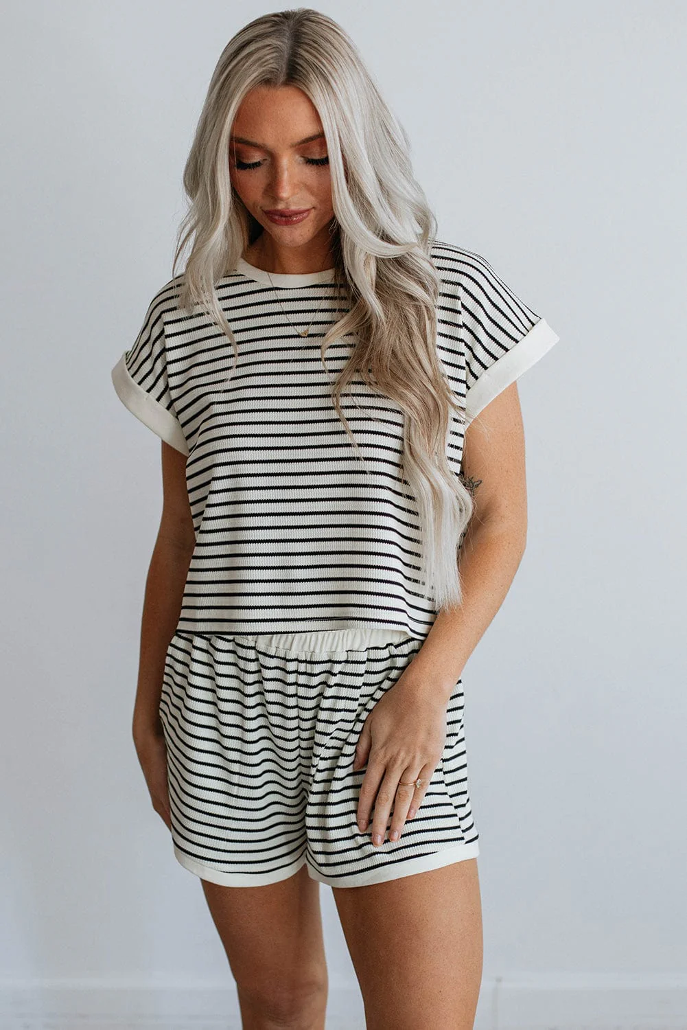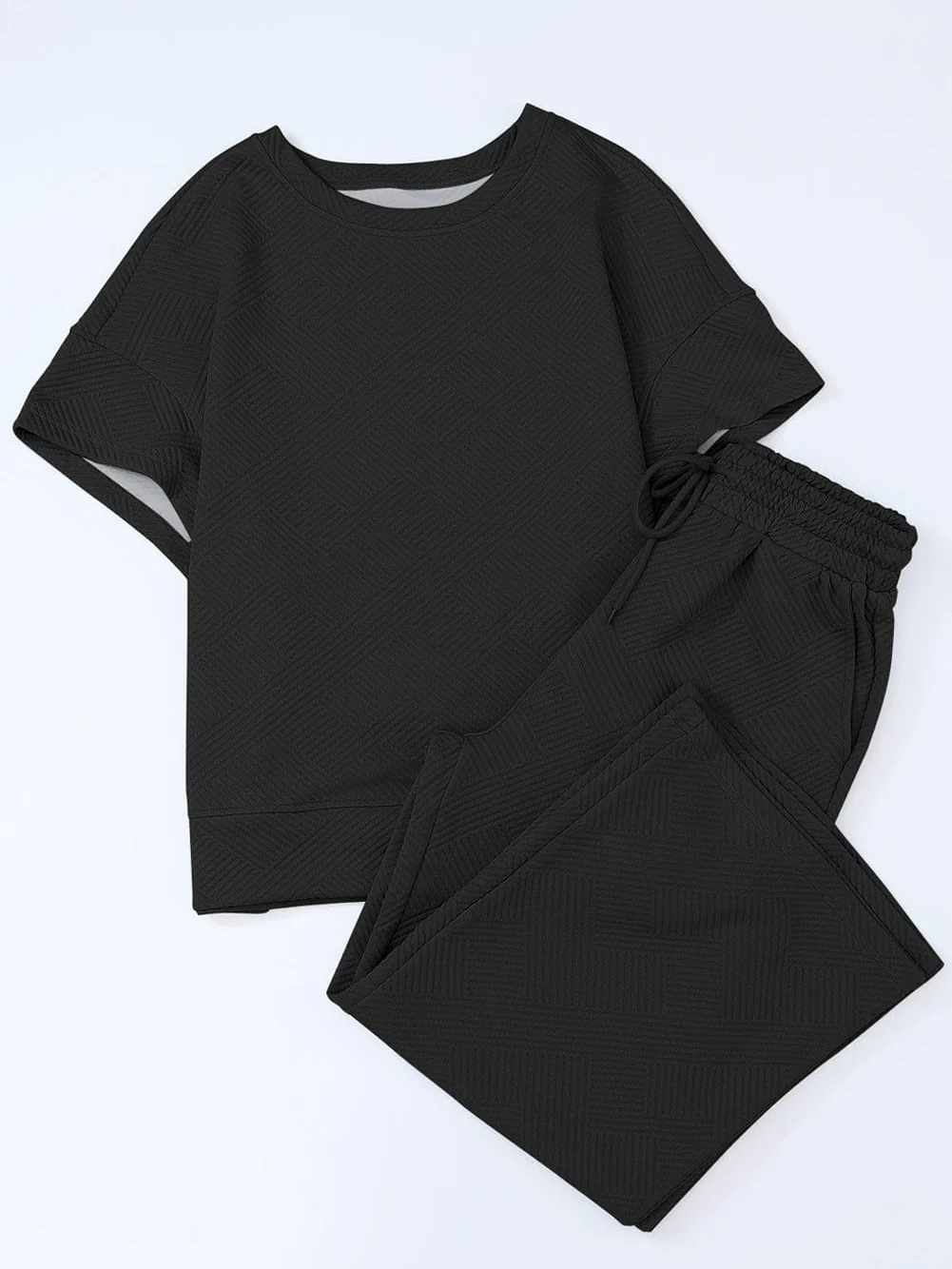 Black Textured Ribbed Two-Piece Set with Drawstring Shorts