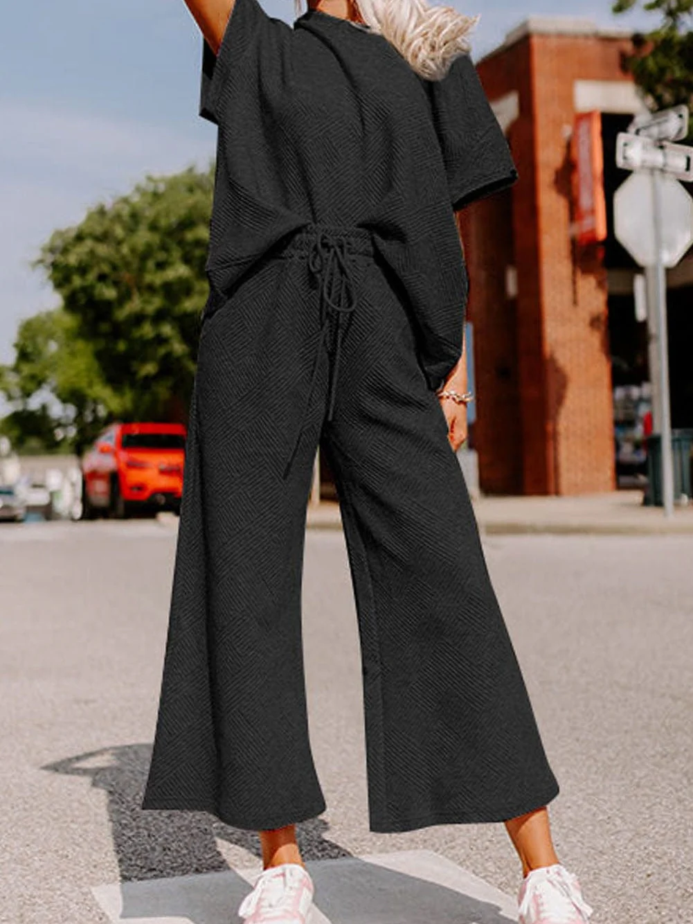 Black Ribbed Casual Lounge Set with Loose Fit Top and Drawstring Pants