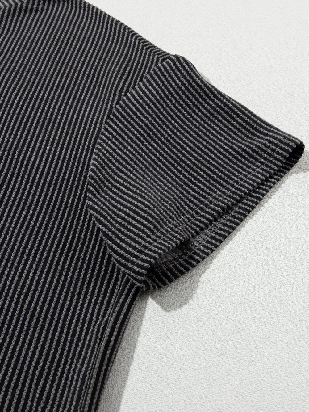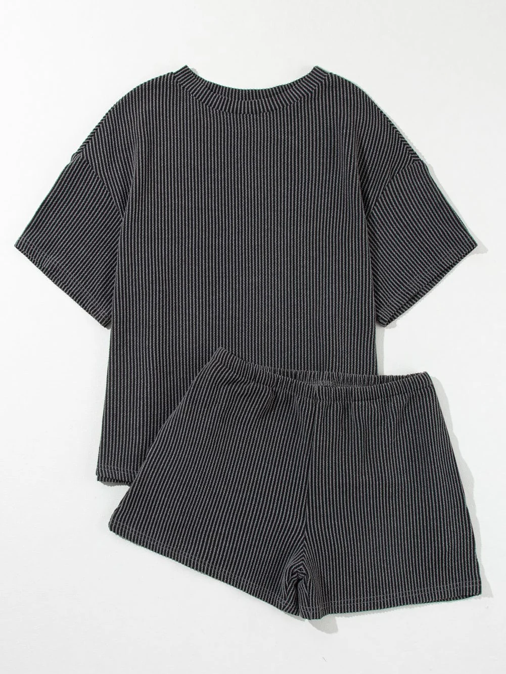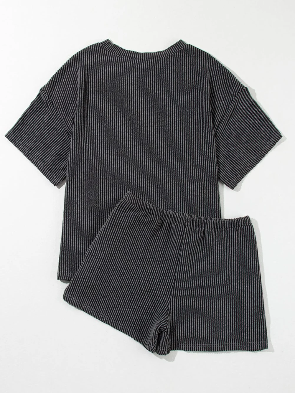 Charcoal Grey Ribbed Textured Knitted Relaxed Fit T-Shirt and Shorts Ensemble